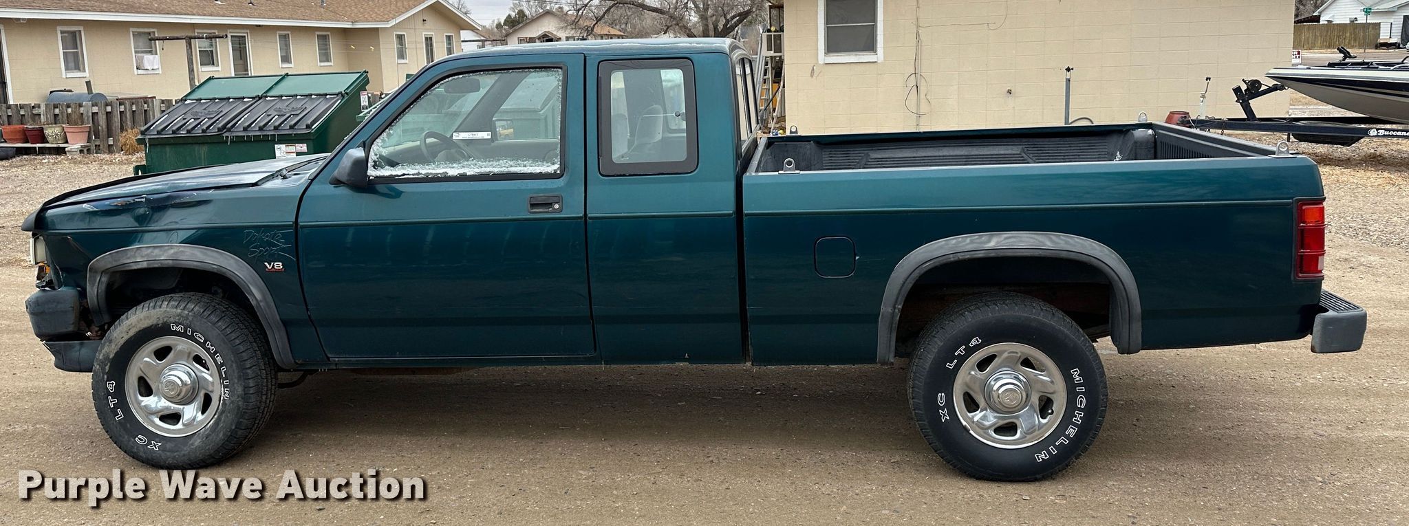 1994 Dodge Dakota Club Cab pickup truck. Miles: 133,779 on odometer, VIN: 1B7GG23YXRW121314. Engine Displacement: 5.2L V8 OHV , Cylinders: 8, Fuel type: Gas. Transmission Manual, Speed: 5, Four wheel drive. Interior AC, Heat, Power windows, Power locks, Cruise control. Tires Size: 235/75R15. Notes Dash warning indicator: ABS, Collision damage, Unit must be towed or hauled. Kansas title. Title distribution may be delayed up to 14 days from verification of funds. 1309 A Street. Garden City, KS 67846