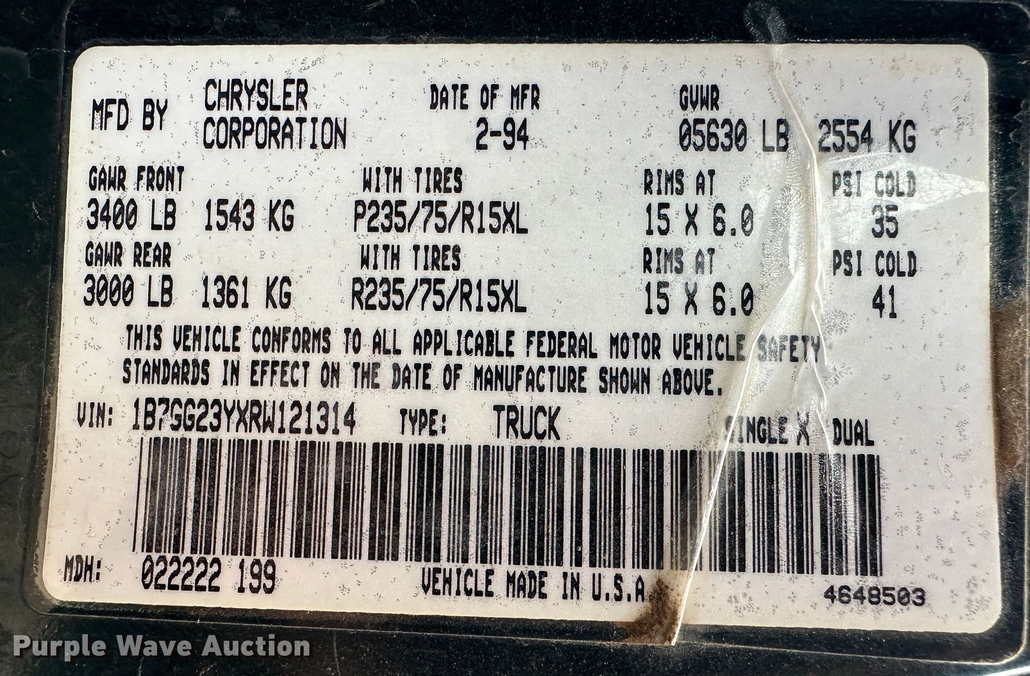 Purple Wave is selling a used Compact Pickup or Van in Kansas. This item is a 1994 Dodge Dakota Club Cab pickup truck with the following: Miles: 133,779 on odometer, VIN: 1B7GG23YXRW121314