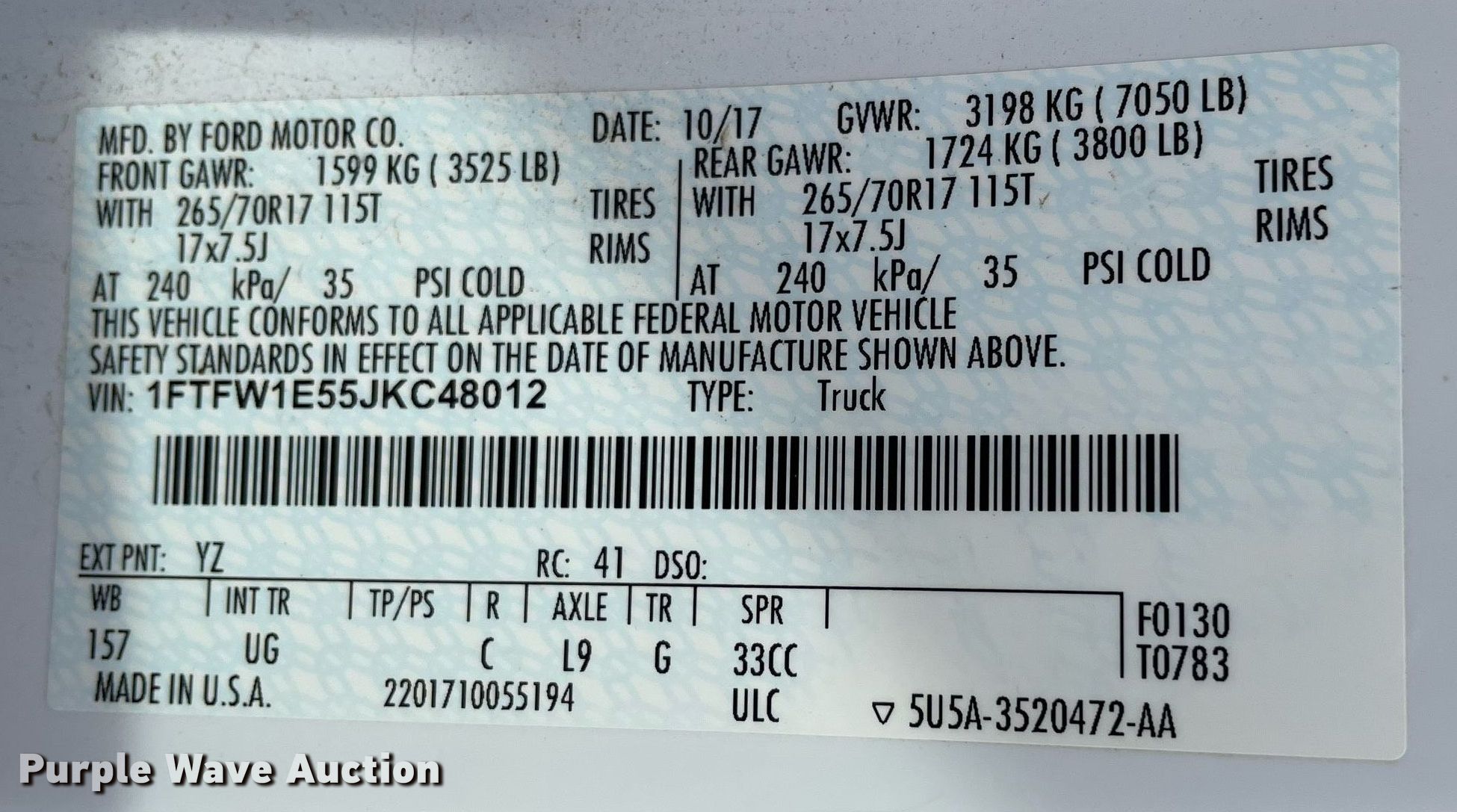 Purple Wave is selling a used 1/2 Ton Pickup or Van in Illinois. This item is a 2018 Ford F150 XLT SuperCrew pickup truck with the following: Miles: 205,292 on odometer, Hours: 7,064 on meter, VIN: 1FTFW1E55JKC48012
