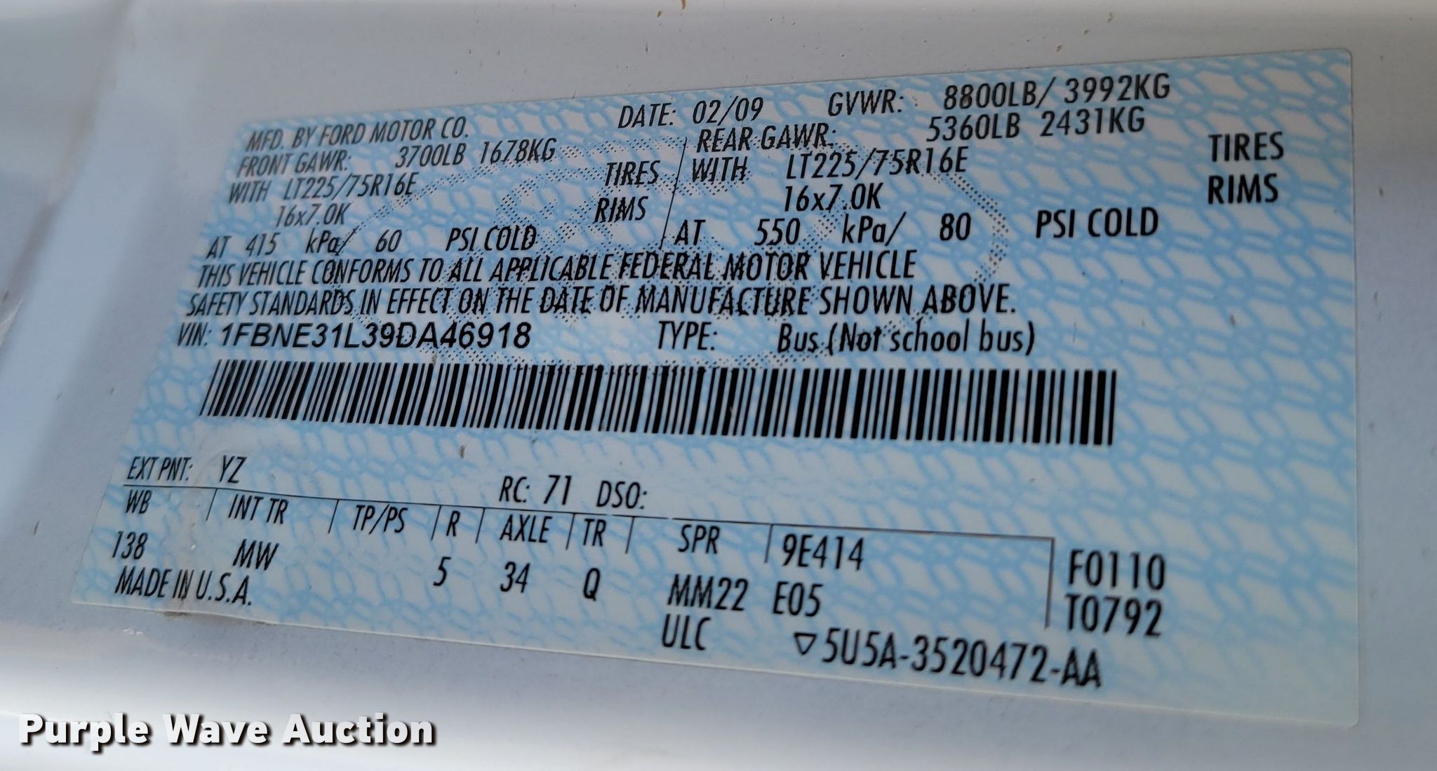 Purple Wave is selling a used 3/4 or 1 Ton Pickup or Van in Nebraska. This item is a 2009 Ford E350 Super Duty XLT van with the following: Miles: Unknown, VIN: 1FBNE31L39DA46918