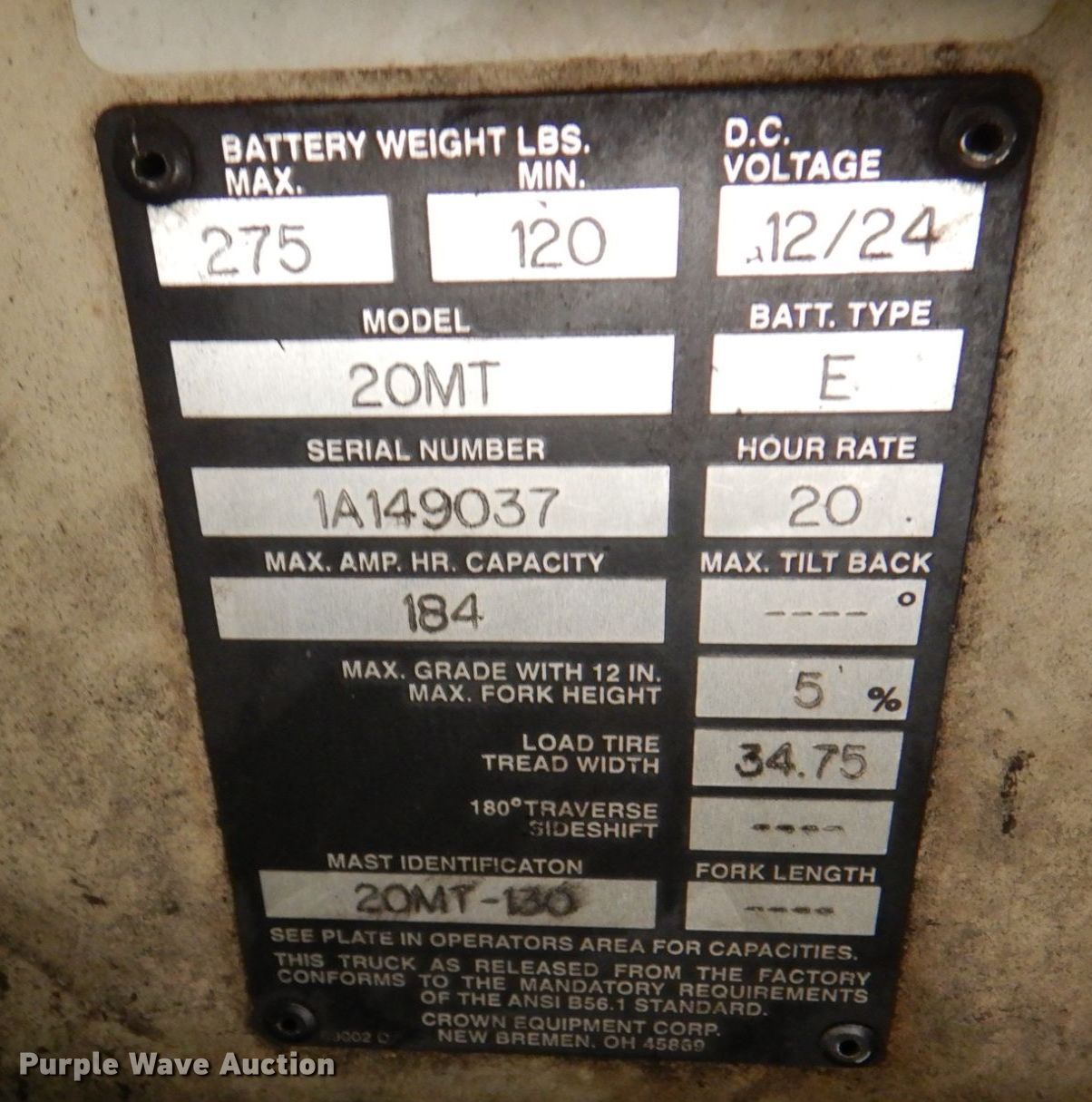 Crown 20MT forklift has sold in Mount Pleasant, Iowa for $715. Item MC9794 sold on March 15th, 2023.