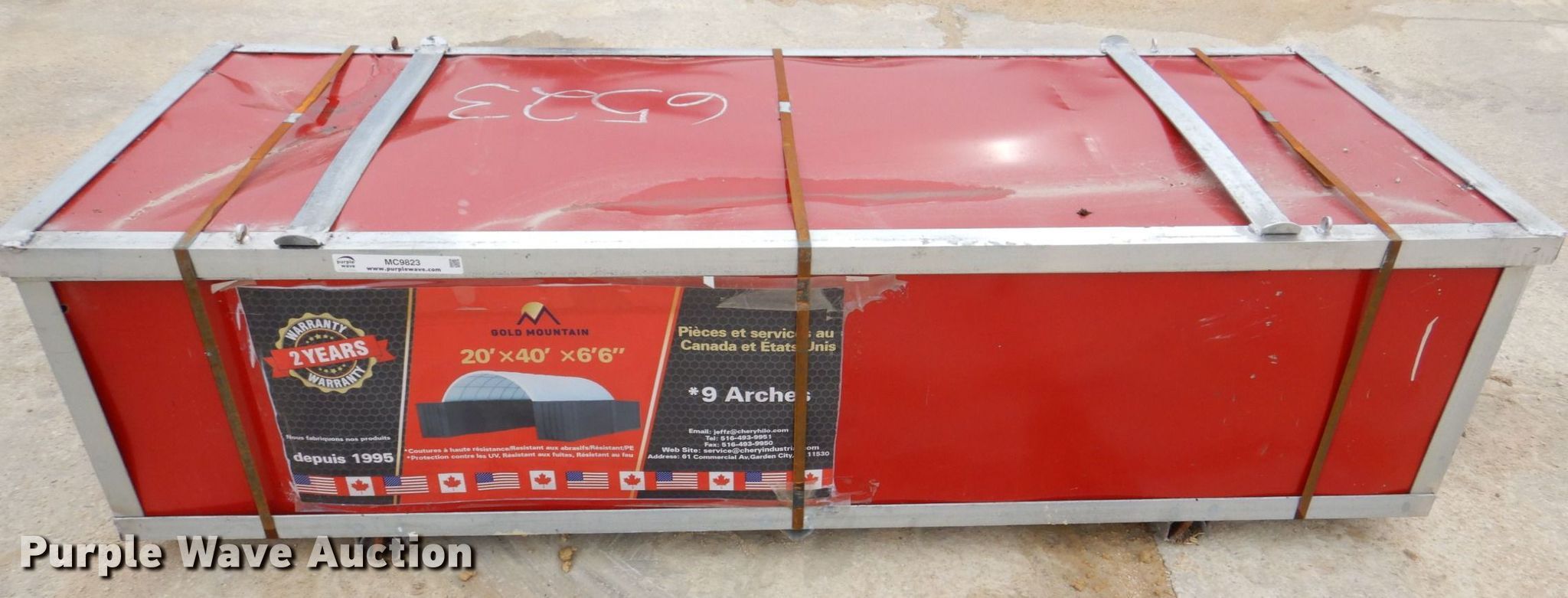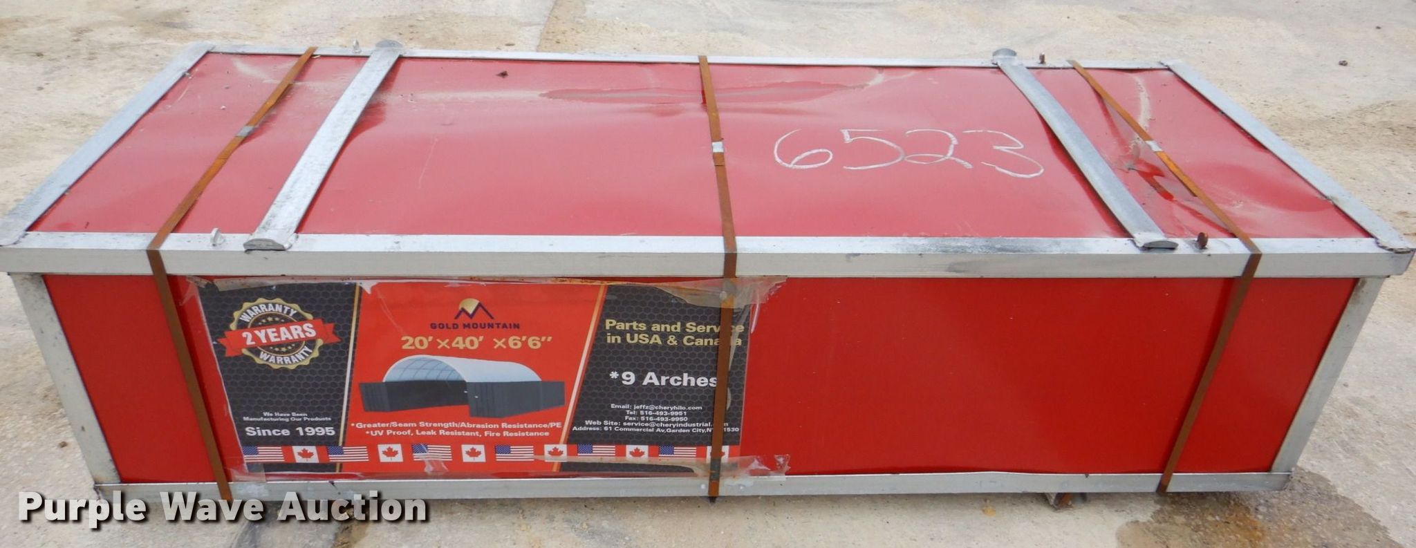 Purple Wave is selling a used Building Materials in Iowa. This item is a Gold Mountain C2040 shipping container canopy with the following: 40' L x 20' W x 6' 6" H, (9) arches