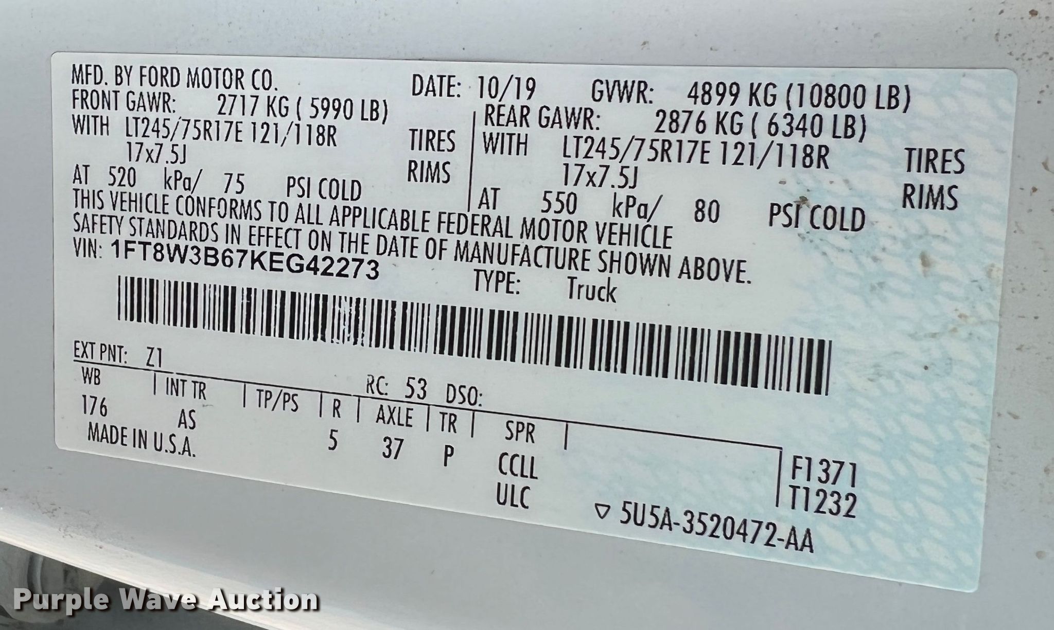 Purple Wave is selling a used 3/4 or 1 Ton Pickup or Van in Missouri. This item is a 2019 Ford F350 Super Duty XL Crew Cab pickup truck with the following: Miles: 51,440 on odometer, VIN: 1FT8W3B67KEG42273