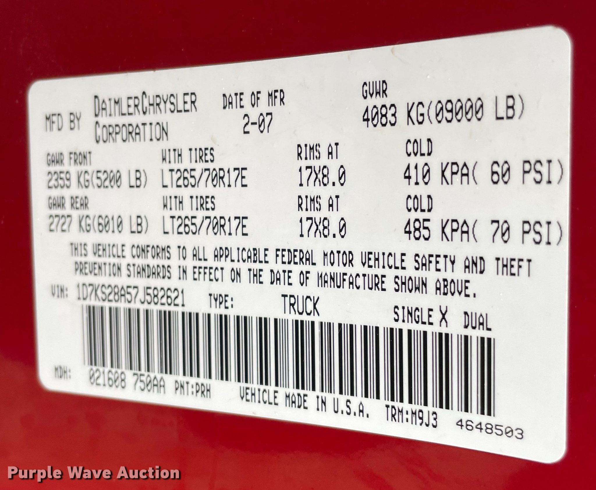 Purple Wave is selling a used 3/4 or 1 Ton Pickup or Van in Oklahoma. This item is a 2007 Dodge Ram 2500 SLT Quad Cab pickup truck with the following: Miles: 160,737 on odometer, VIN: 1D7KS28A57J582621