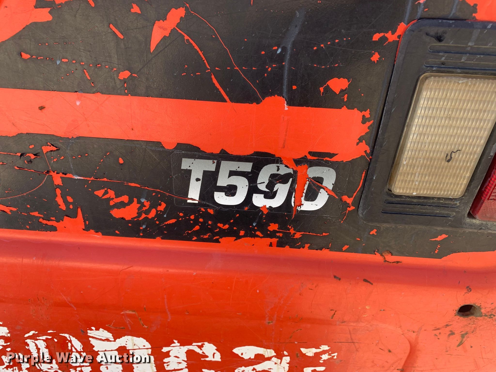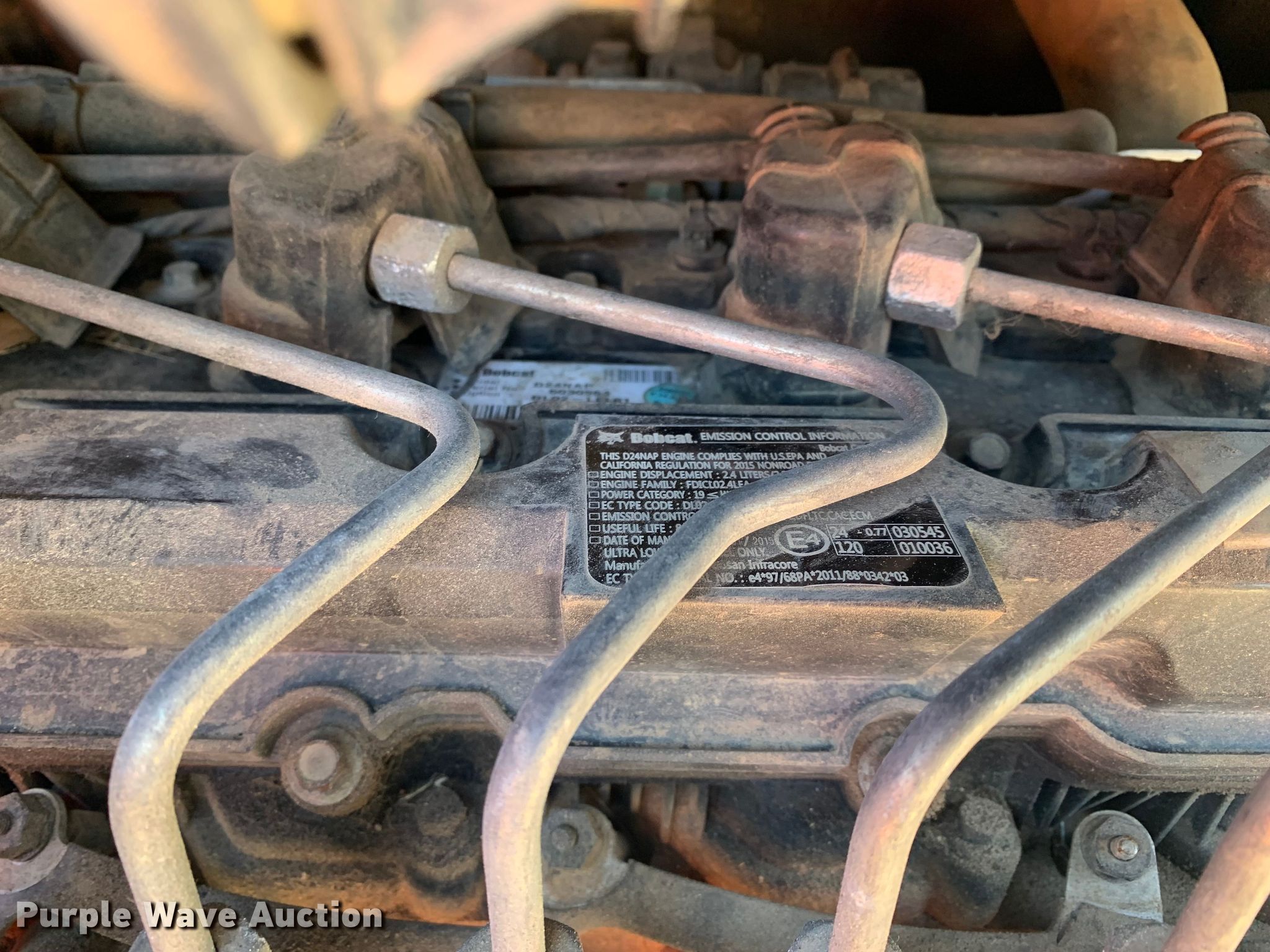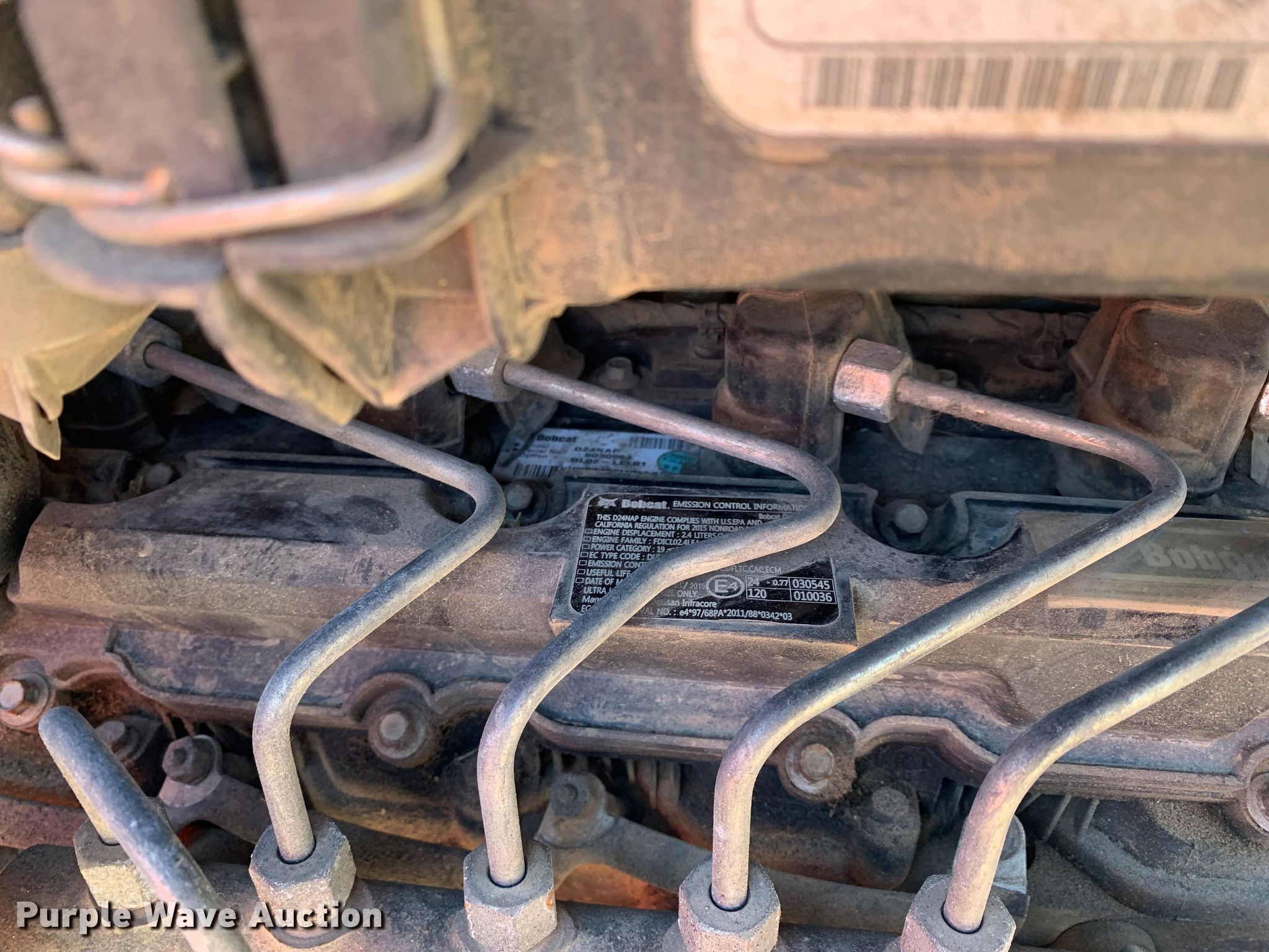 2015 Bobcat T590 tracked skid steer loader. Hours: 4,569 on meter, Serial: ALJU15083. Engine Bobcat D24NAP, Serial: 5030964, Cylinders: 4, Fuel type: Diesel. Transmission Hydrostatic. Operators station Enclosed cab, Bucket control: Hand. Features Auxiliary hydraulics, Quick coupler: Manual, Bucket Width: 77", Cutting edge: Weld-on, Teeth: Weld-on. Tracks Width: 16". Oologah, OK 74053