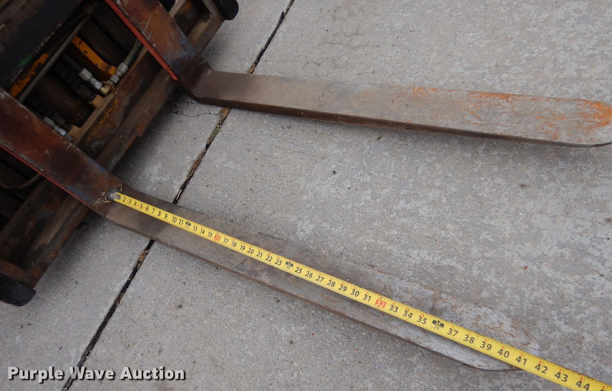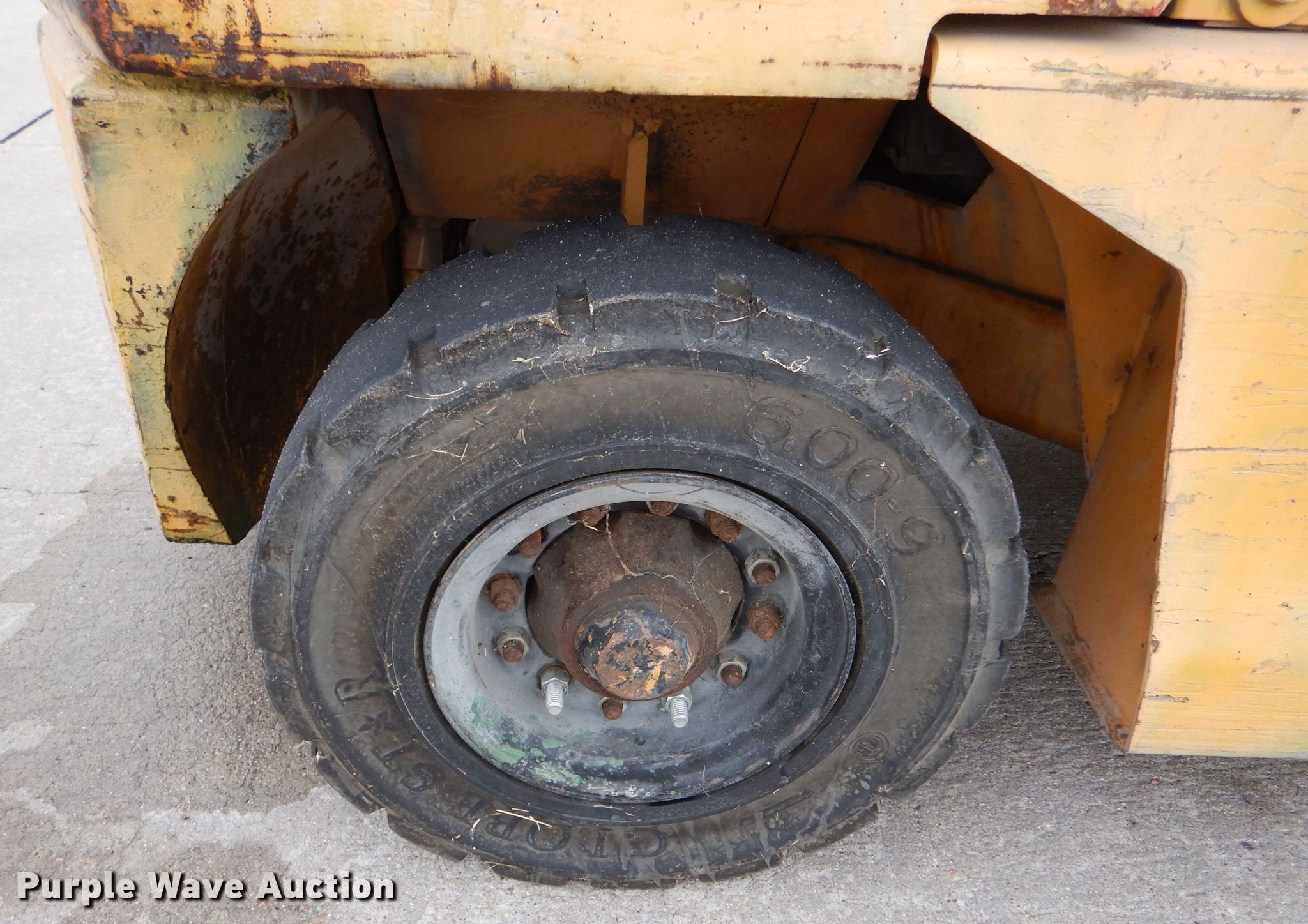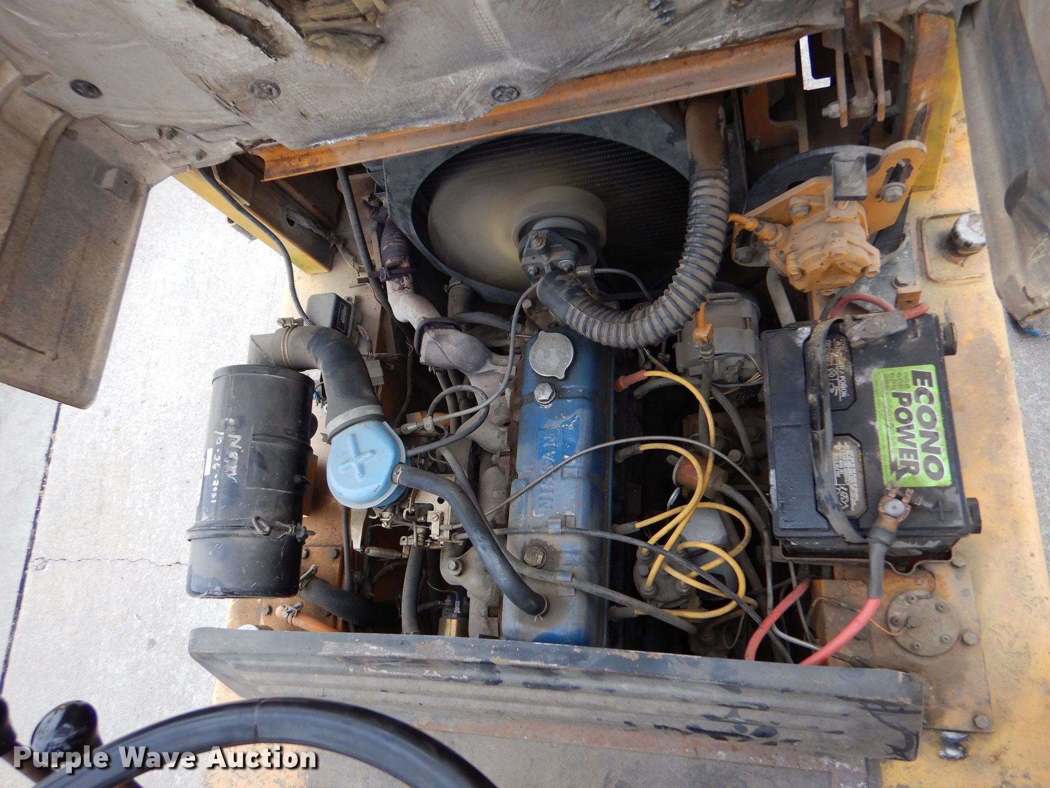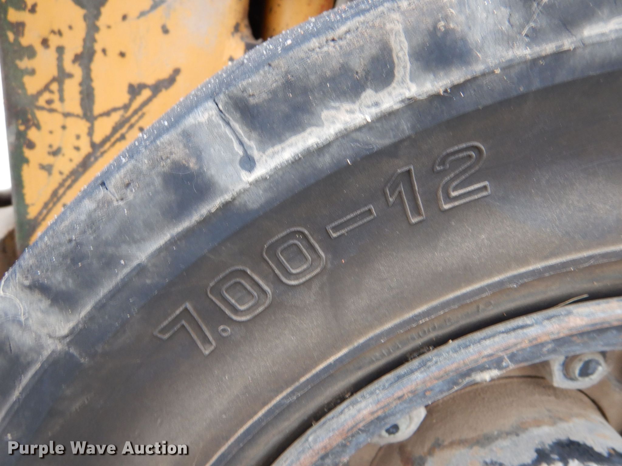 Komatsu FG25C-8 forklift. Hours: 15,714 on meter. Engine Nissan, Cylinders: 4, Fuel type: Gas. Transmission Powershift, 2F - 2R. Operators station Canopy. Features Maximum lift height: Approx. 14' 6", Mast stages: 3, Side shift, Mast tilt, Fork length: 42". Tires Front: 7.00-12, Rear: 6.00-9, Solid. Notes Flywheel damage, unit must be pull started. 102 Airport Road. Dodge City, KS 67801