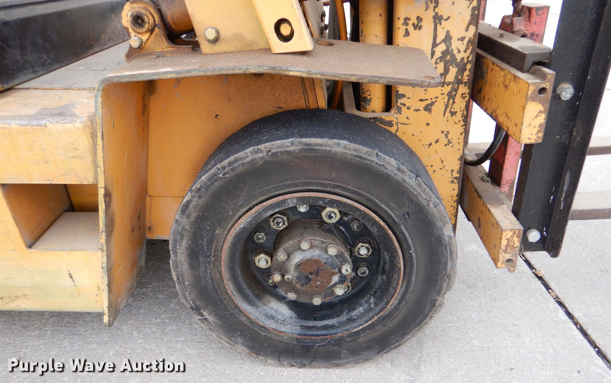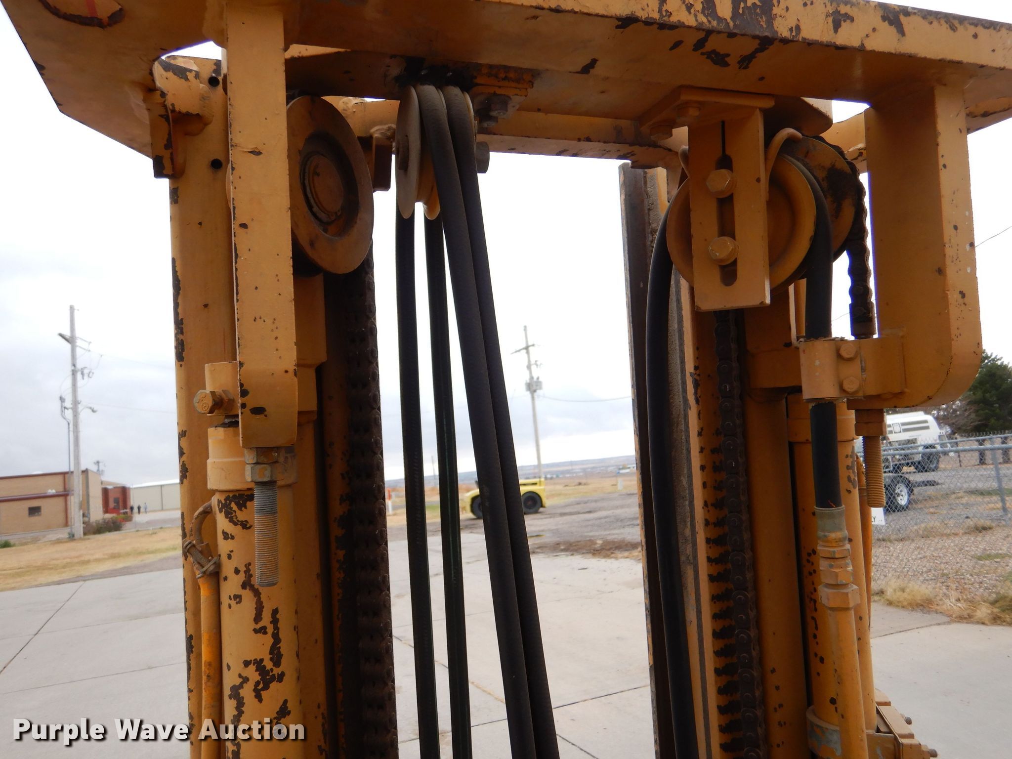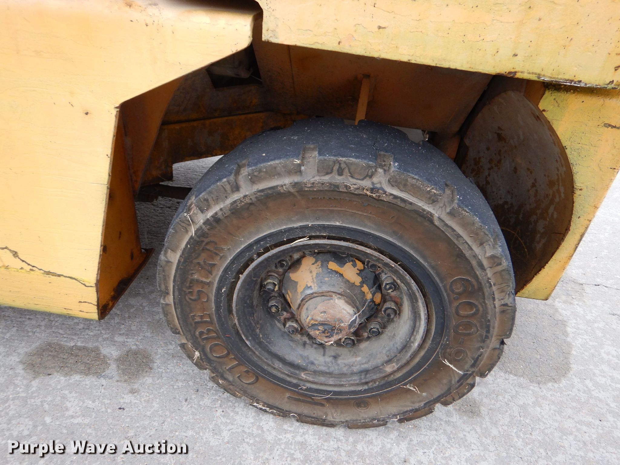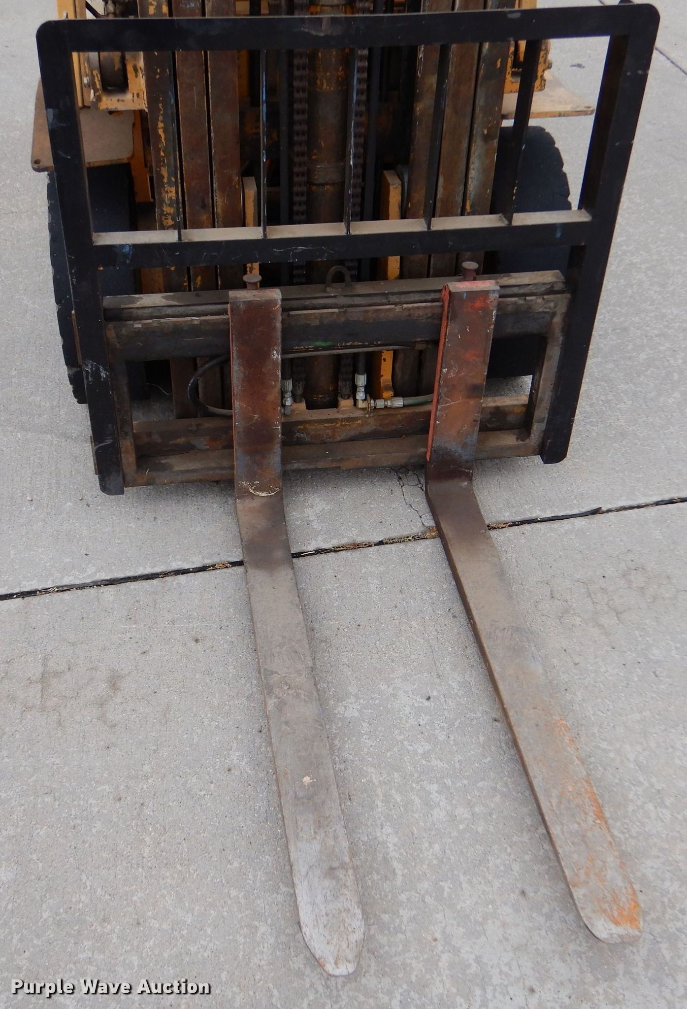 Komatsu FG25C-8 forklift. Hours: 15,714 on meter. Engine Nissan, Cylinders: 4, Fuel type: Gas. Transmission Powershift, 2F - 2R. Operators station Canopy. Features Maximum lift height: Approx. 14' 6", Mast stages: 3, Side shift, Mast tilt, Fork length: 42". Tires Front: 7.00-12, Rear: 6.00-9, Solid. Notes Flywheel damage, unit must be pull started. 102 Airport Road. Dodge City, KS 67801