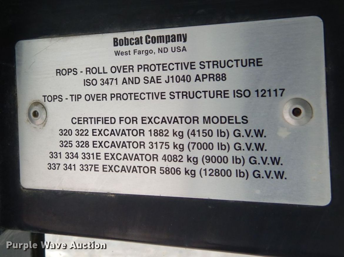 2001 Bobcat 325D mini excavator. Hours: Unknown, Serial: 232311792. Engine Kubota D1703E, Cylinders: 3, Fuel type: Diesel, kW: 27.2. Transmission Hydrostatic, Two speed travel. Operators station EROPS, Heat, Pattern changer. Features Backfill blade Width: 55", Boom Swing, Stick Stick length: 7' 4", Quick coupler: Mechanical, Thumb: Hydraulic, Bucket Width: 19", Cutting edge: Bolt-on, Teeth: 4. Tracks Width: 13", Rubber. Notes Non-operational hour meter. Icon LLC. 330 East Highway. Dodge Center, MN 55927