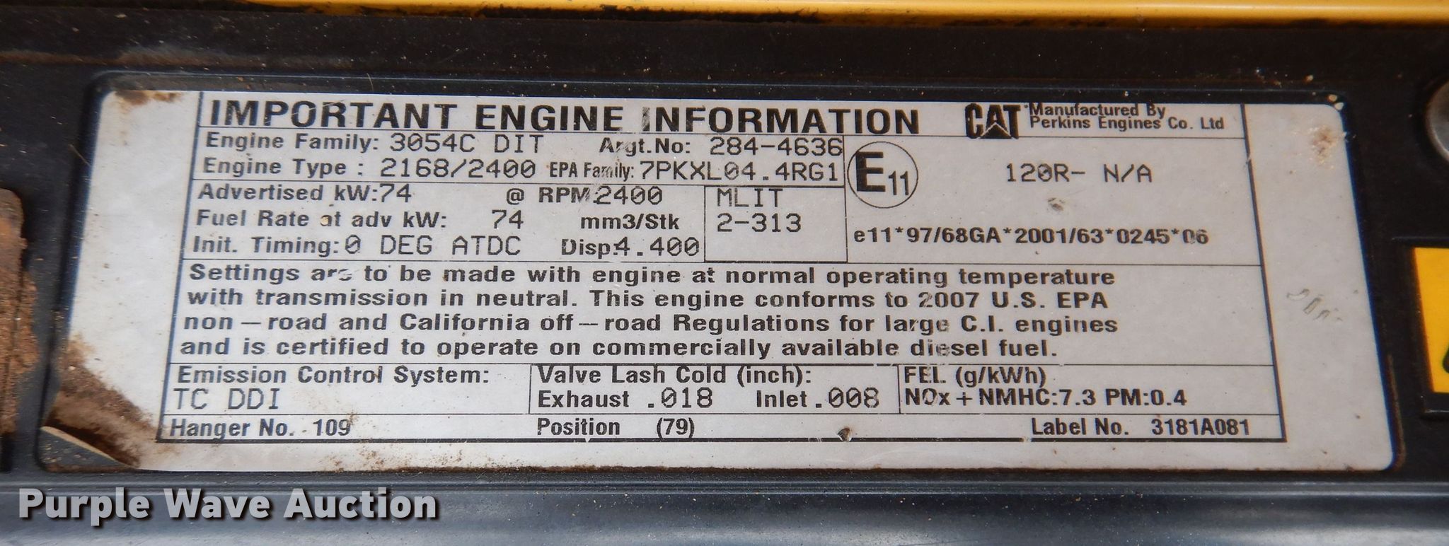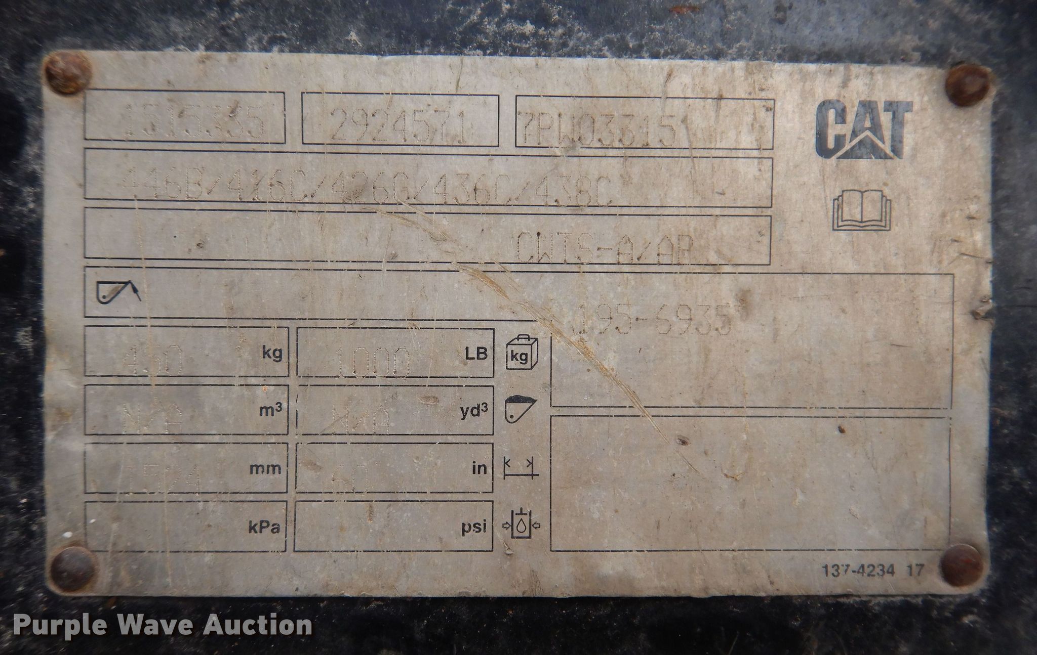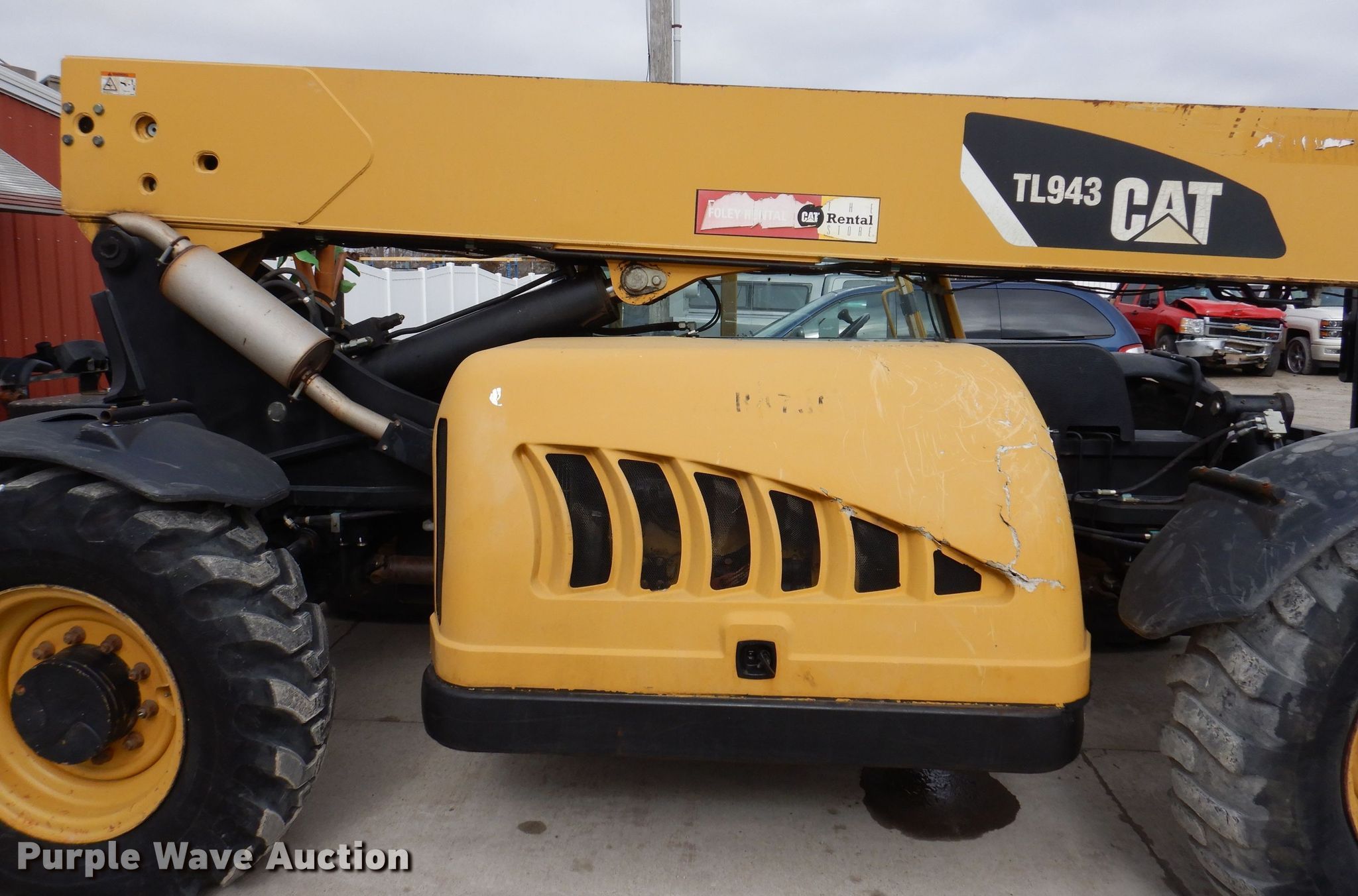 2007 Caterpillar TL943 telehandler. Hours: 4,744 on meter, Serial: TBL00861. Engine Caterpillar, Displacement: 4.4L, Cylinders: 4, Fuel type: Diesel. Transmission Hydrostatic. Operators station OROPS, Steering: Crab, Four wheel. Features Maximum lift capacity: 9,000 lbs, Maximum lift height: 44', Boom stages: 3, Fork length: 48", Auxiliary hydraulics, Hydraulic outriggers, Hydraulic leveling, Quick attach: Hydraulic. Tires Size: 13.00-24TG. Notes Alternator issues, needs replaced, Boom issues, first section bent, Hood shock issues, weak. Spilman Auto Parts. 20311 Old Hwy 2. Bloomfield, IA 52537