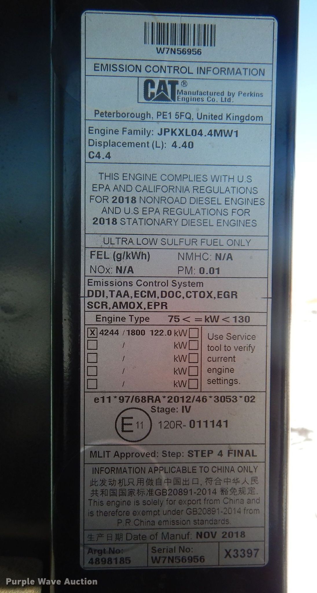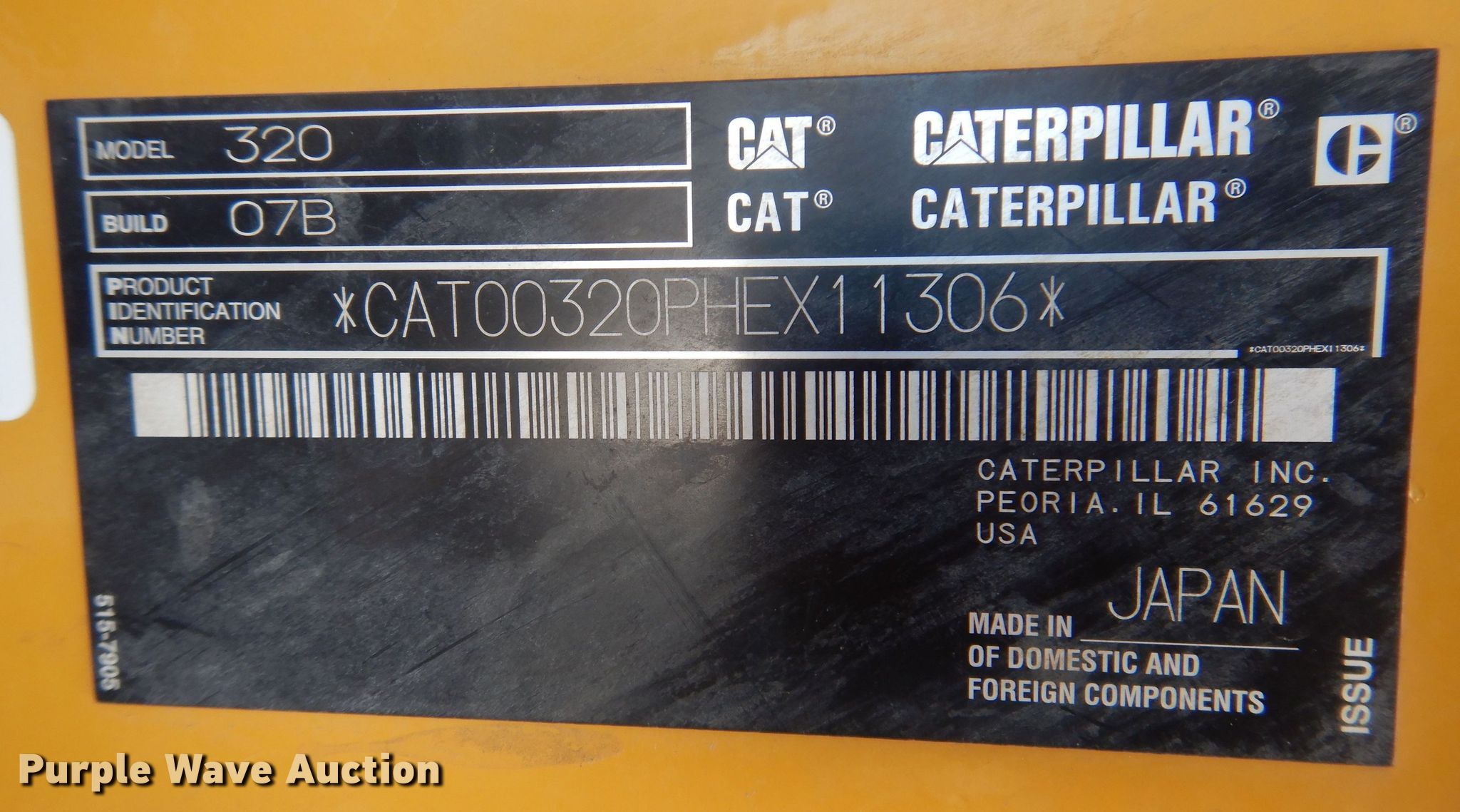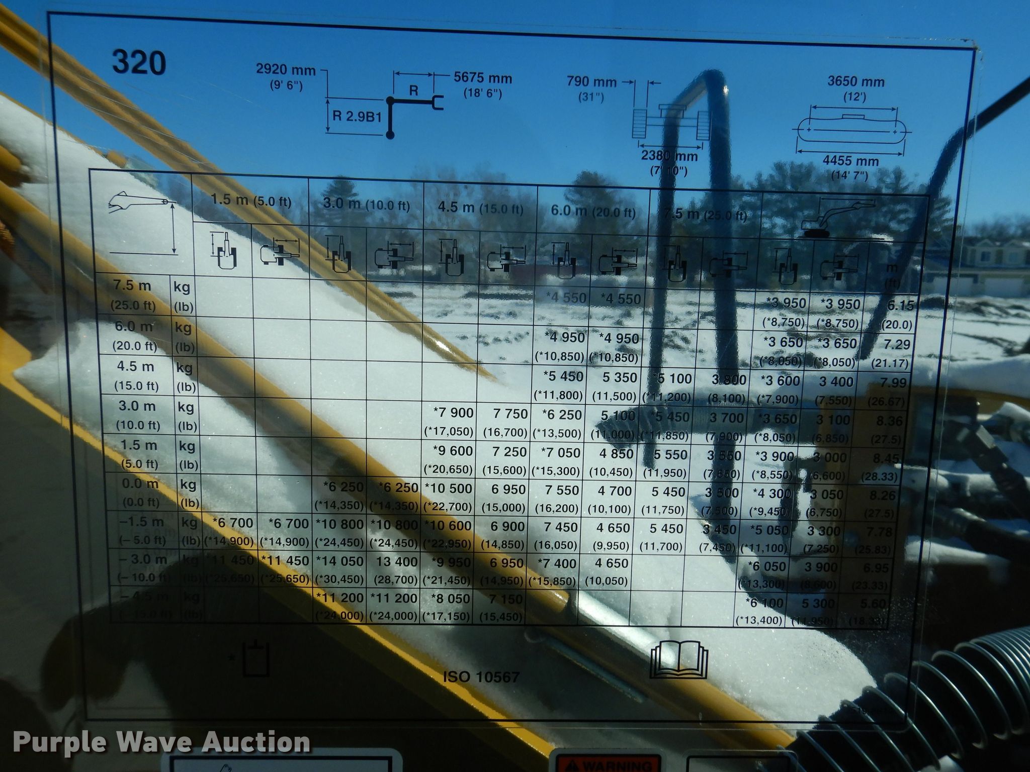 2019 Caterpillar 320 excavator. Hours: 674 on meter, Serial: CAT00320PHEX11306. Engine Caterpillar C4.4 Acert, Serial: W7N56956, Displacement: 4.4L, Cylinders: 4, Fuel type: Diesel. Transmission Hydrostatic. Operators station EROPS, AC, Heat, Pattern changer, Grade control, Caterpillar. Features Auxiliary hydraulics, Boom Standard, Stick Stick length: 8' 4", Quick coupler: Hydraulic Caterpillar, Bucket Caterpillar 320E B Linkage HD, Capacity: 1.56 cu.yd., Width: 48", Cutting edge: Weld-on, Teeth: 6. Tracks Width: 31", Steel, Grouser pads: Triple. Terra Firma JV. Waukee, IA 50263