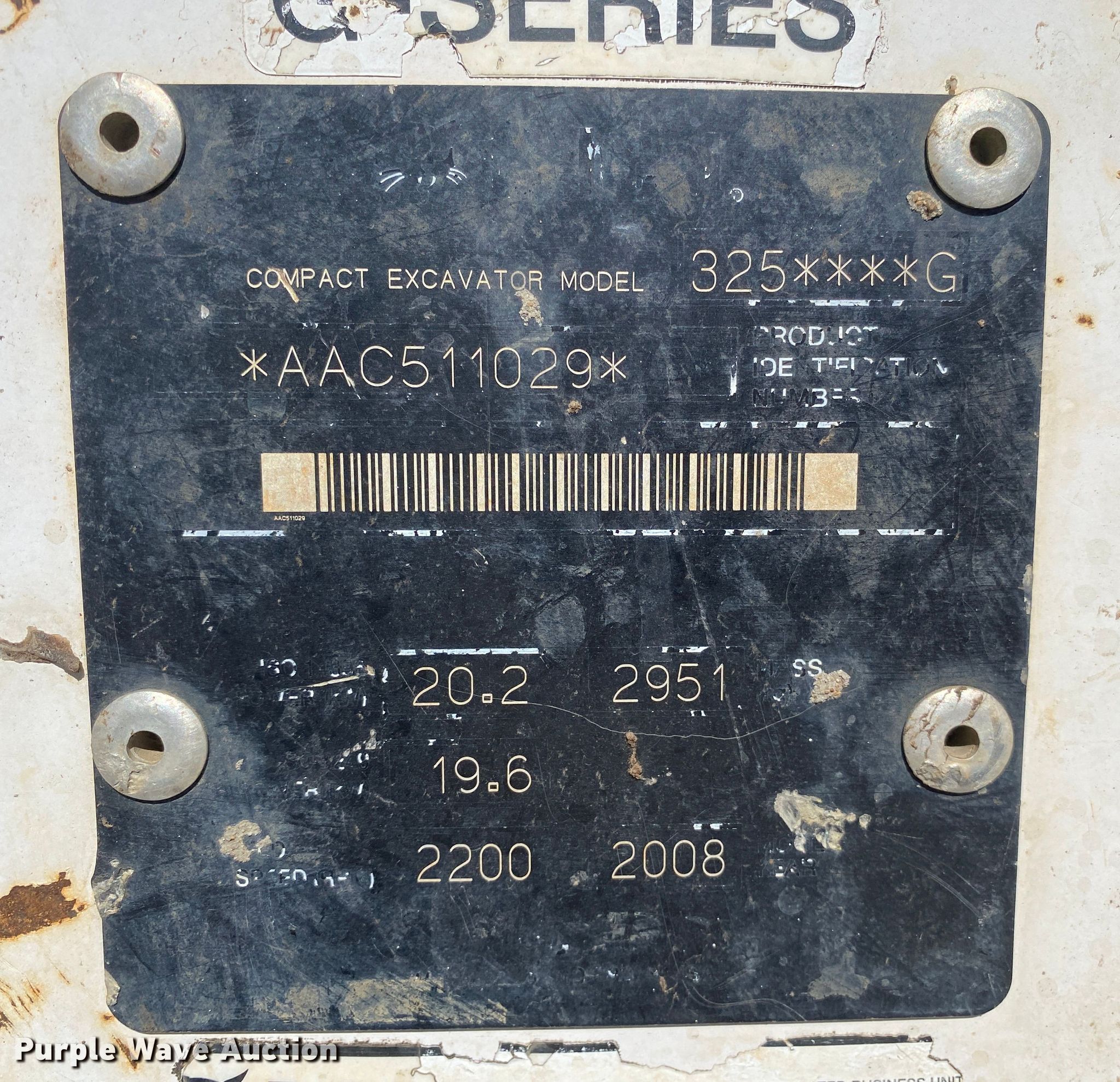Purple Wave is selling a used Mini Excavator in Oklahoma. This item is a 2008 Bobcat 325G mini excavator with the following: Hours: 2,210 on meter, Serial: AAC511029