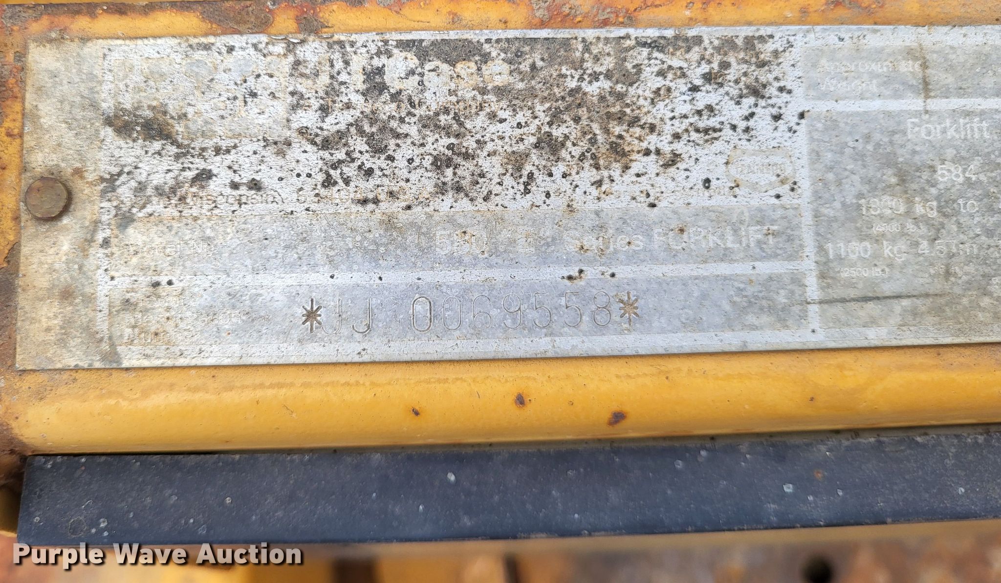 1991 Case 586E forklift. Hours: Unknown, Serial: JJ0069558. Engine Case 4-390, Serial: 44538436, Cylinders: 4, Fuel type: Diesel. Transmission Shuttle shift, 4F - 4R. Chassis Differential lock. Operators station Canopy. Features Maximum lift capacity: 6,000 lbs, Mast stages: 2, Side shift, Mast tilt, Fork length: 48". Tires Front: 16.9-24, Rear: 11L-16SL. JML Inc.. 3019 Wayne Avenue. Poplar Bluff, MO 63901
