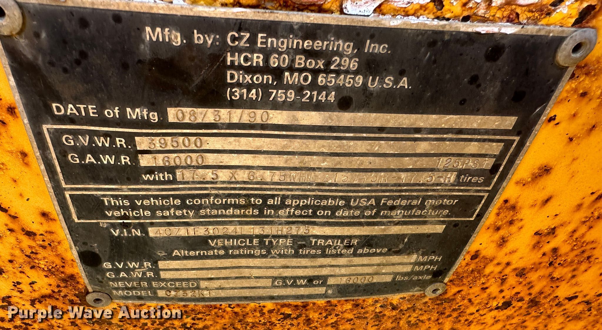 1990 CZ Engineering CZ32KT equipment trailer. VIN: 4CZTF3024L131H273. Dimensions Overall: 30' L x 102" W, Deck height: 36", Tail length: 65", Ramps: Manual Length: 60". Features Deck type: Wood. Chassis Hitch: Pintle, Landing gear: Single, Suspension: Spring, Brakes: Air, Axles: Tandem. Tires Steel wheels, Size: 215/75R17.5. Kansas title. Title distribution may be delayed up to 14 days from verification of funds. 1783 E 1500 Rd. Lawrence, KS 66044