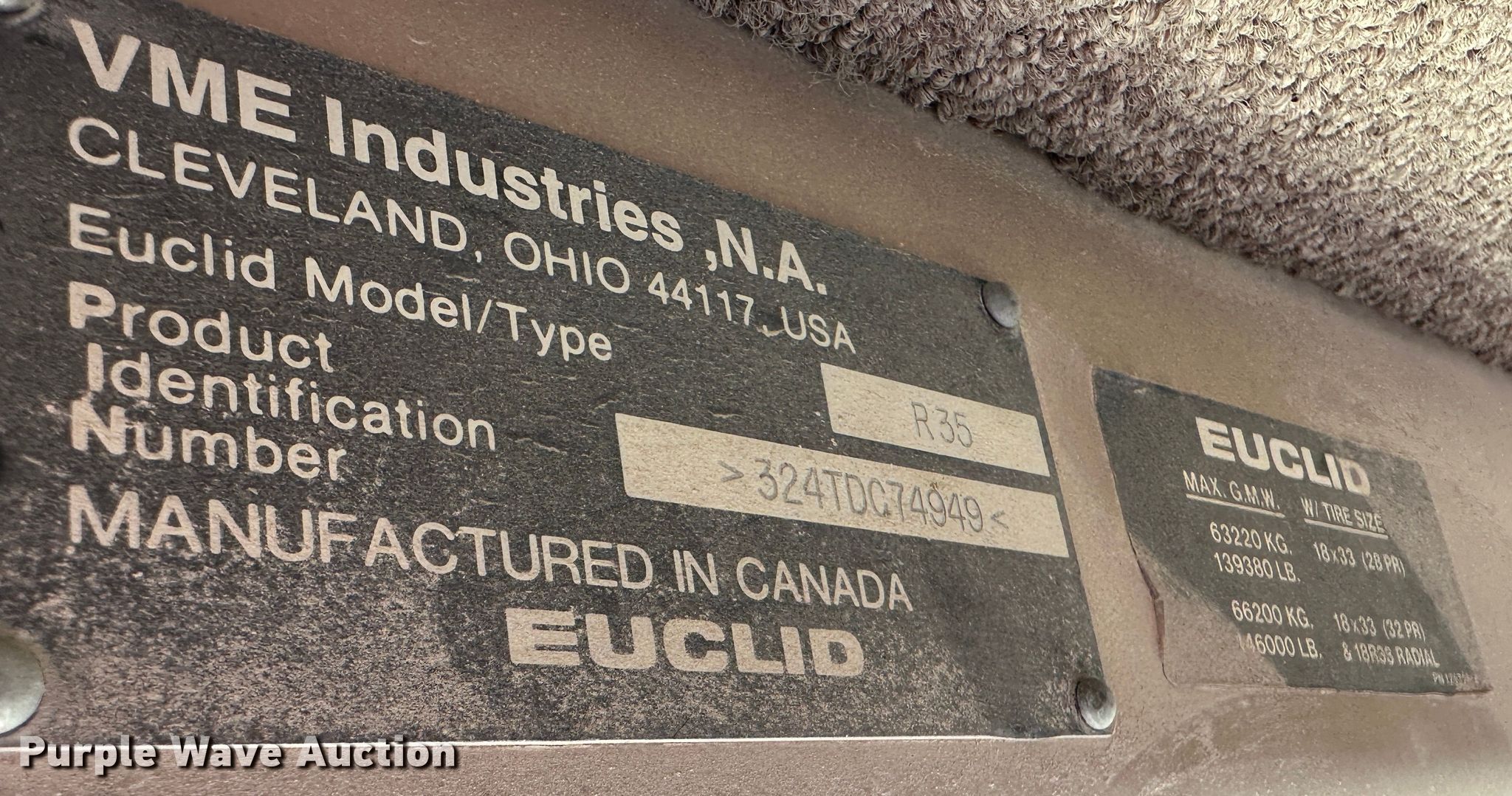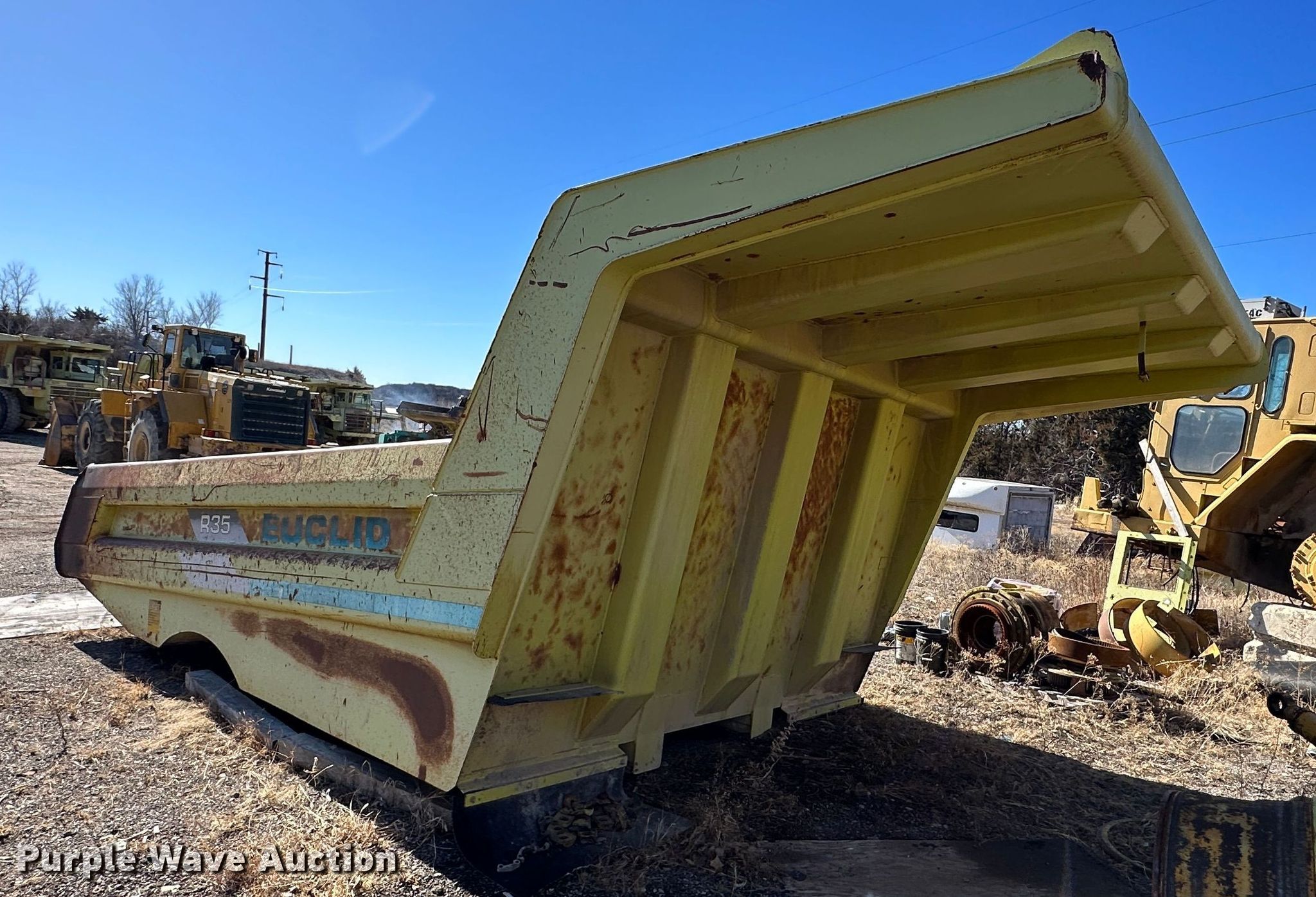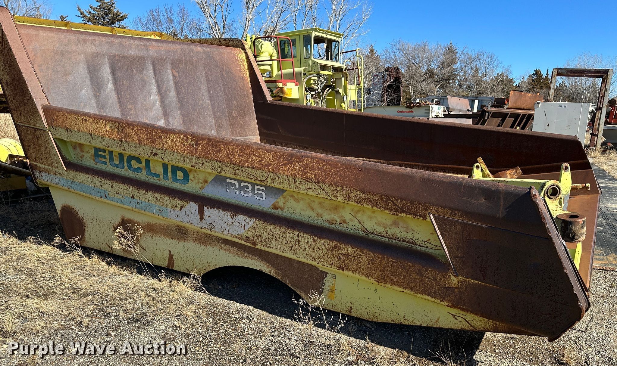 1994 Euclid R35 haul truck. Miles: Unknown, Hours: Unknown, Serial: 324TDC74949. Engine Cylinders: 6, Fuel type: Diesel. Interior Retarder. Features Dump bed Euclid , Capacity: 35 tons. Notes Parts only, Parts missing, Non-operational unit. Bayer Construction Company. 120 Deep Creek Rd. Manhattan, KS 66502