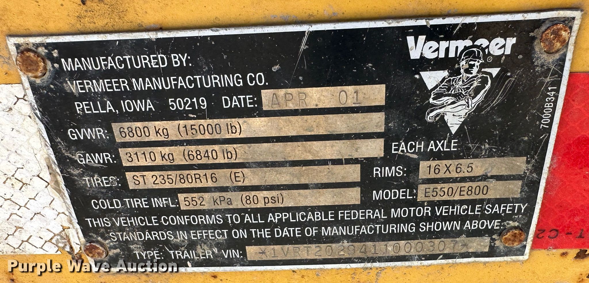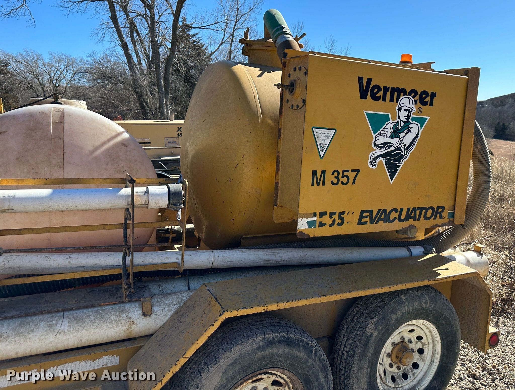 2001 Vermeer E550 vacuum excavator. Hours: 919 on meter, VIN: 1VRT2029411000307. Engine Deutz, Cylinders: 4, Fuel type: Diesel. Features Spoils tank Capacity: 550 gallons, Water tank Capacity: 250 gallons, Water pump Powered Equipment, Vacuum pump Inlet valve size: 3", Outlet valve size: 7". Trailer 19' L x 93" W, Suspension: Spring, Brakes: Electric, Axles: Tandem, Tire size: 235/80R16. This is worksite support equipment and will not come with a title. Transfer of ownership documentation will be a bill of sale. Bayer Construction Company. 120 Deep Creek Rd. Manhattan, KS 66502