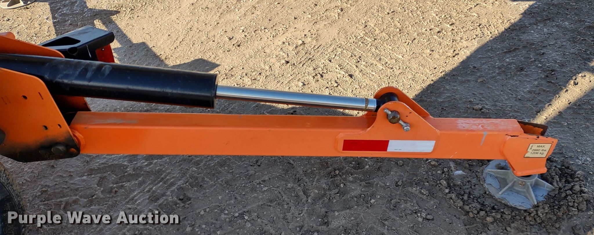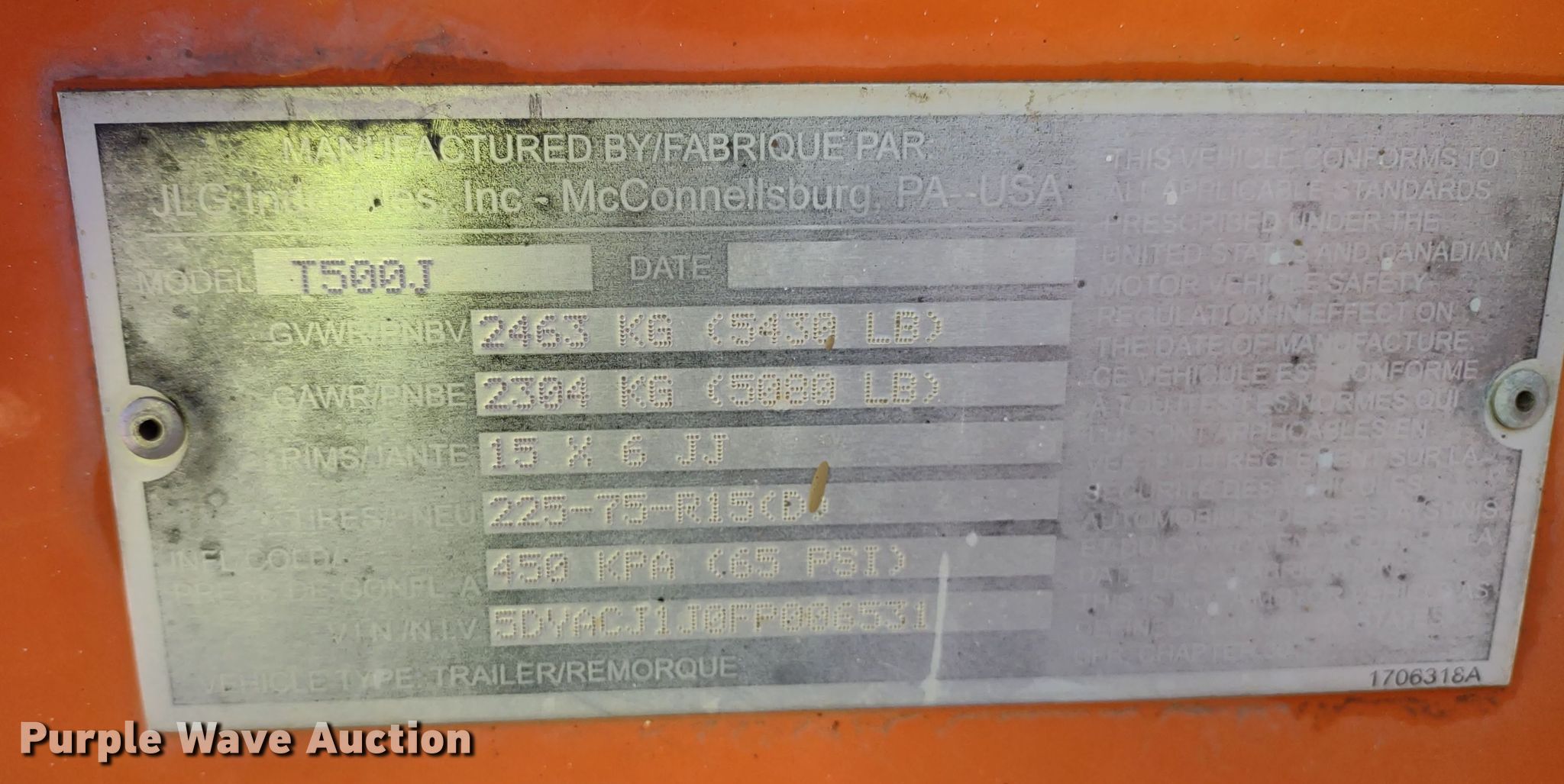2015 JLG T500J boom lift. Hours: 1,564 on meter, Serial: 0030006531. Engine Honda, Cylinders: 2, Fuel type: Gas. Features Tow behind, Maximum lift capacity: 500 lbs, Maximum lift height: 50', Hydraulic outriggers, Hydraulic extendable jib, Hydraulic leveling, Platform: 28" L x 45" W, AC power outlet, Controls: Platform, Ground. Tires Tire size: 225/75R15. Gerken Rent-All. 31600 Old KC Rd. Paola, KS 66071