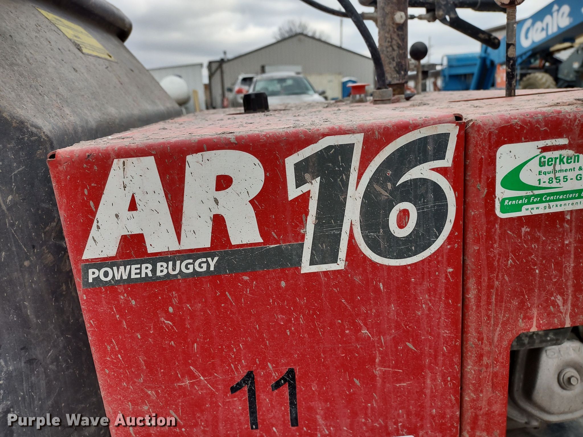 Allen AR16 concrete buggy. Serial: A161113017. Engine Honda GX390, Cylinders: 2, Fuel type: Gas. Operators station Hydraulic dump. Tires Front: 5.70-8, Rear: 4.80/4.00. Gerken Rent-All. 31600 Old KC Rd. Paola, KS 66071