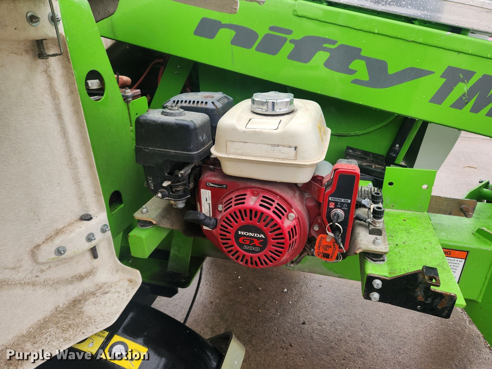 2017 Nifty TM42T boom lift. Hours: Unknown, VIN: SLN42TGE9HM036584. Engine Honda GX200, Displacement: 196 cc, Cylinders: 1, Fuel type: Gas. Features Tow behind, Maximum lift capacity: 500 lbs, Maximum reach length: 23', Maximum lift height: 42', Hydraulic outriggers, Platform: 53" L x 26" W, Controls: Platform, Ground. Tires Tire size: 195R14C. Notes Dead battery, Non-operational hour meter. Transfer of ownership documentation will be a bill of sale. La Crosse Lumber Company. 1014 W Adams Pl. Bowling Green, MO 63334