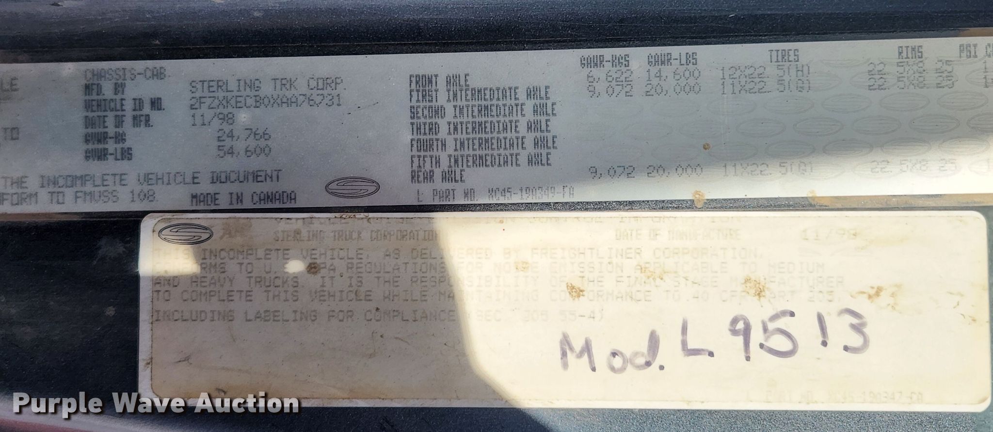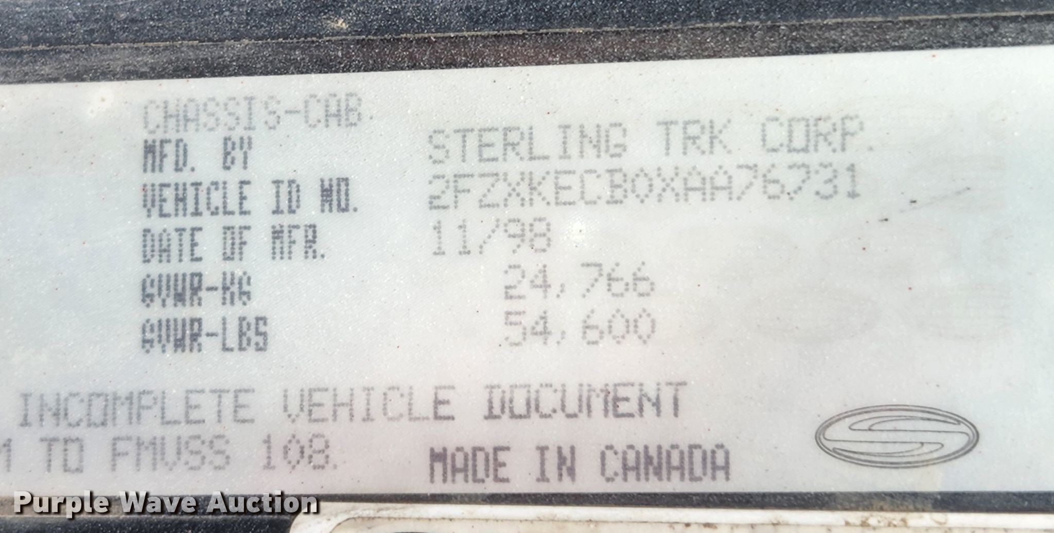 1999 Sterling LT9513 dump truck. Miles: 548,493 on odometer, VIN: 2FZXKECB0XAA76731. Engine Caterpillar C10, Displacement: 10.3L, Cylinders: 6, Fuel type: Diesel, Engine brake. Transmission Eaton Fuller Roadranger, Manual, Speed: 10. Chassis Axles: Triple, Pusher axle, Differential lock: Full, Suspension: Spring over walking beam, Brakes: Air, PTO, GVWR: 54,600 lbs FAWR: 14,600 lbs, IAWR: 20,000 lbs, RAWR: 20,000 lbs. Interior AC, Heat, Heated mirrors, Cruise control. Features Dump bed 17' L x 96" W, Side height: 45", Side board height: 10", Bed type: Steel, Roll tarp, Ram: Single , End gate: Air operated. Tires Front: 385/65R22.5, Rear: 11R22.5, Lift axle: 275/70R22.5. Illinois title. Title distribution may be delayed up to 14 days from verification of funds. Wayne's Hauling, Inc. East St. Louis, IL 62205