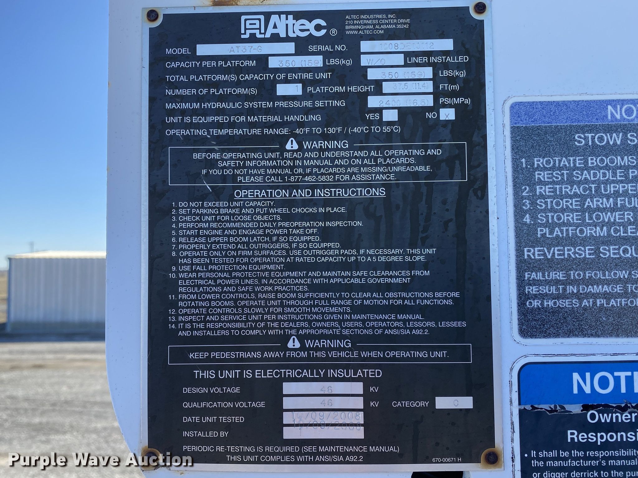 2008 Chevrolet C5500 bucket truck. Miles: 174,359 on odometer, VIN: 1GBE5C3998F412210. Engine Displacement: 6.6L, Cylinders: 8, Fuel type: Diesel. Transmission Automatic. Chassis Four wheel drive, Axles: Single, Suspension: Spring, Brakes: Hydraulic, PTO, GVWR: 19,500 lbs. Interior AC, Heat, Cruise control. Features Bed Reading ZAT132ADW, Serial: 673392, 13' 6" L x 94" W, Boom Altec AT37-G, Serial: 1008DE10112, Maximum lift capacity: 350 lbs, Maximum lift height: 37.5', Boom type: Articulating, Insulated, Telescopic, Man basket, Boom controls Platform/ basket.. Tires Size: 245/70R19.5. Notes Backup camera, Dash warning indicator: Brake. Oklahoma title. Title distribution may be delayed up to 14 days from verification of funds. 15107 North 137th East Avenue. Collinsville, OK 74021