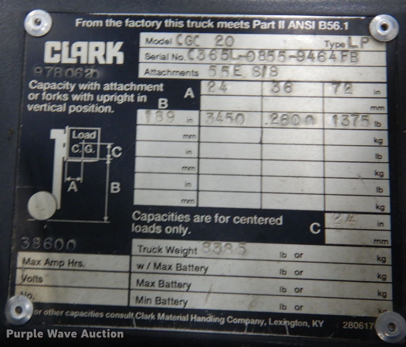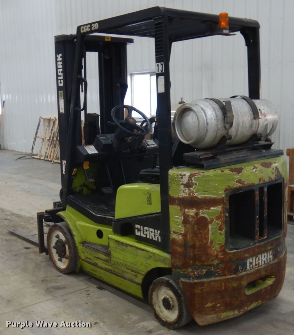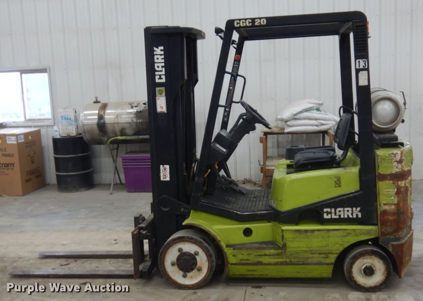 Purple Wave is selling a used Cushion Tire or Pneumatic Forklift in Minnesota. This item is a Clark CGC20 forklift with the following: Hours: 9,340 on meter, Serial: C365L-0855-9464FB