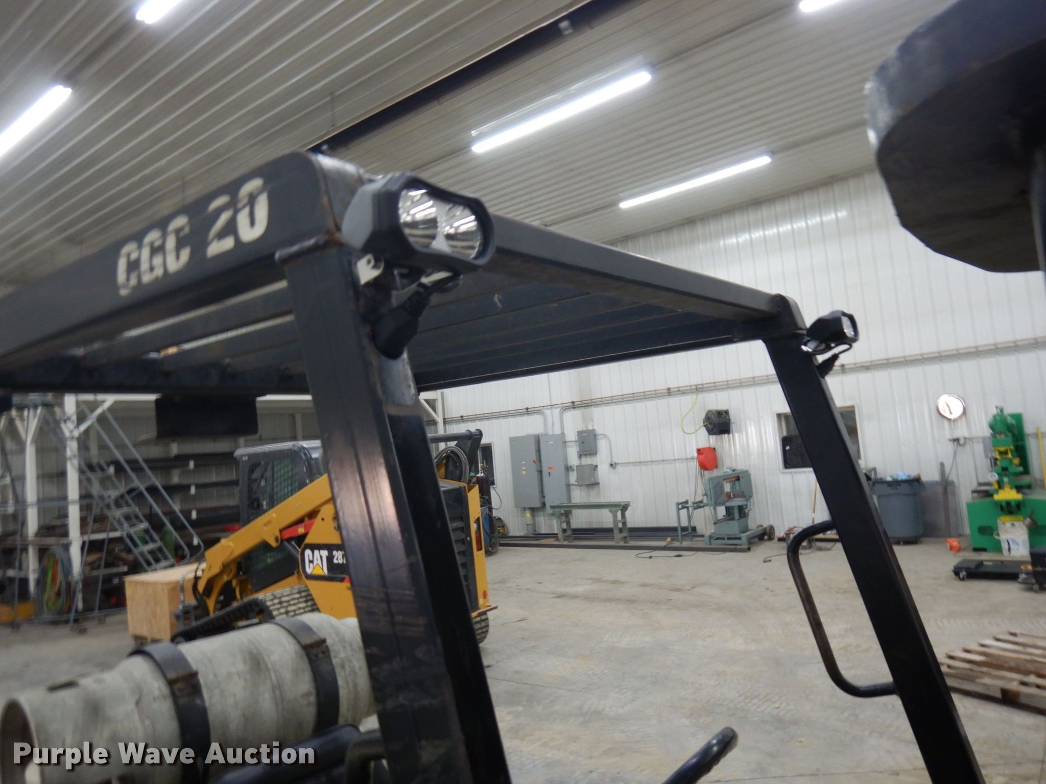 Clark CGC20 forklift. Hours: 9,340 on meter, Serial: C365L-0855-9464FB. Engine Cylinders: 4, Fuel type: LPG LP bottle: Included. Transmission Powershift. Operators station Canopy. Features Maximum lift capacity: 3,450 lbs, Maximum lift height: 189", Mast stages: 3, Side shift, Mast tilt, Fork length: 47". Tires Solid. Mulvihill Irrigation. 25495 Alverno Avenue. Farmington, MN 55024