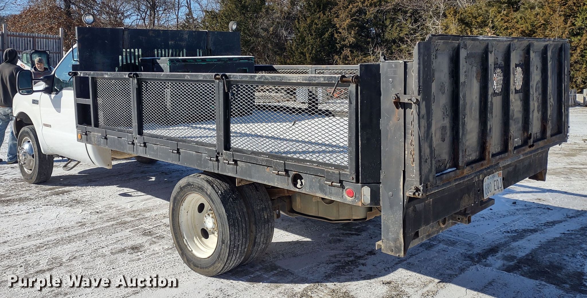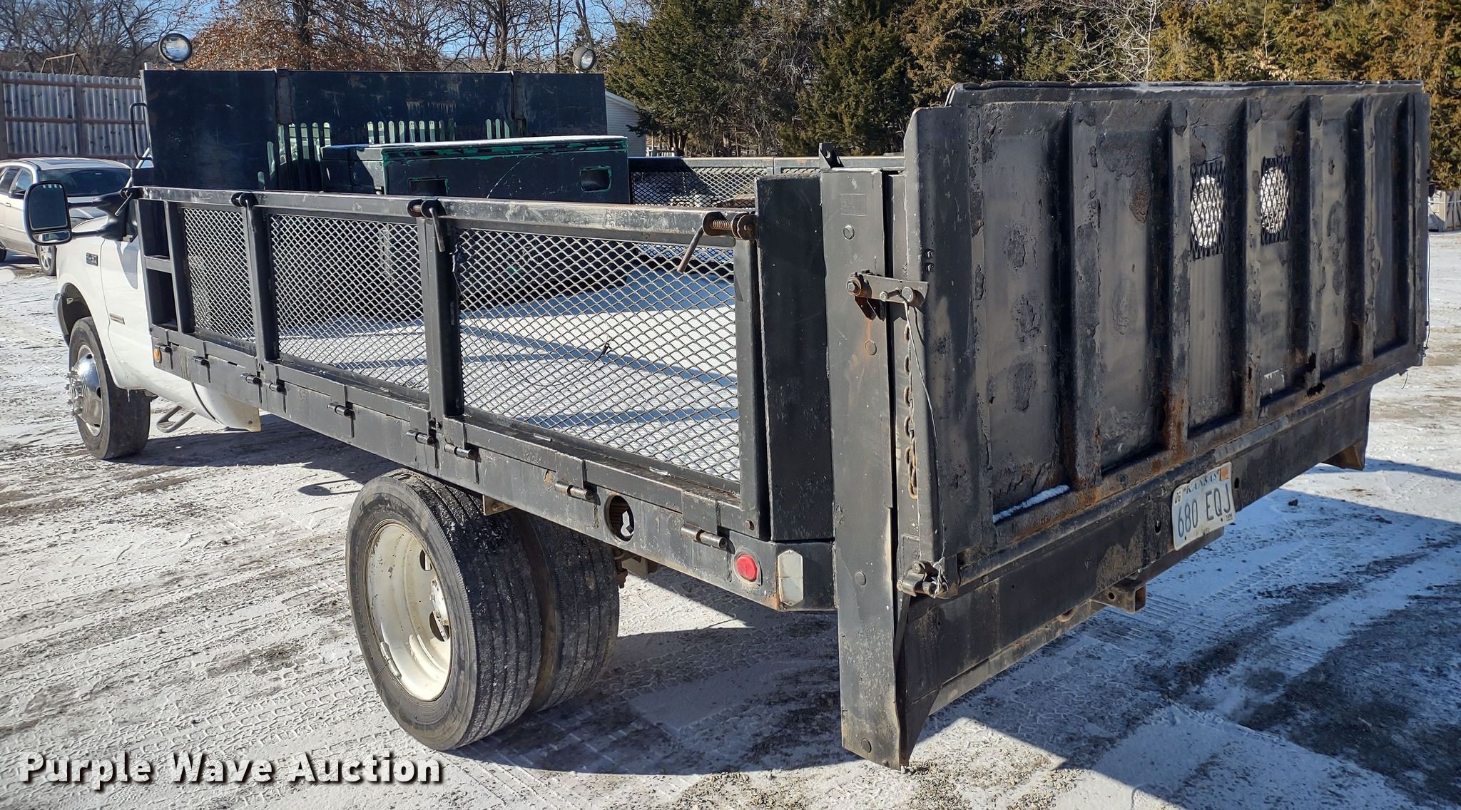 2004 Ford F450 Super Duty XL flatbed pickup truck. Miles: 225,887 on odometer, VIN: 1FDXF46P54EB72649. Engine Displacement: 6.0L V8 OHV, Cylinders: 8, Fuel type: Diesel. Transmission Automatic. Interior AC, Heat, Cruise control. Features Flatbed 13' L x 8' W, End gate lift Tommy Gate. Tires Size: 245/70R19.5. Notes Turns over but will not start, Non-operational unit. Kansas title. Title distribution may be delayed up to 14 days from verification of funds. All Construct LLC.. 564 East 1550 Road. Baldwin City, KS 66006