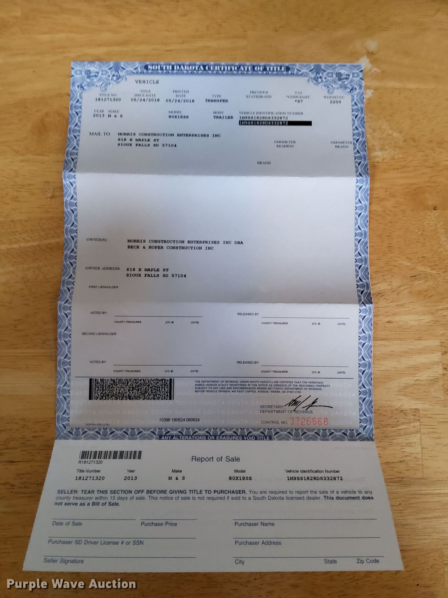 Purple Wave is selling a used Equip. Trailer in South Dakota. This item is a 2013 M&S equipment trailer with the following: VIN: 1M9SS1828DS332872