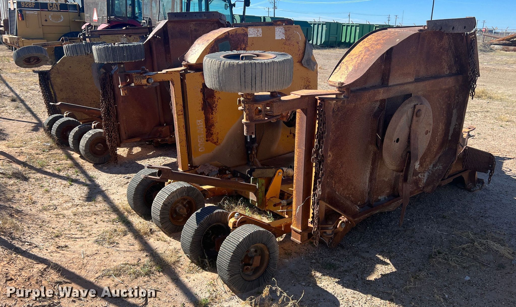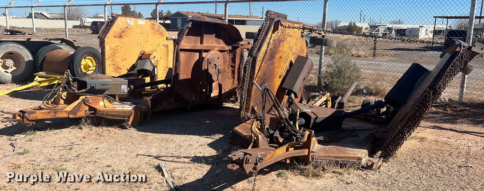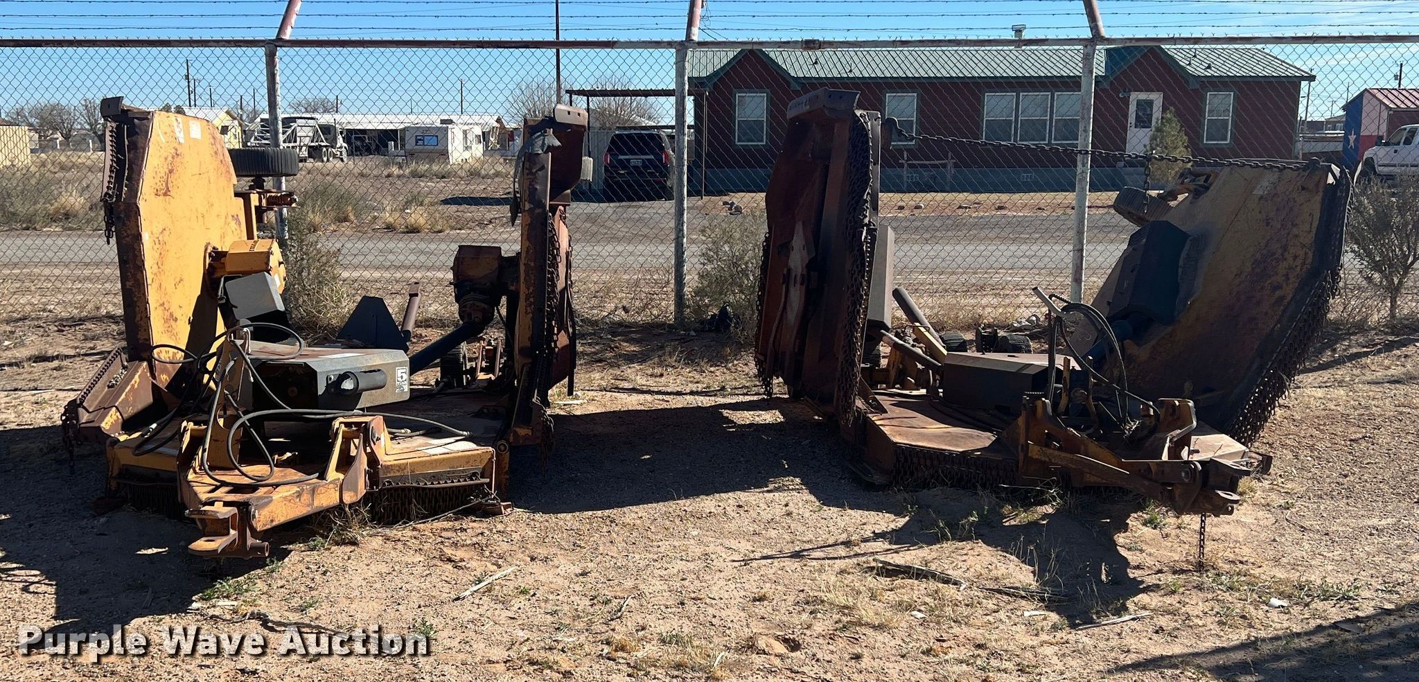 (2) Woods batwing rotary mowers. Features. Width: 15', Hydraulic lift, Hydraulic fold, PTO: 540. Tires Solid. Notes PTO half shafts missing, Non-operational unit. Reeves County. 1384 West F Street. Pecos, TX 79772