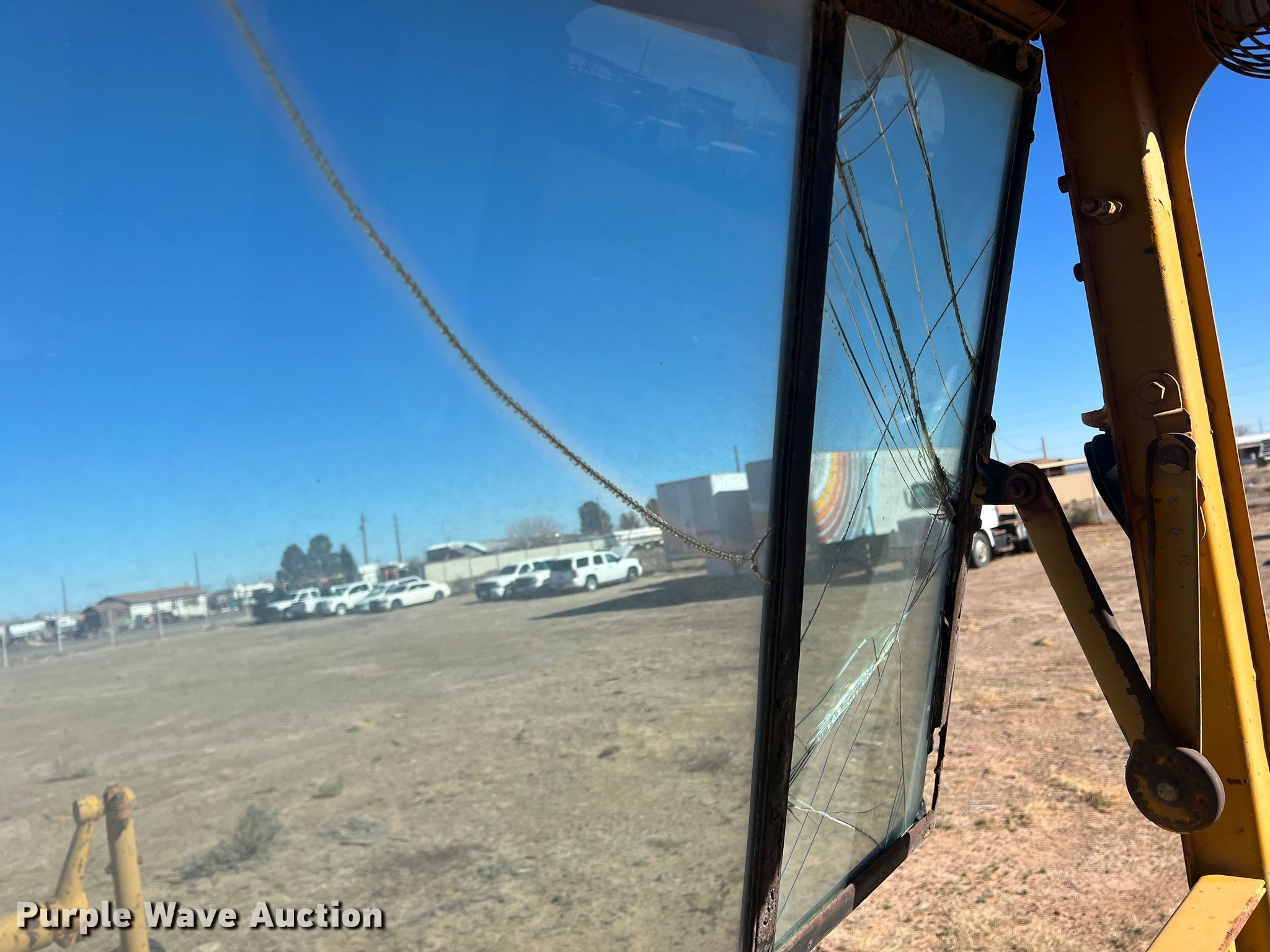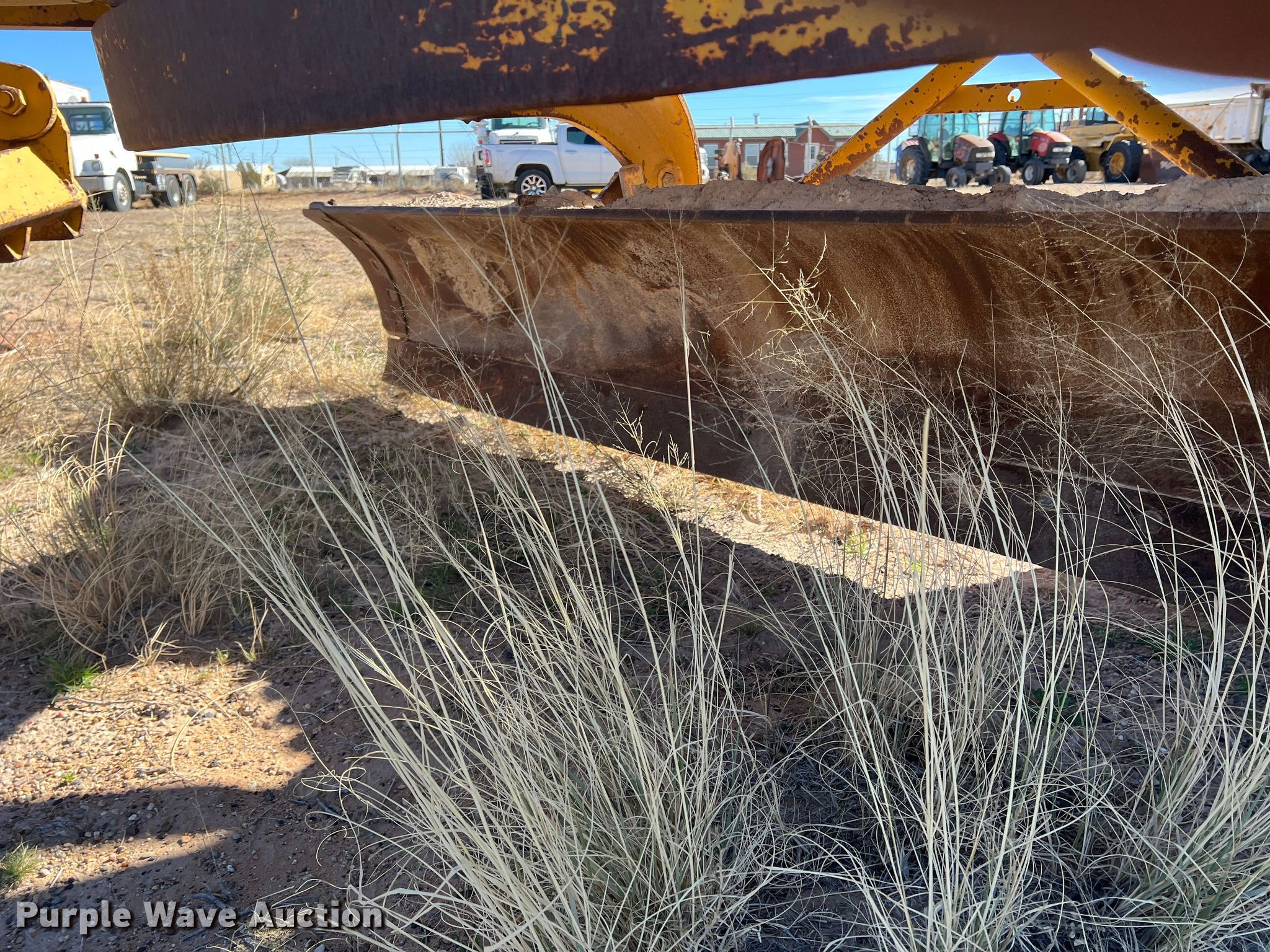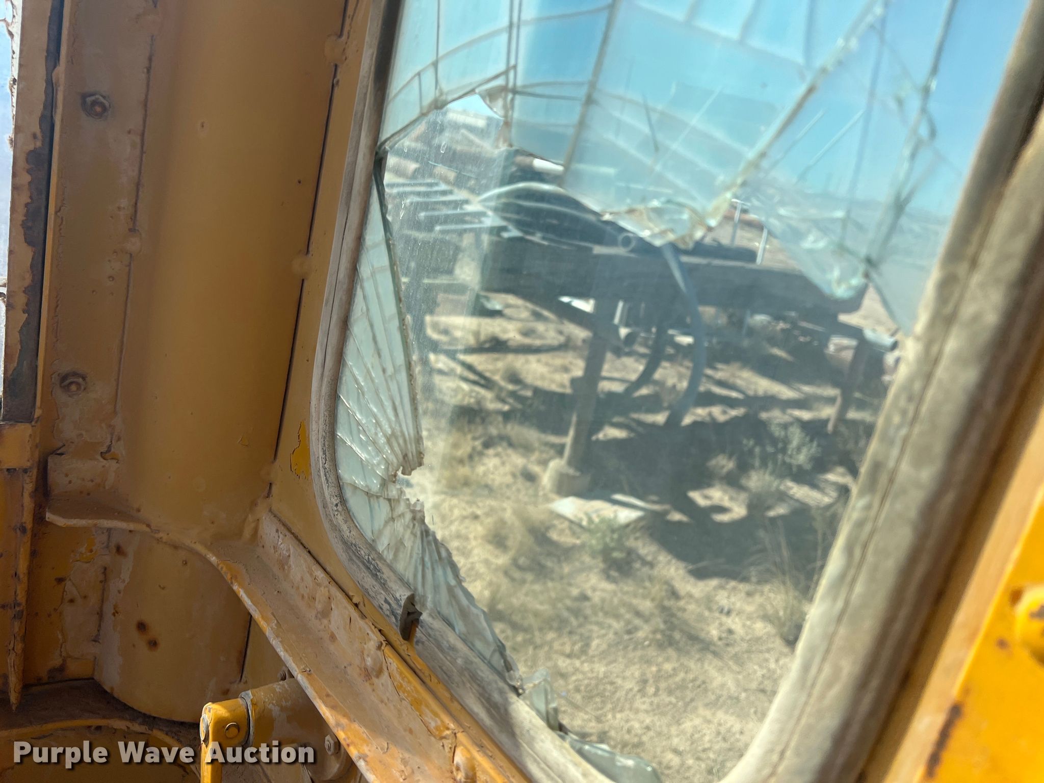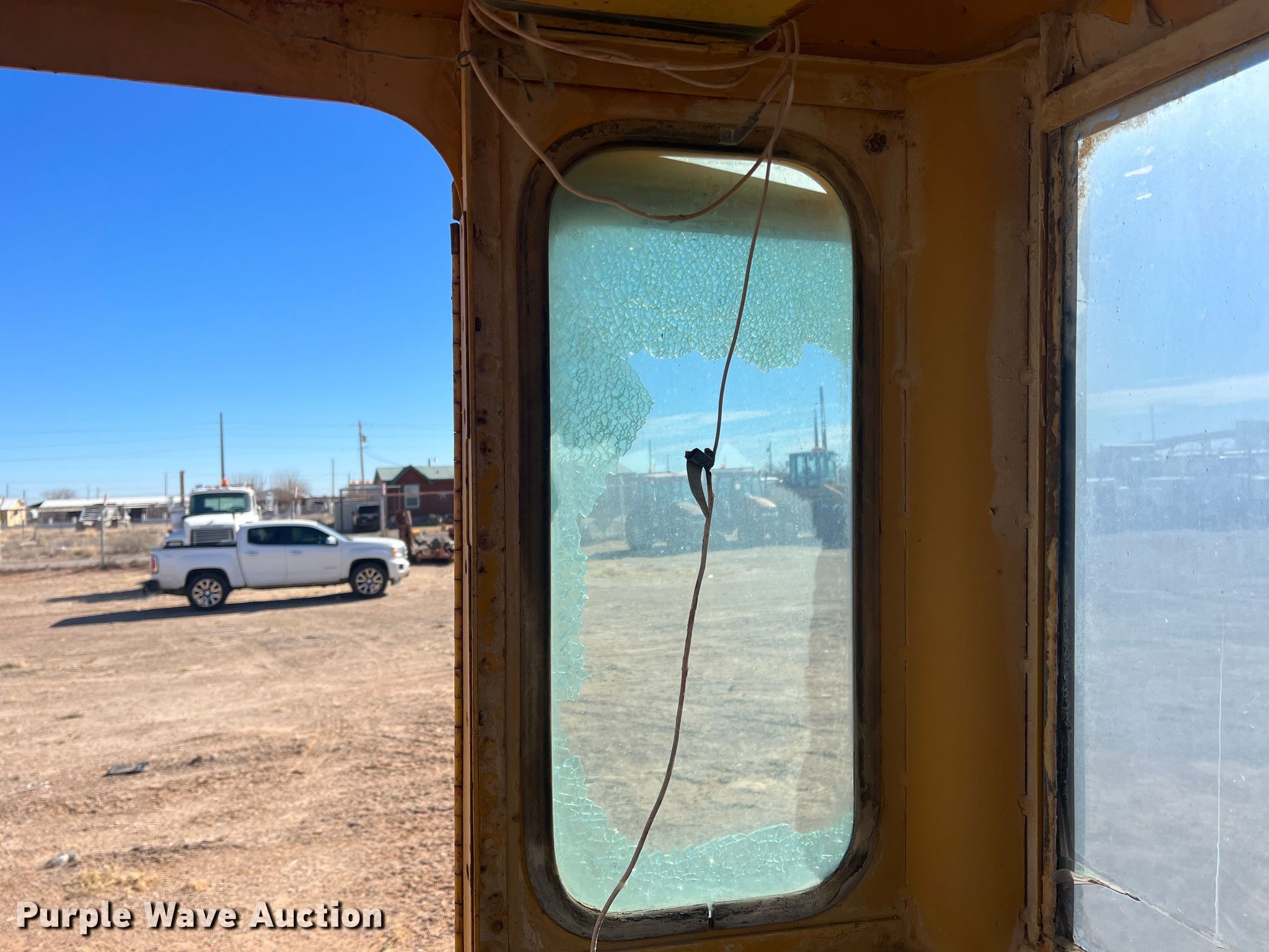 1972 Caterpillar 120 rigid frame motor grader. Hours: Unknown, Serial: 10R2156. Engine Cylinders: 6, Fuel type: Diesel. Transmission Direct-drive, 6F - 2R. Operators station Enclosed cab, Hydraulic control valves: 6. Features Moldboard total length: 12'. Tires Size: 14.00R24. Notes Glass cracked, Non-operational unit. Reeves County. 1384 West F Street. Pecos, TX 79772