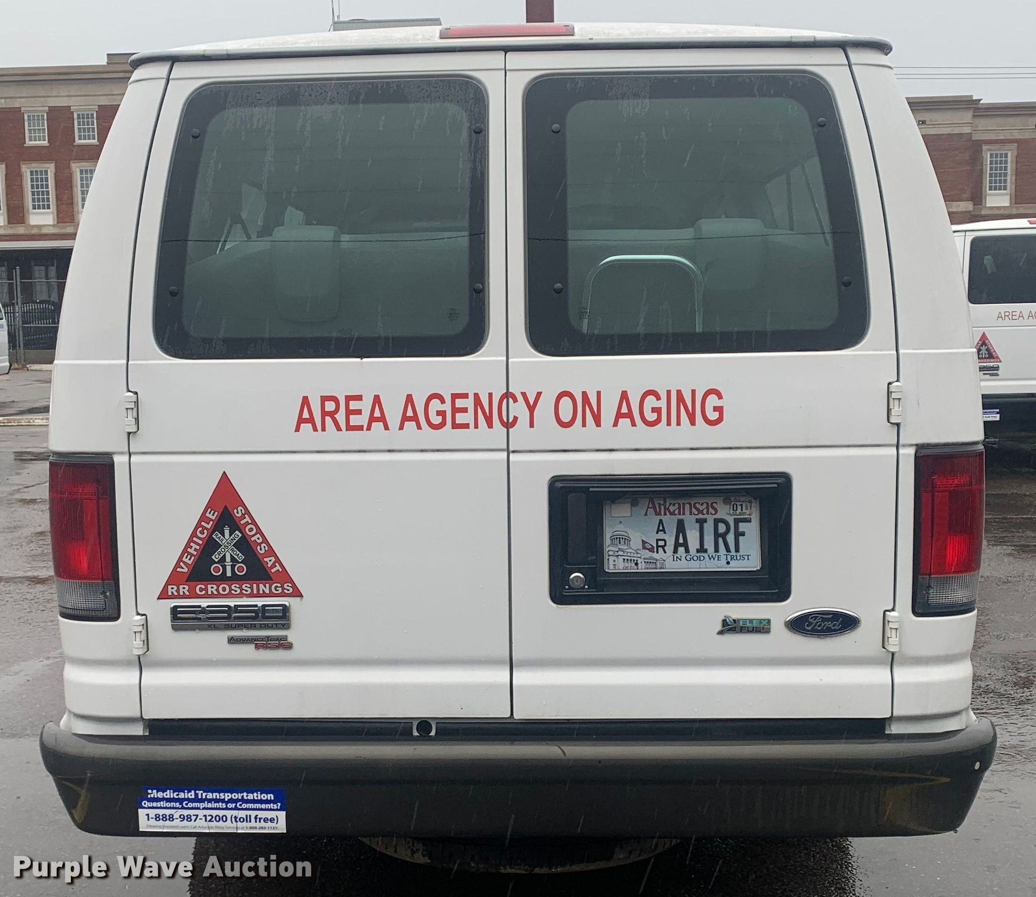 2010 Ford E350 Super Duty XL van. Miles: 232,494 on odometer, VIN: 1FBSS3BL4ADA01954. Engine Displacement: 5.4L V8 SOHC, Cylinders: 8, Fuel type: Gas. Transmission Automatic. Interior AC, Heat. Tires Size: LT245/75R16. Notes Dash warning indicator: TPMS, Dead battery, Catalytic converter missing. Arkansas title. Title distribution may be delayed up to 14 days from verification of funds. Area Agency on Aging of Western Arkansas, Inc.. 524 Garrison Ave. Fort Smith, AR 72901
