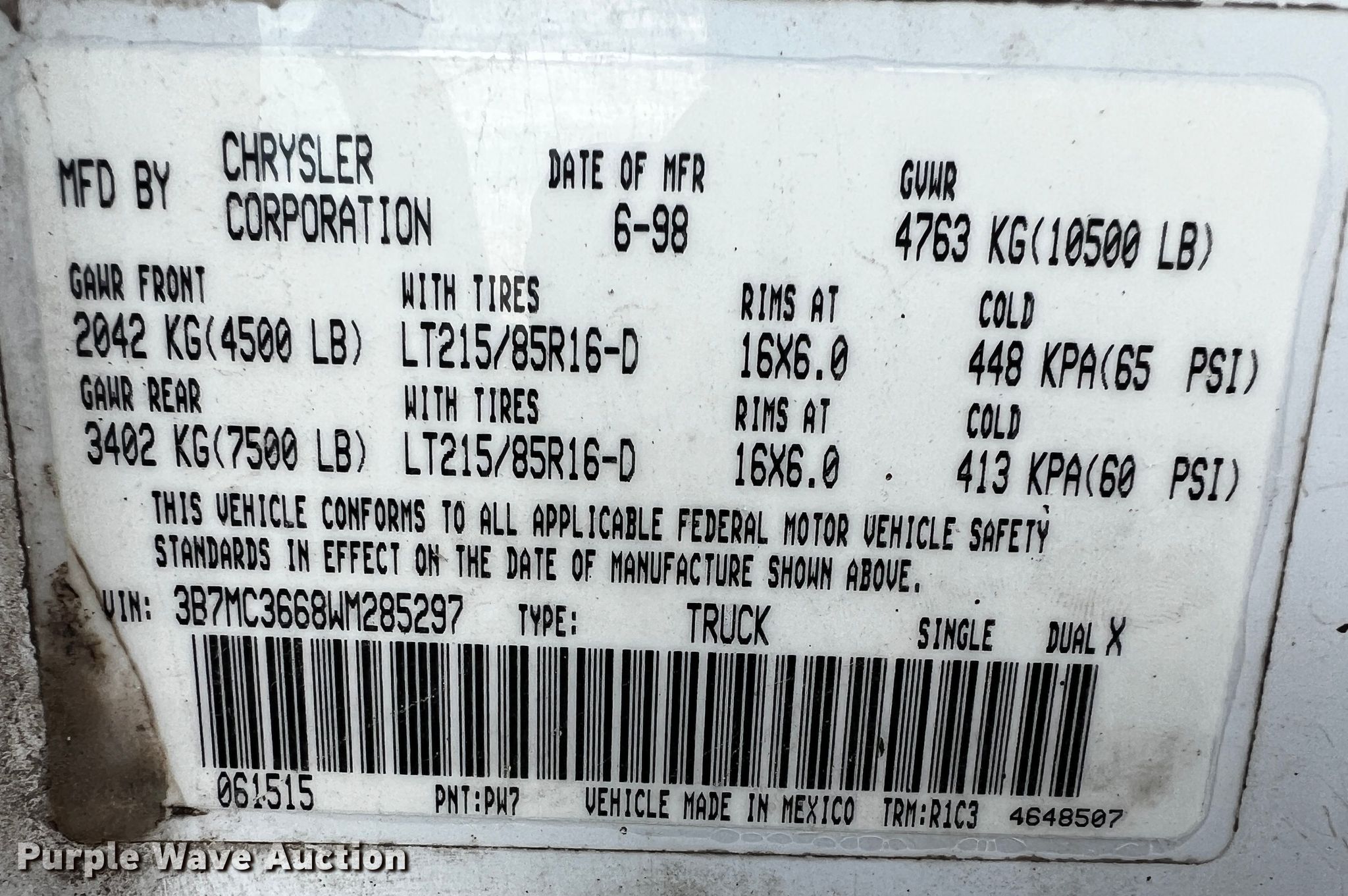 Purple Wave is selling a used 3/4 or 1 Ton Pickup or Van in Texas. This item is a 1998 Dodge Ram 3500 pickup truck cab and chassis with the following: Miles: 155,978 on odometer, VIN: 3B7MC3668WM285297, Unit #: 9