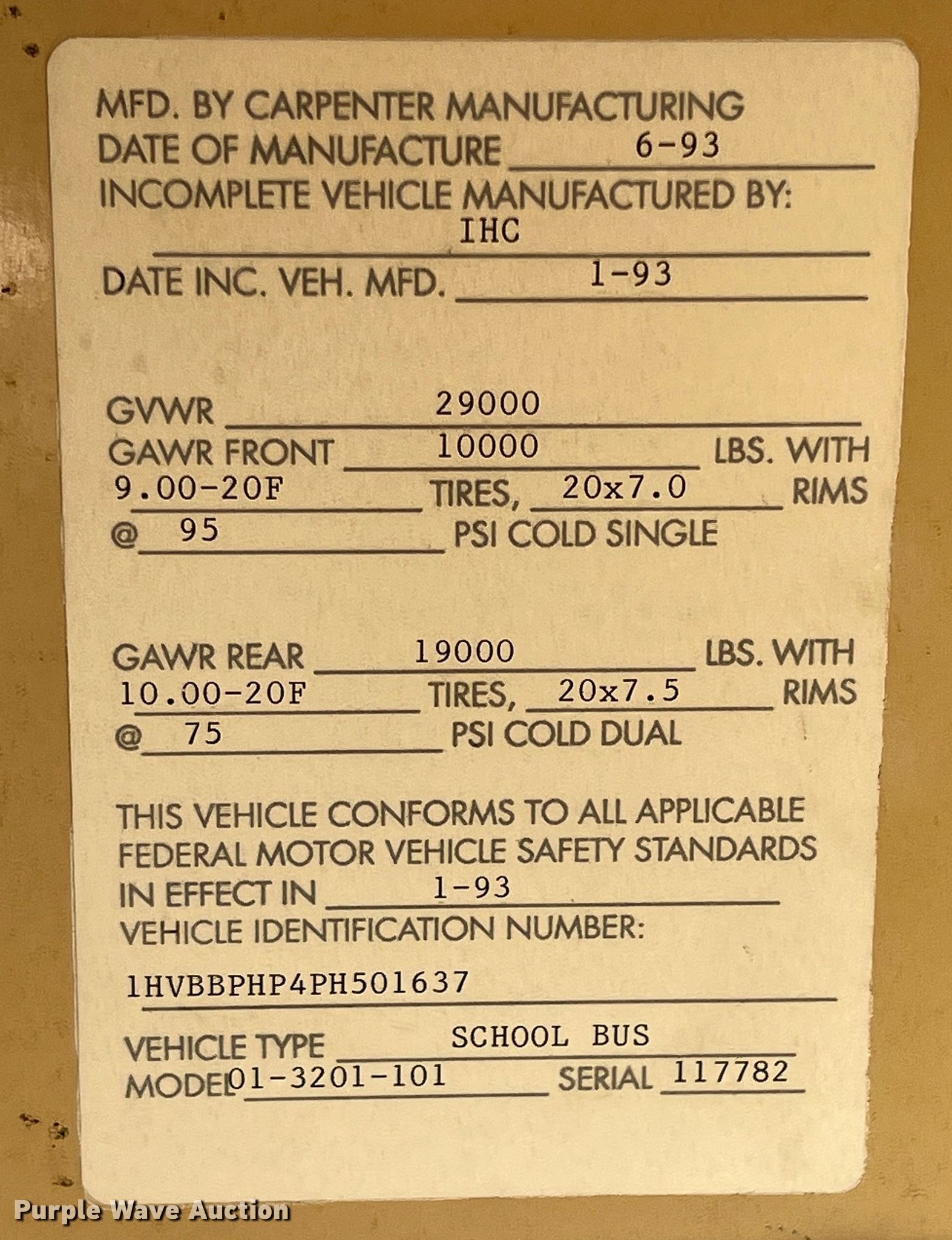 1993 International 3800 school bus. Miles: 77,759 on odometer, VIN: 1HVBBPHP4PH501637, Unit #: 48. Engine Displacement: 5.9L, Cylinders: 6, Fuel type: Diesel. Transmission Automatic. Chassis Axles: Single, Suspension: Spring, Brakes: Hydraulic, GVWR: 29,000 lbs. Interior Heat, Heated mirrors, Passengers: 71. Tires Size: 11R22.5. Notes Emergency egress missing. Oklahoma title. Title distribution may be delayed up to 14 days from verification of funds. Altus Public Schools. 400 N Park Lane. Altus, OK 73522