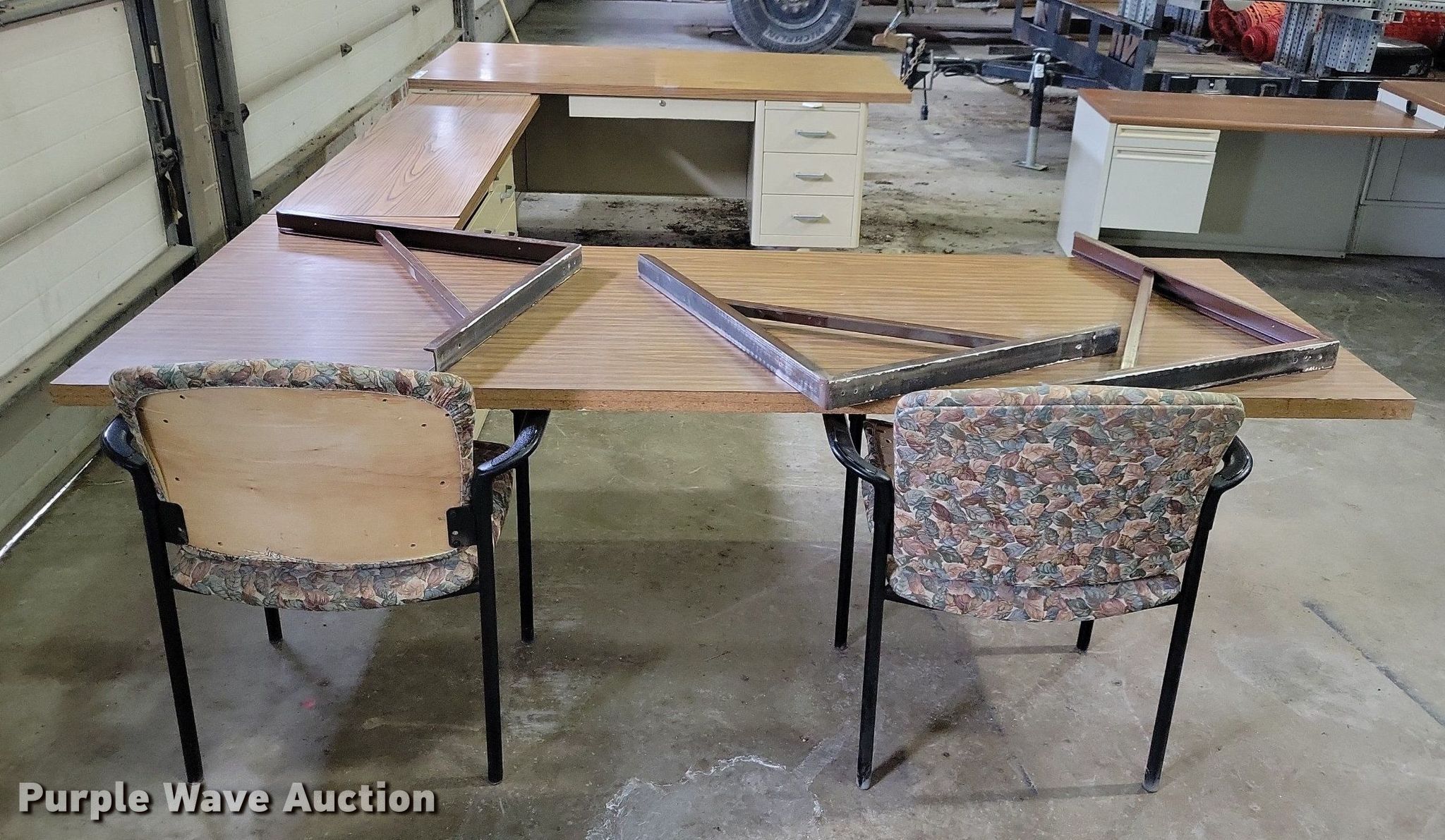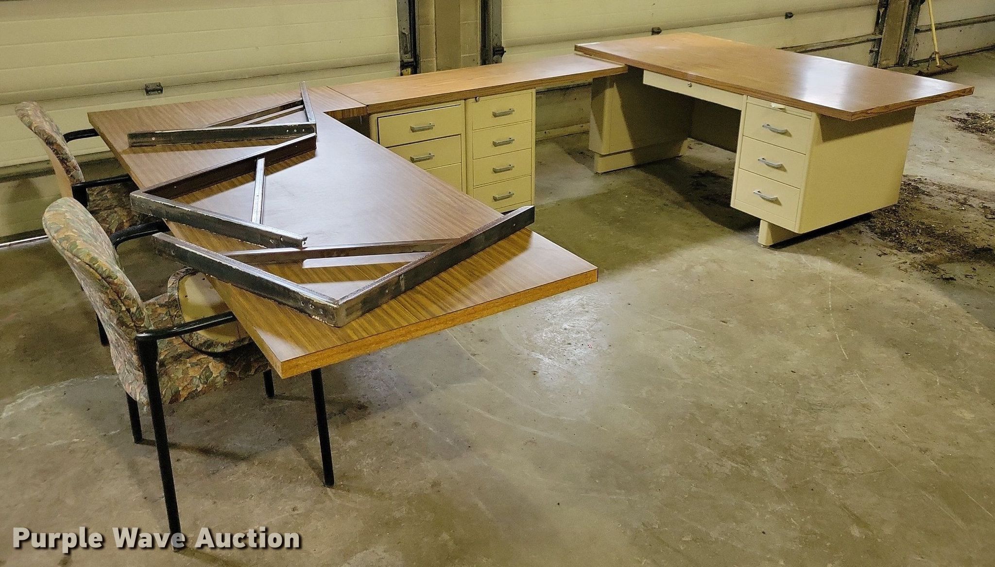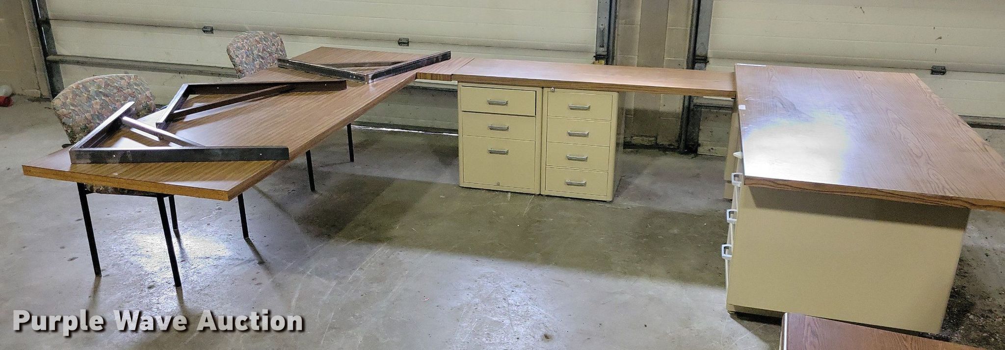Purple Wave is selling a used Office Supplies and Equip. in Iowa. This item is a Office supplies and equipment with the following: (2) chairs, (3) wall mounts, Storage drawers, U-shaped desk, 36" x 72", 18" x 60", 40"x 90", Storage cabinet