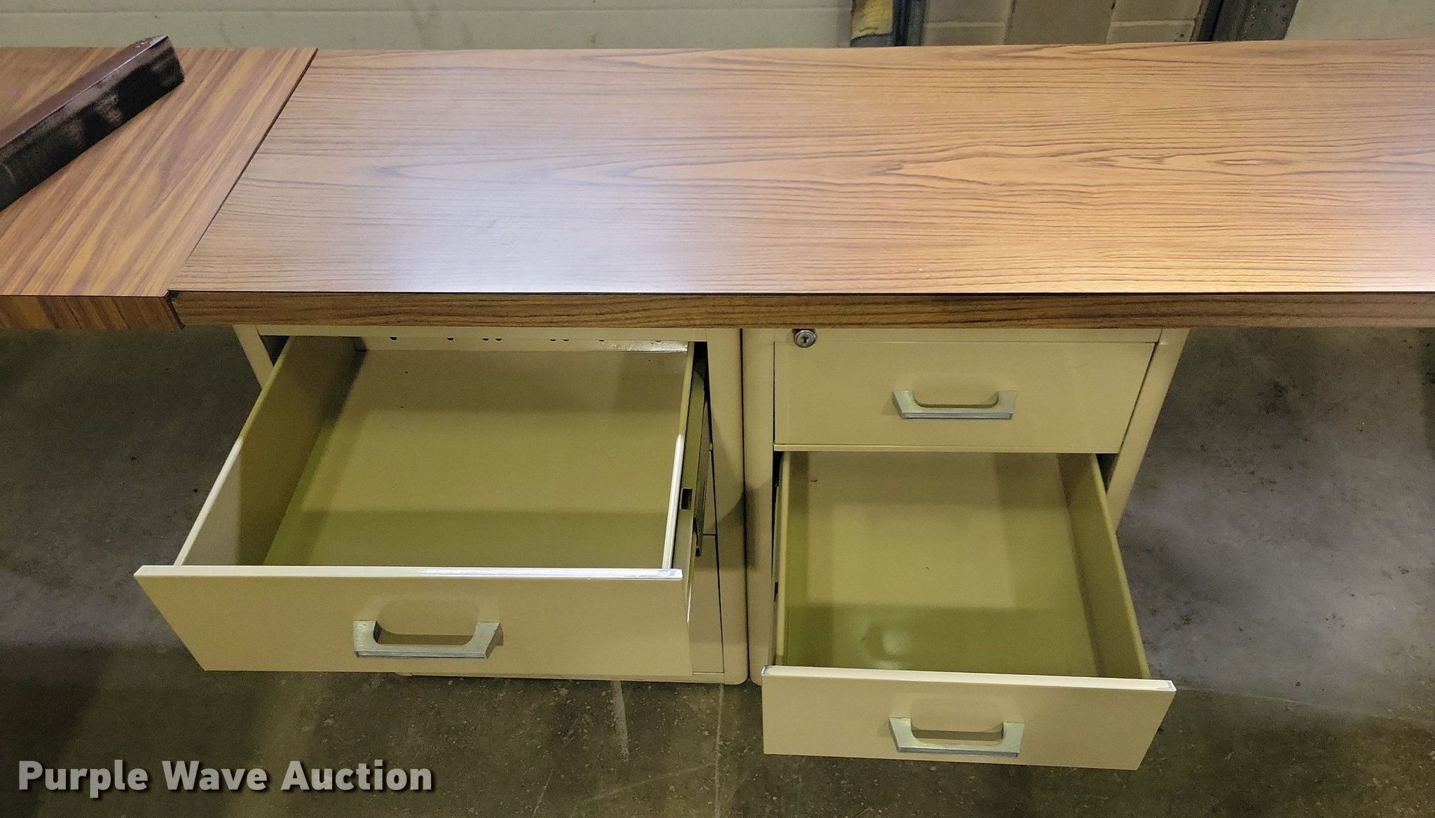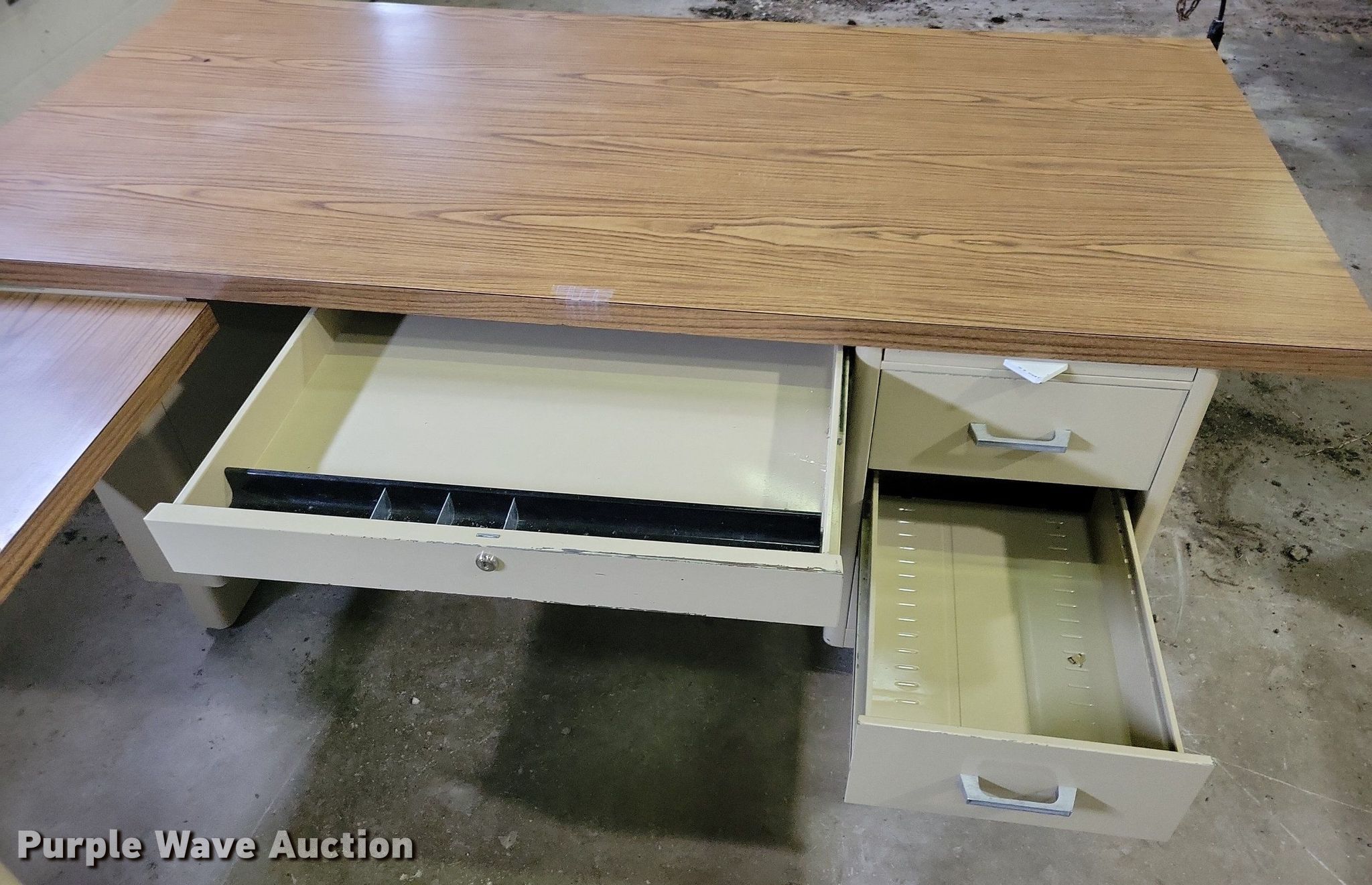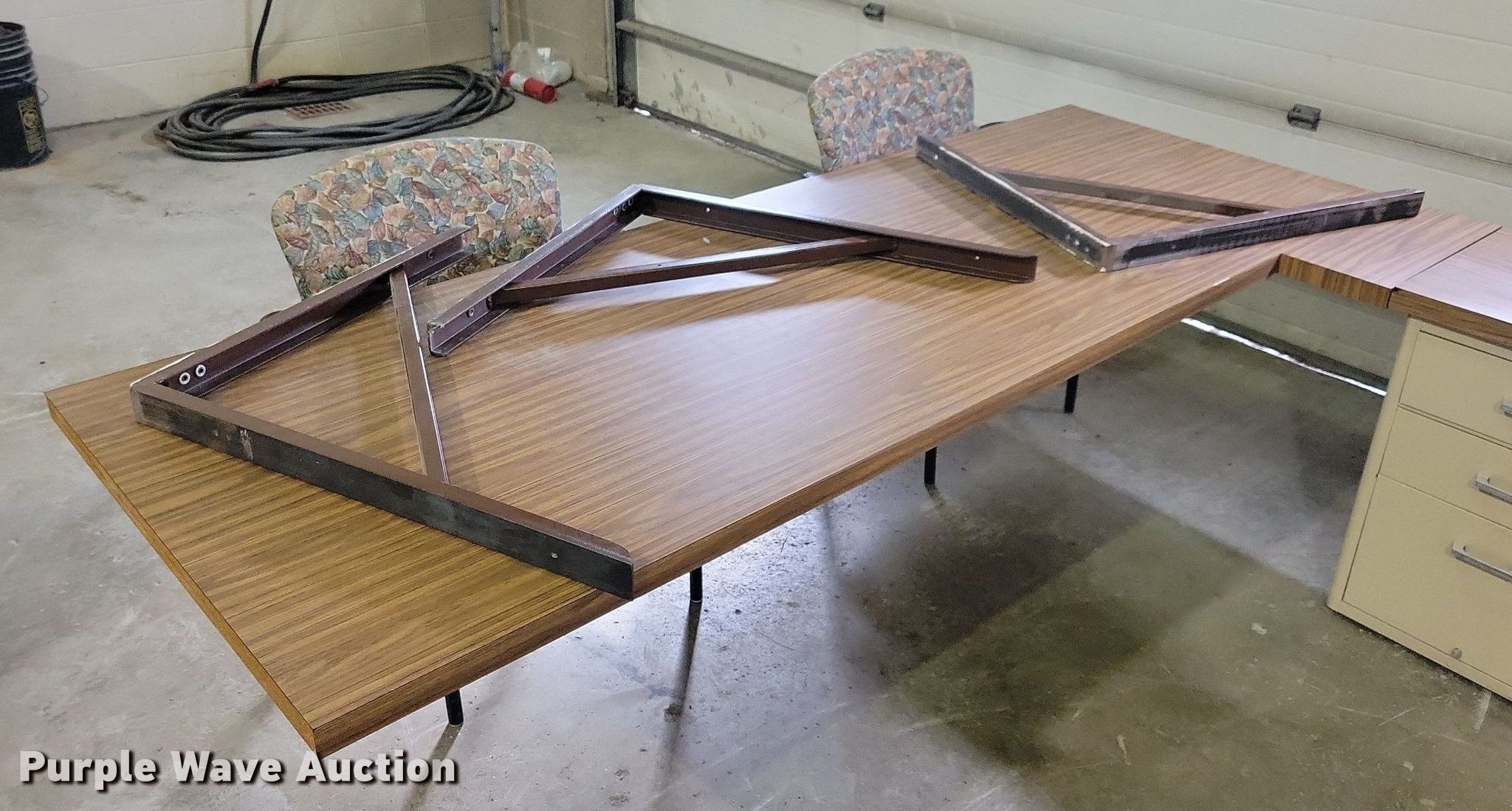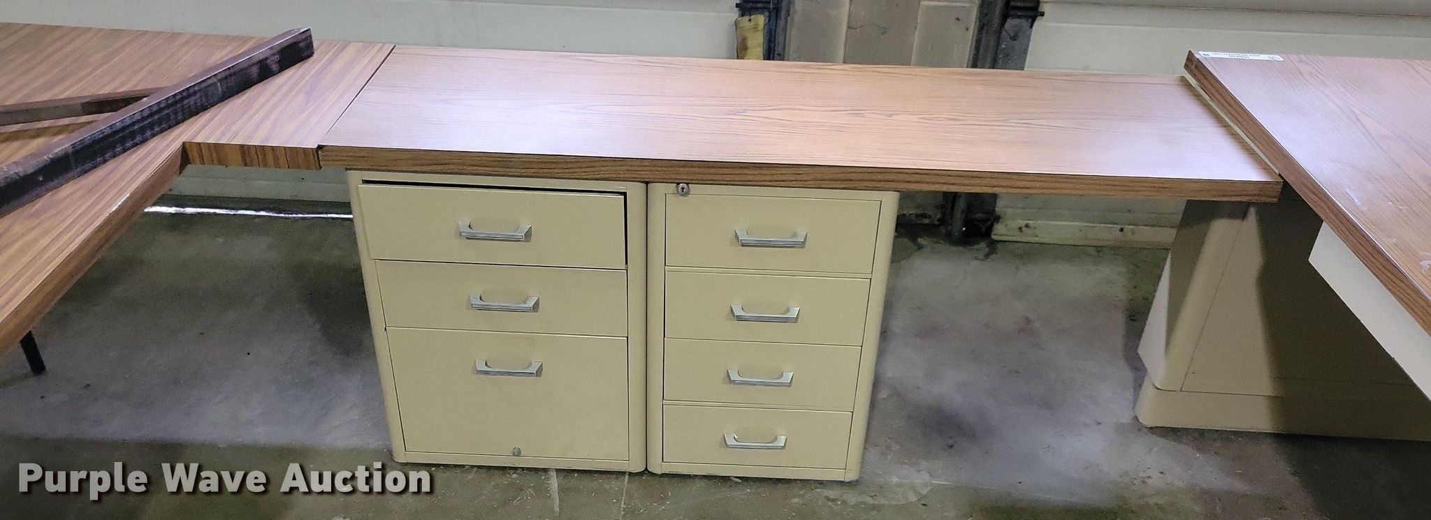 Purple Wave is selling a used Office Supplies and Equip. in Iowa. This item is a Office supplies and equipment with the following: (2) chairs, (3) wall mounts, Storage drawers, U-shaped desk, 36" x 72", 18" x 60", 40"x 90", Storage cabinet