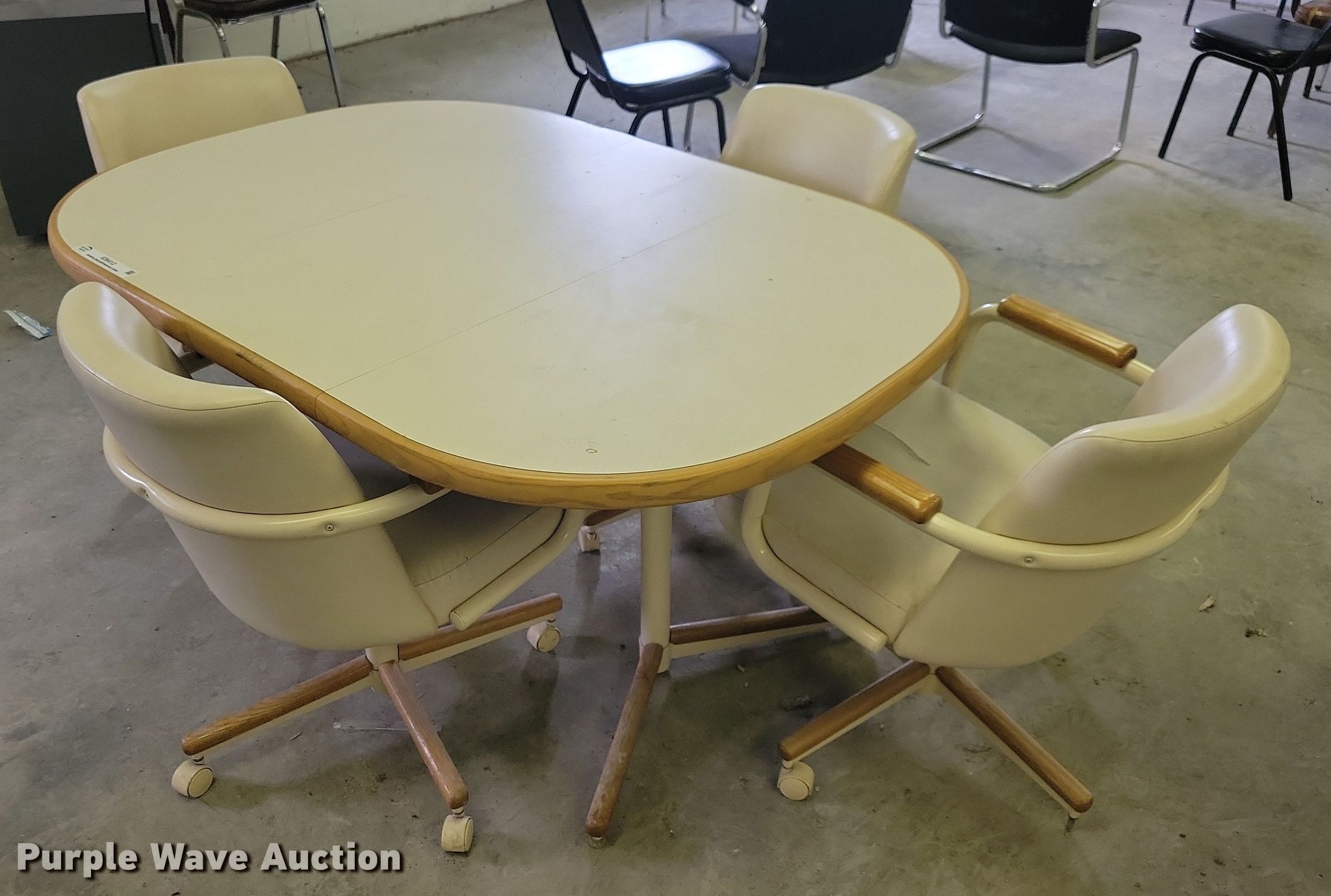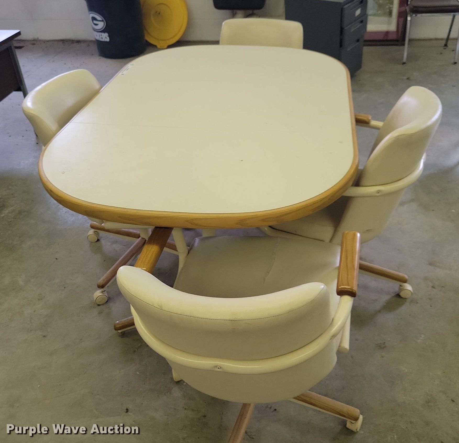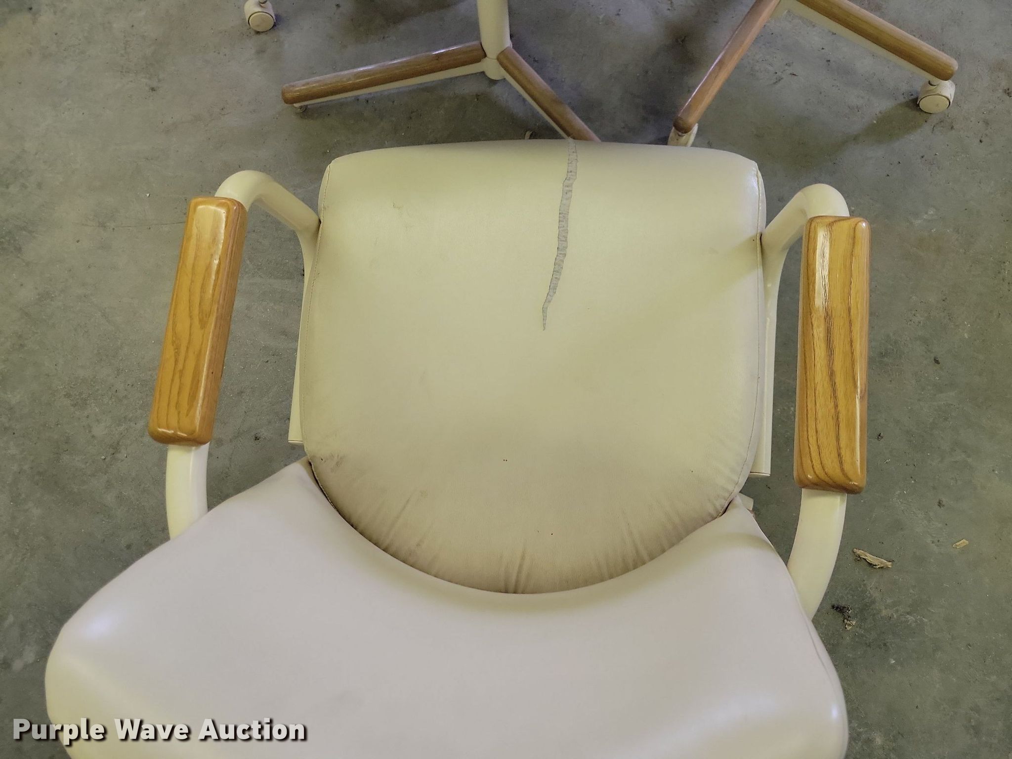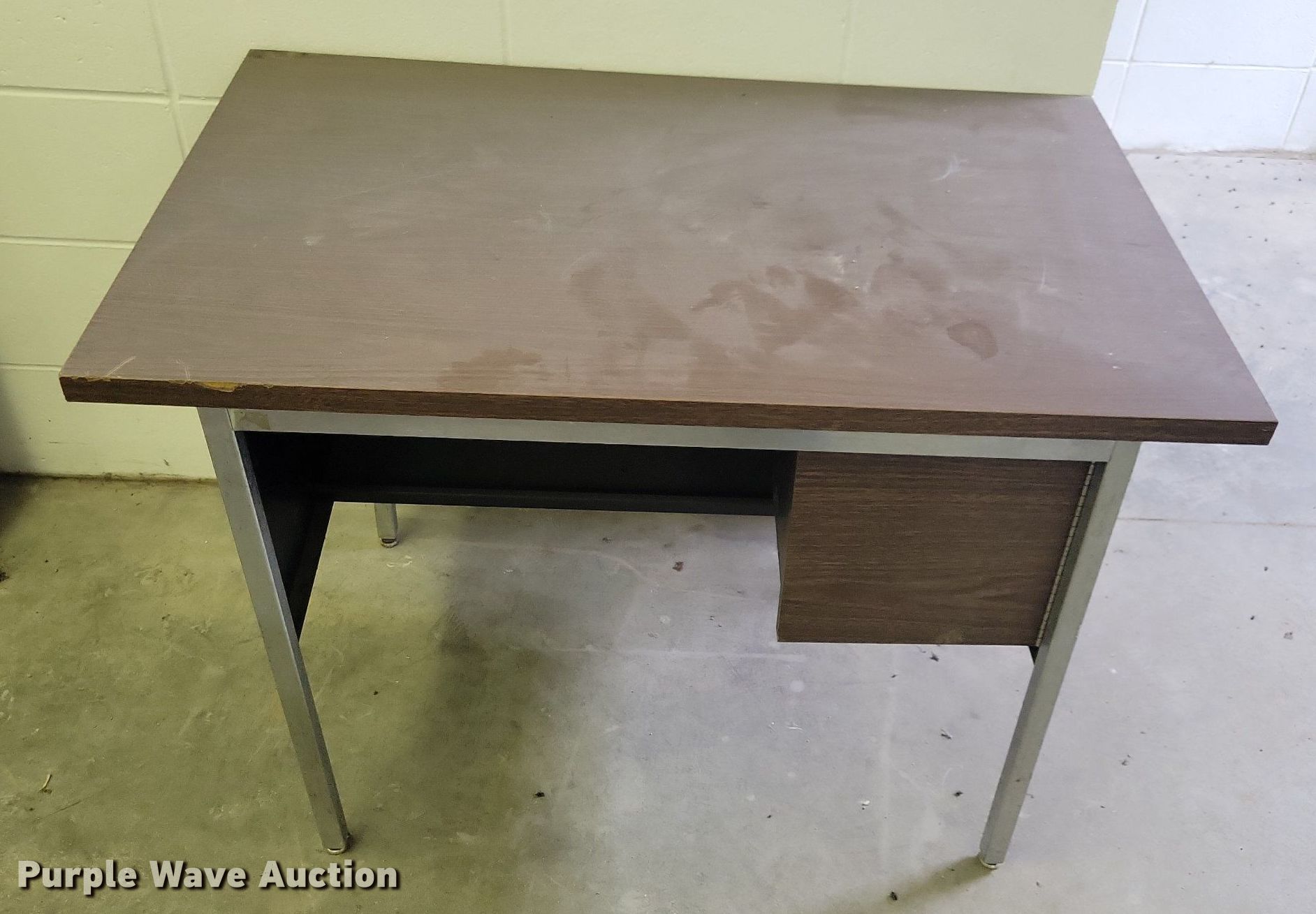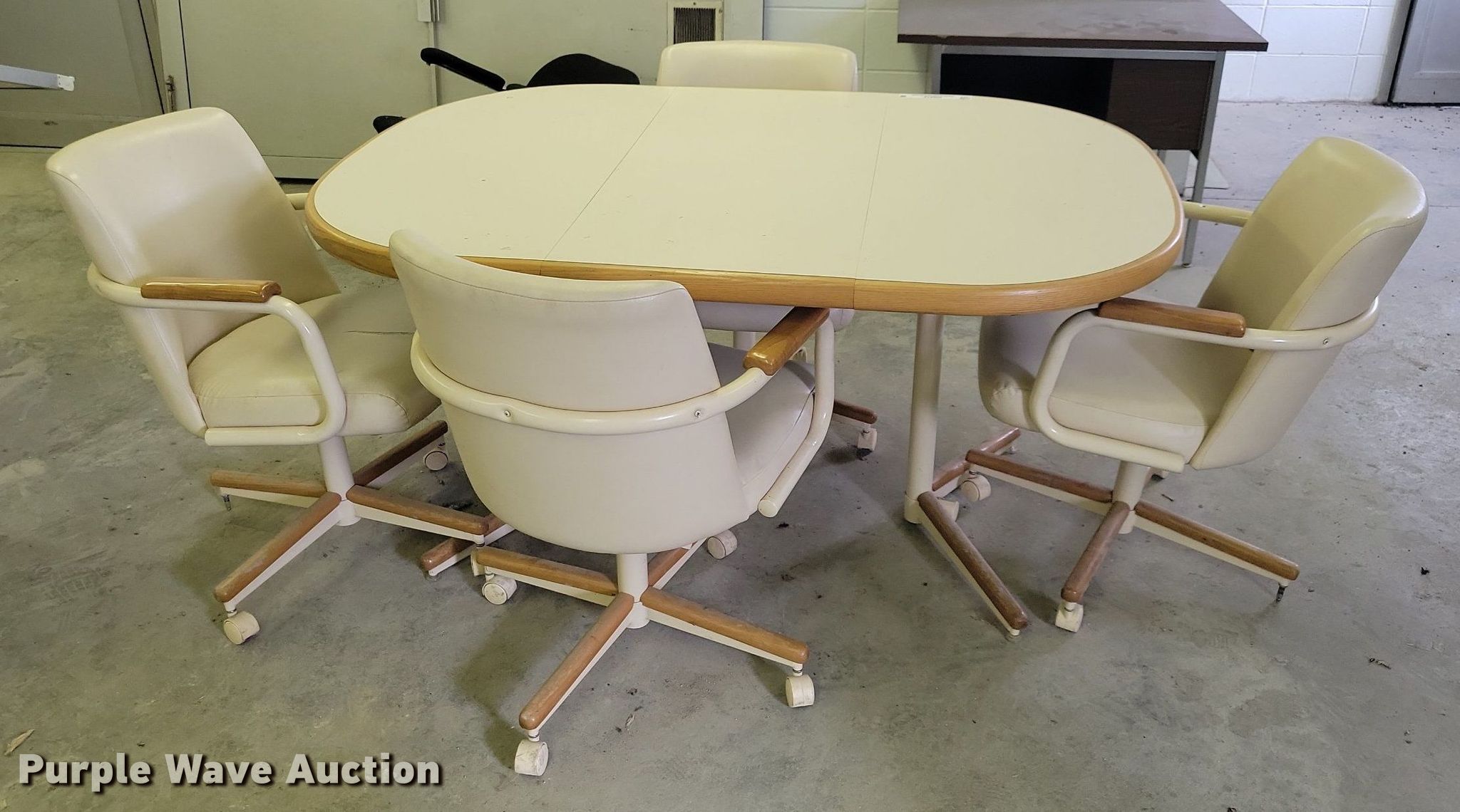 Purple Wave is selling a used Office Supplies and Equip. in Iowa. This item is a Office supplies and equipment with the following: (4) roller chairs, Table, 40" x 58", Desk, 40" x 26", File cabinet