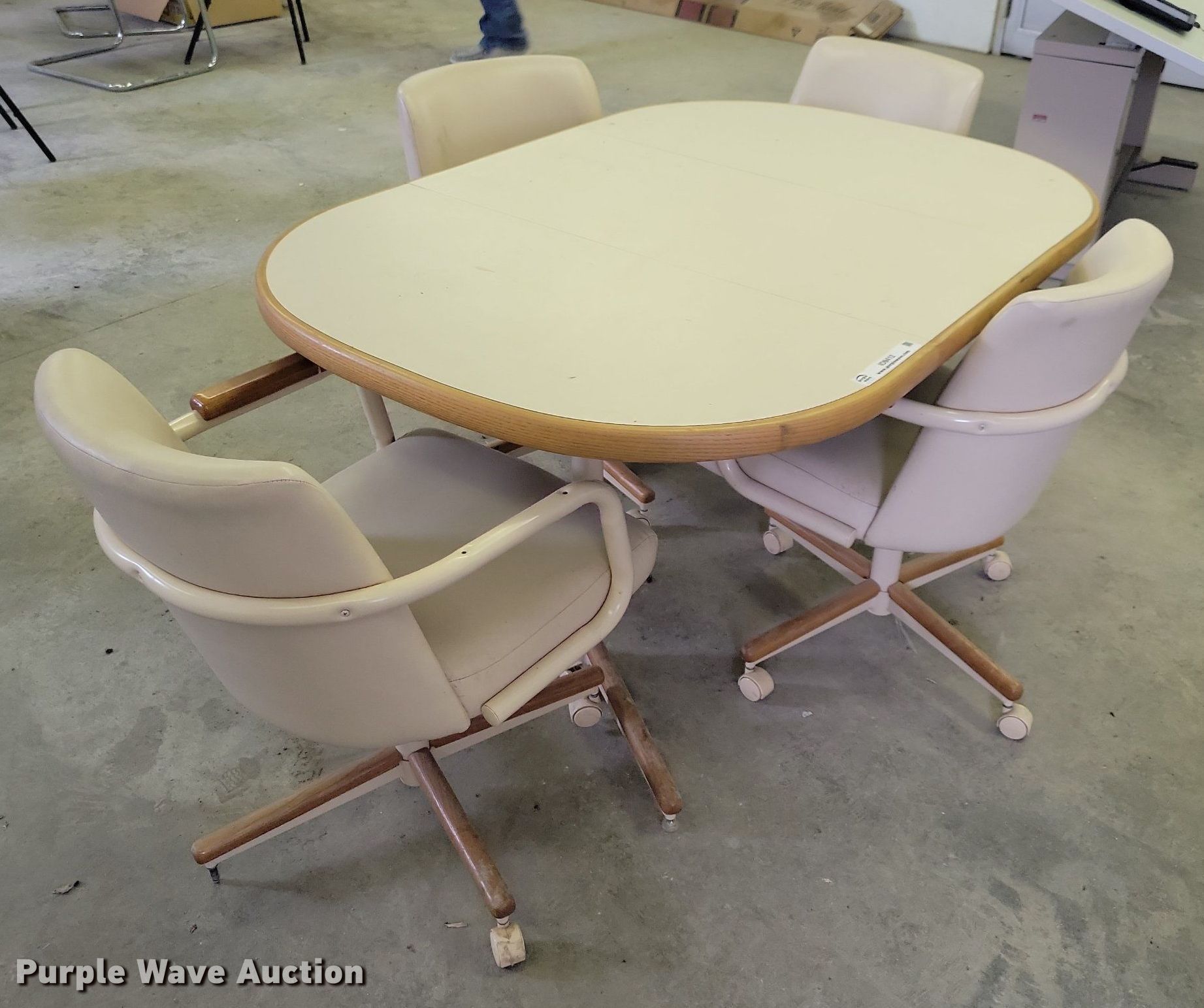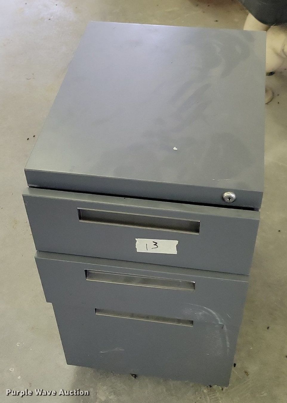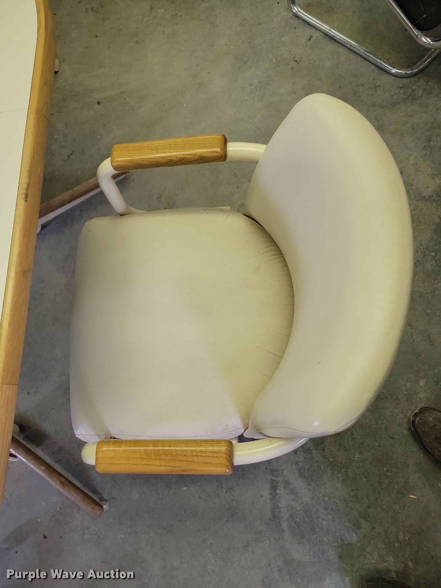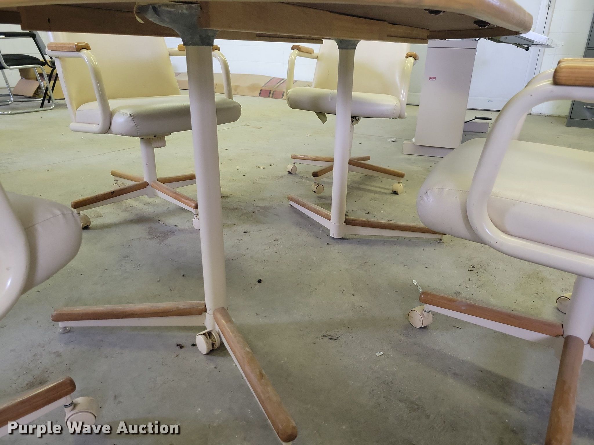 Purple Wave is selling a used Office Supplies and Equip. in Iowa. This item is a Office supplies and equipment with the following: (4) roller chairs, Table, 40" x 58", Desk, 40" x 26", File cabinet