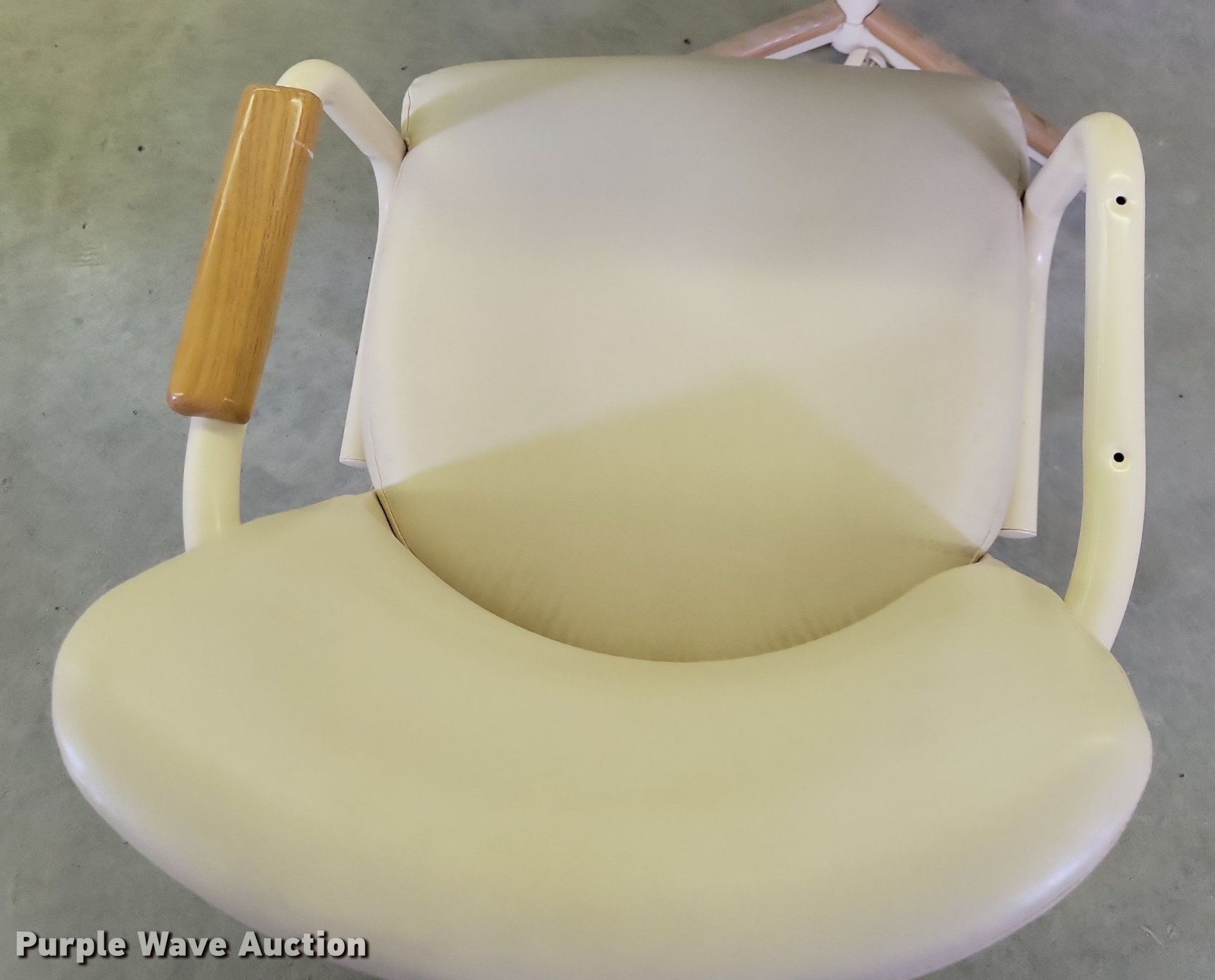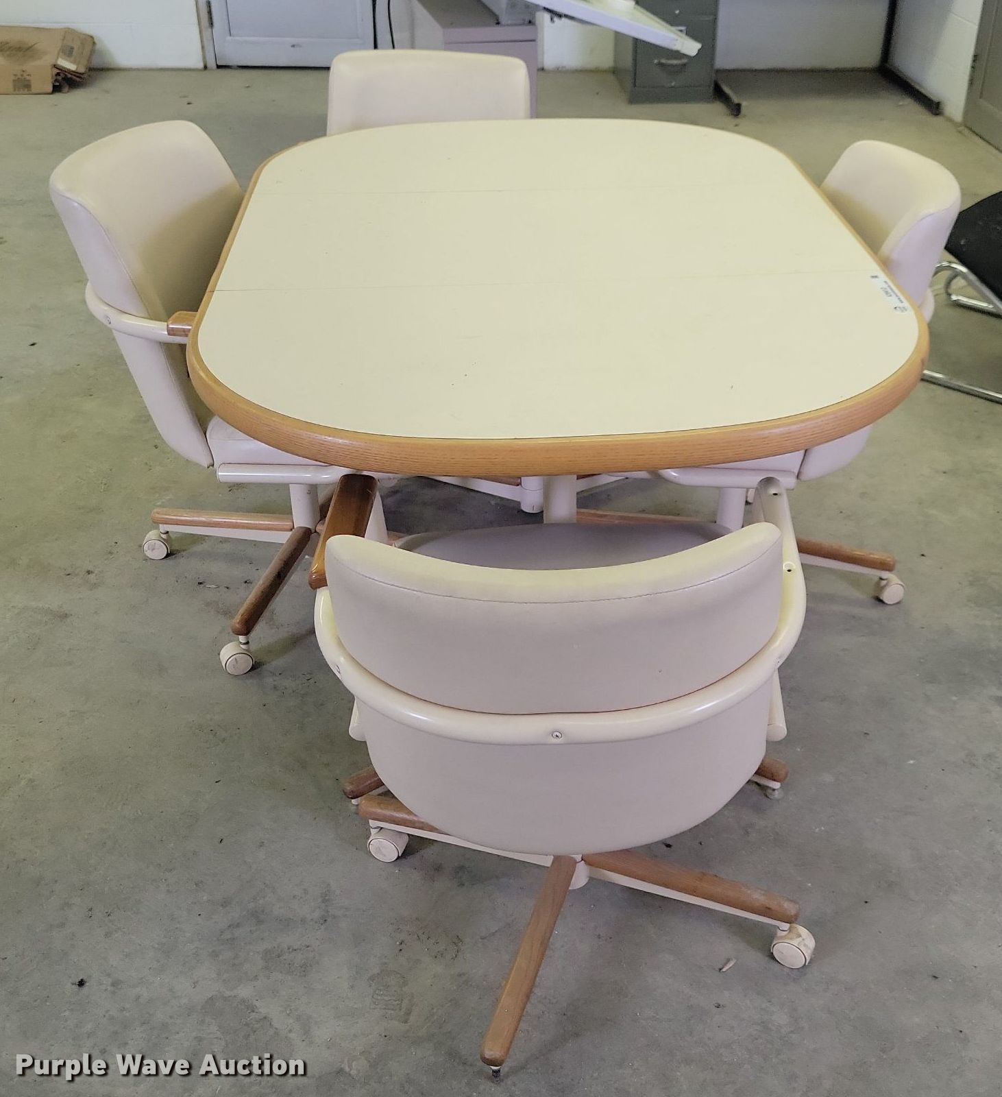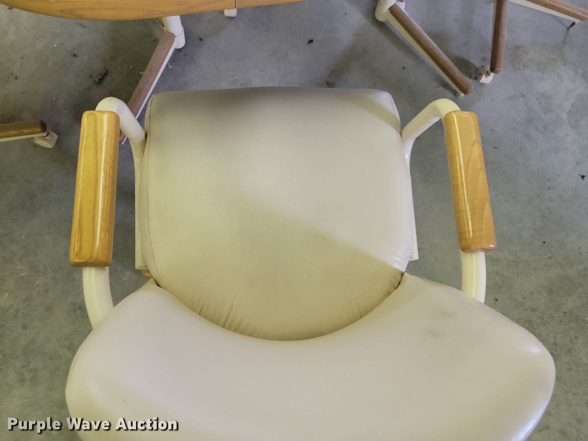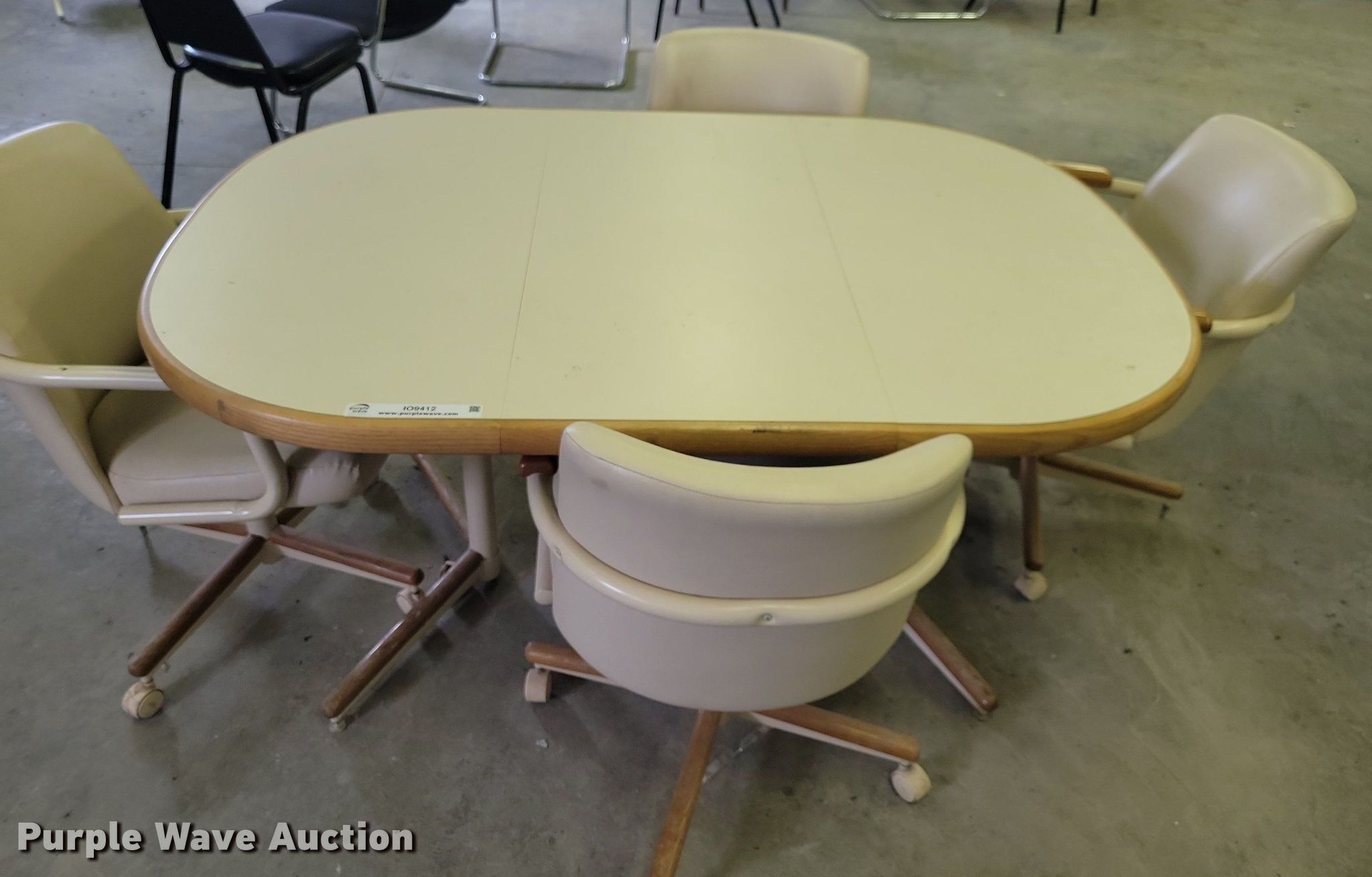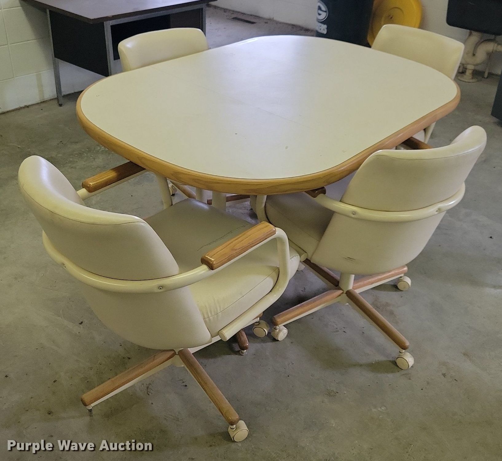 Purple Wave is selling a used Office Supplies and Equip. in Iowa. This item is a Office supplies and equipment with the following: (4) roller chairs, Table, 40" x 58", Desk, 40" x 26", File cabinet