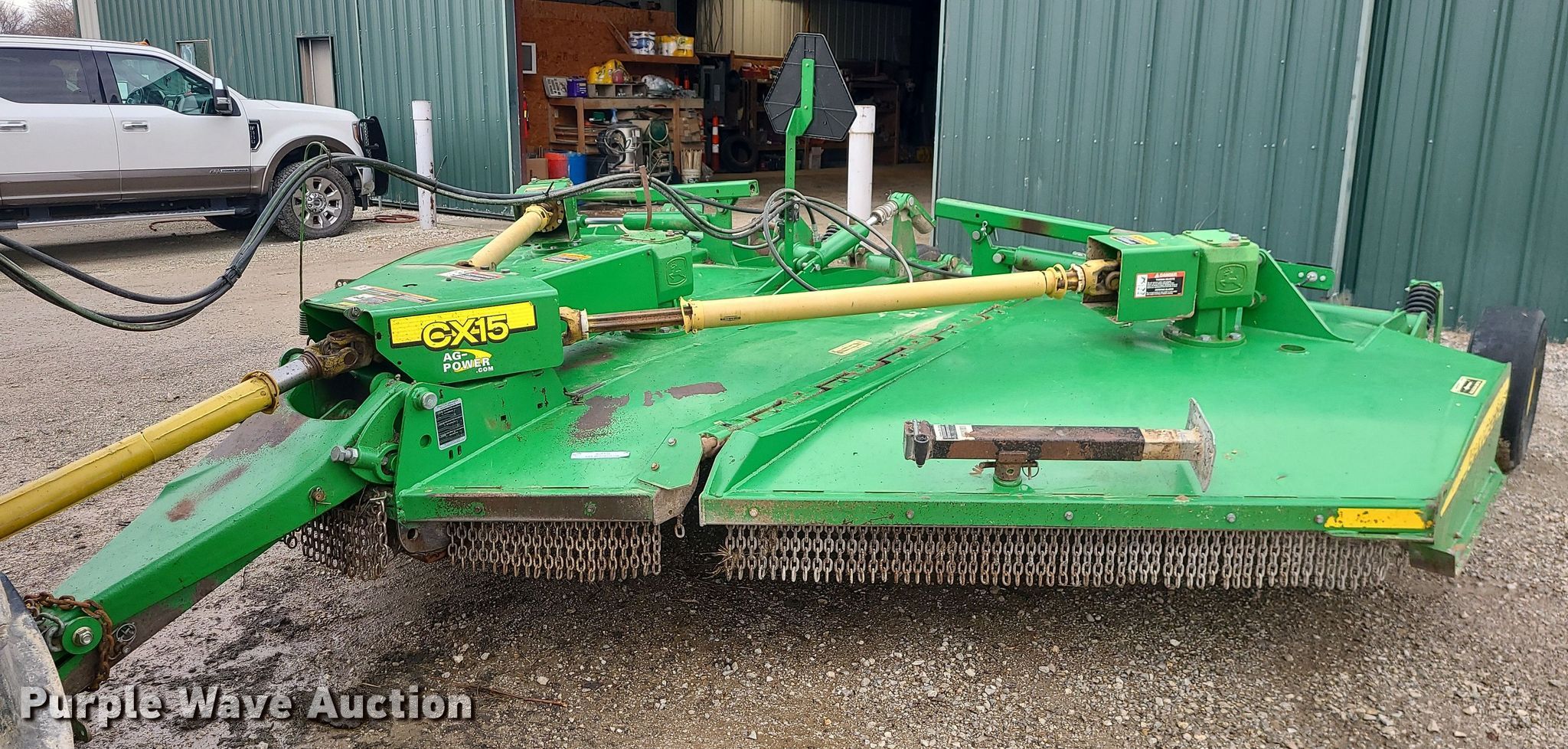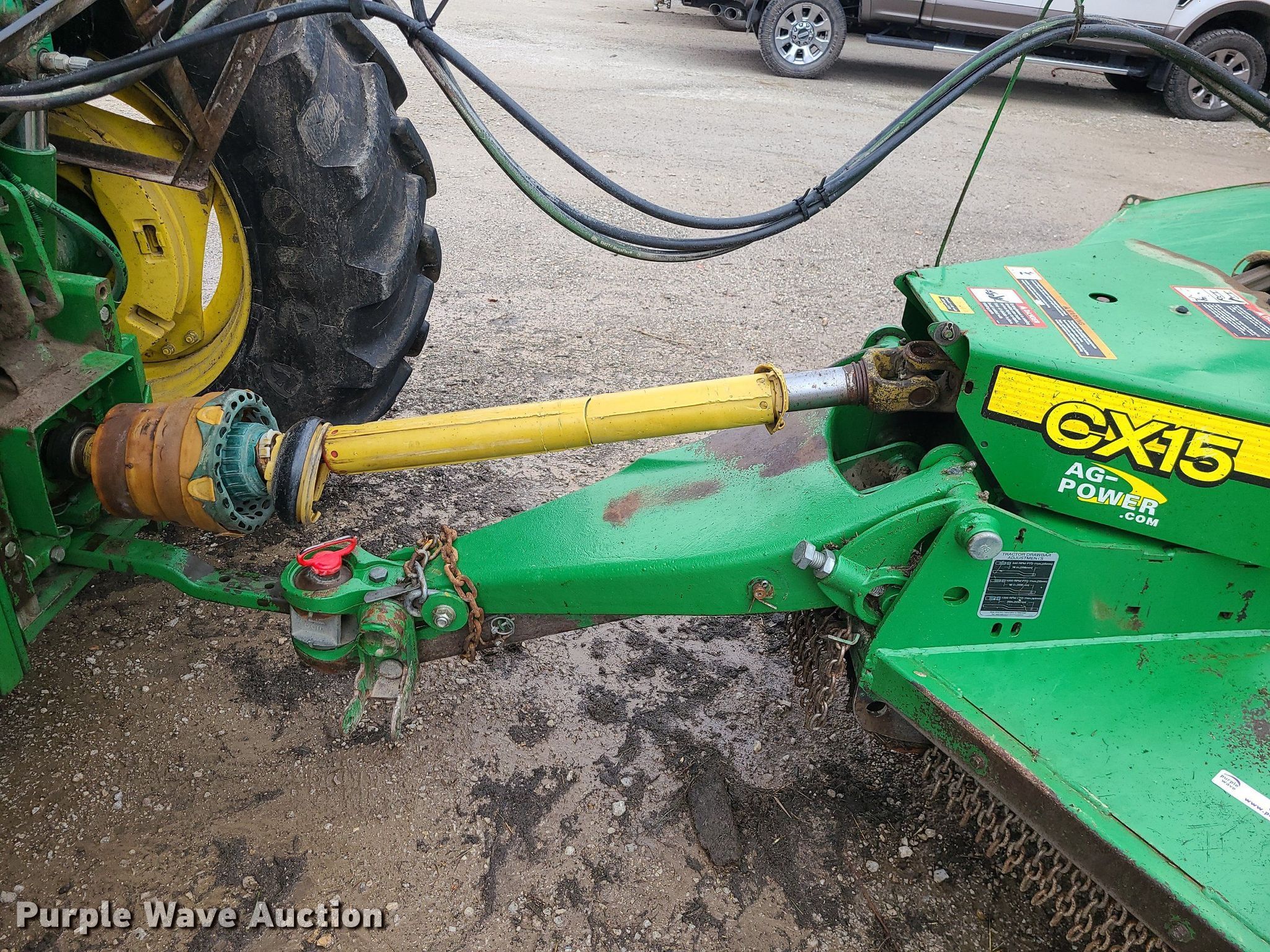 John Deere CX15 batwing rotary mower. Serial: 1P0CX15EAGF048589. Features Width: 15', Hydraulic lift, Hydraulic fold, PTO: 540. Tires Size: 26x9.00-14.5. Henry County, MO. 1316 N 3rd Street. Clinton, MO 64735