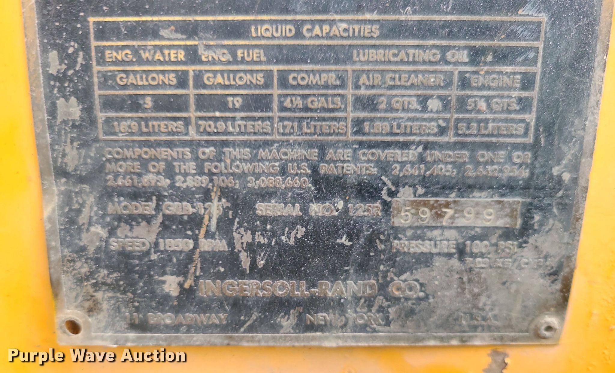 Ingersoll Rand Gyro-Flo 125 air compressor. Hours: 1,115 on meter, Serial: 59799. Engine Continental G193, Cylinders: 4, Fuel type: Gas. Features Air compressor PSI: 100. Trailer 11' L x 6" W, Ball hitch size: 2 5/16", Suspension: Spring, Axles: Single, Tire size: 225/75R15. Transfer of ownership documentation will be a bill of sale. Henry County, MO. 1316 N 3rd Street. Clinton, MO 64735