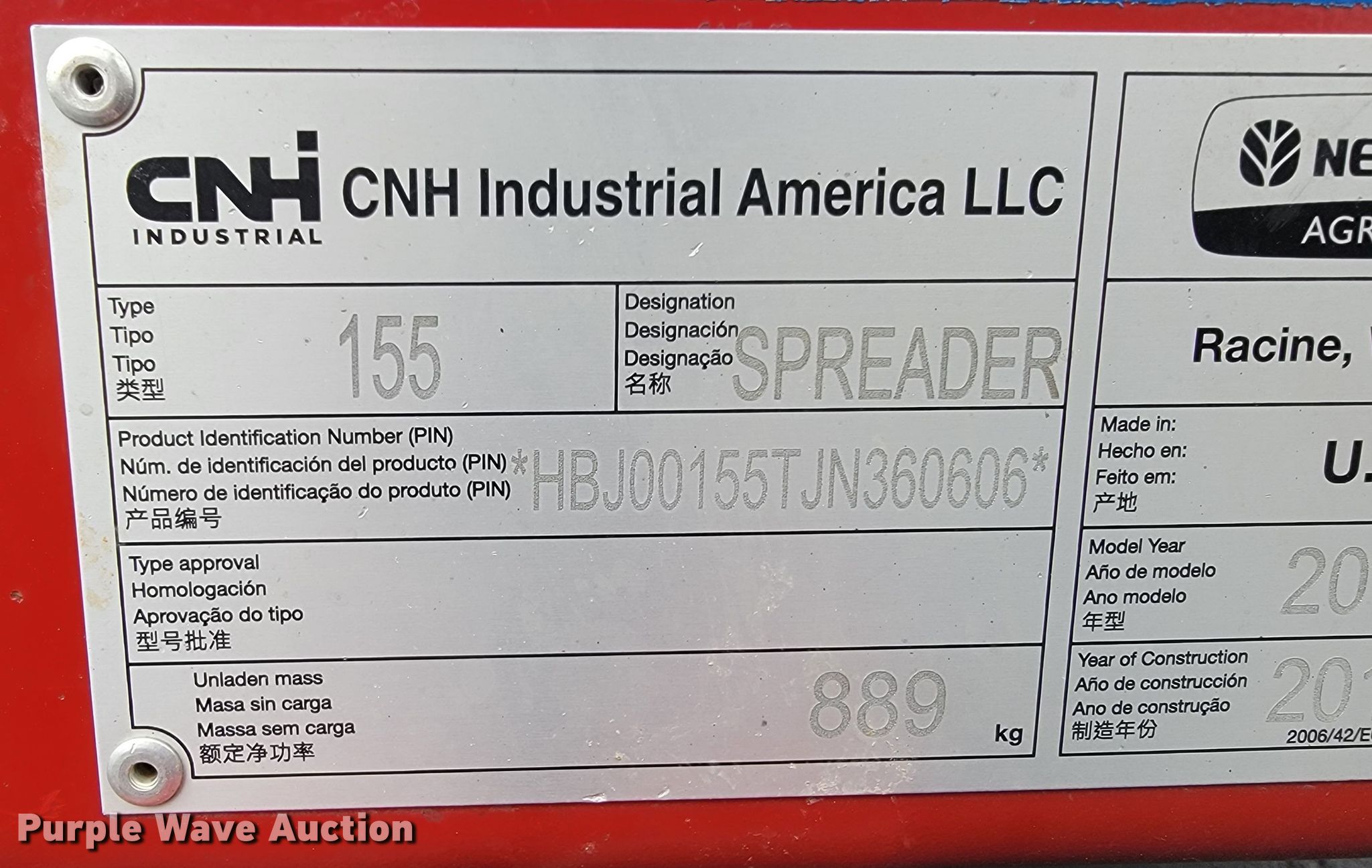Purple Wave is selling a used Manure Spreader in Missouri. This item is a 2019 New Holland 155 manure spreader with the following: Serial: HBJ00155TJN360606