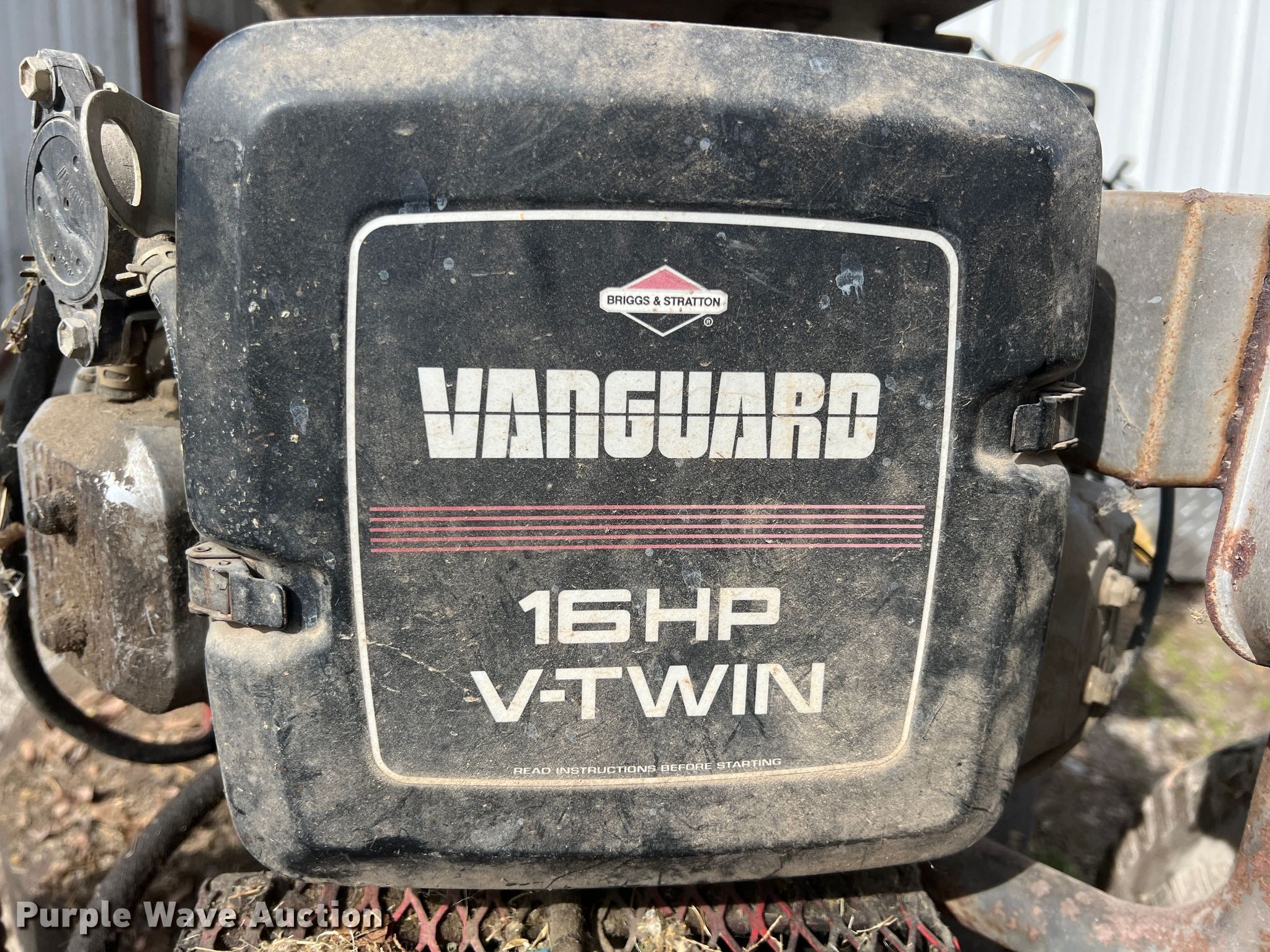 Heckendorn Hydro lawn mower. Cutting width: 36", Serial: 9806020. Engine Vanguard V-Twin, Cylinders: 1, Fuel type: Gas, HP: 16. Transmission Hydrostatic. Tires Front: 4.80/4.00-8, Rear: 18x6.50-8. City of Neodesha. 1200 W Granby. Neodesha, KS 66757