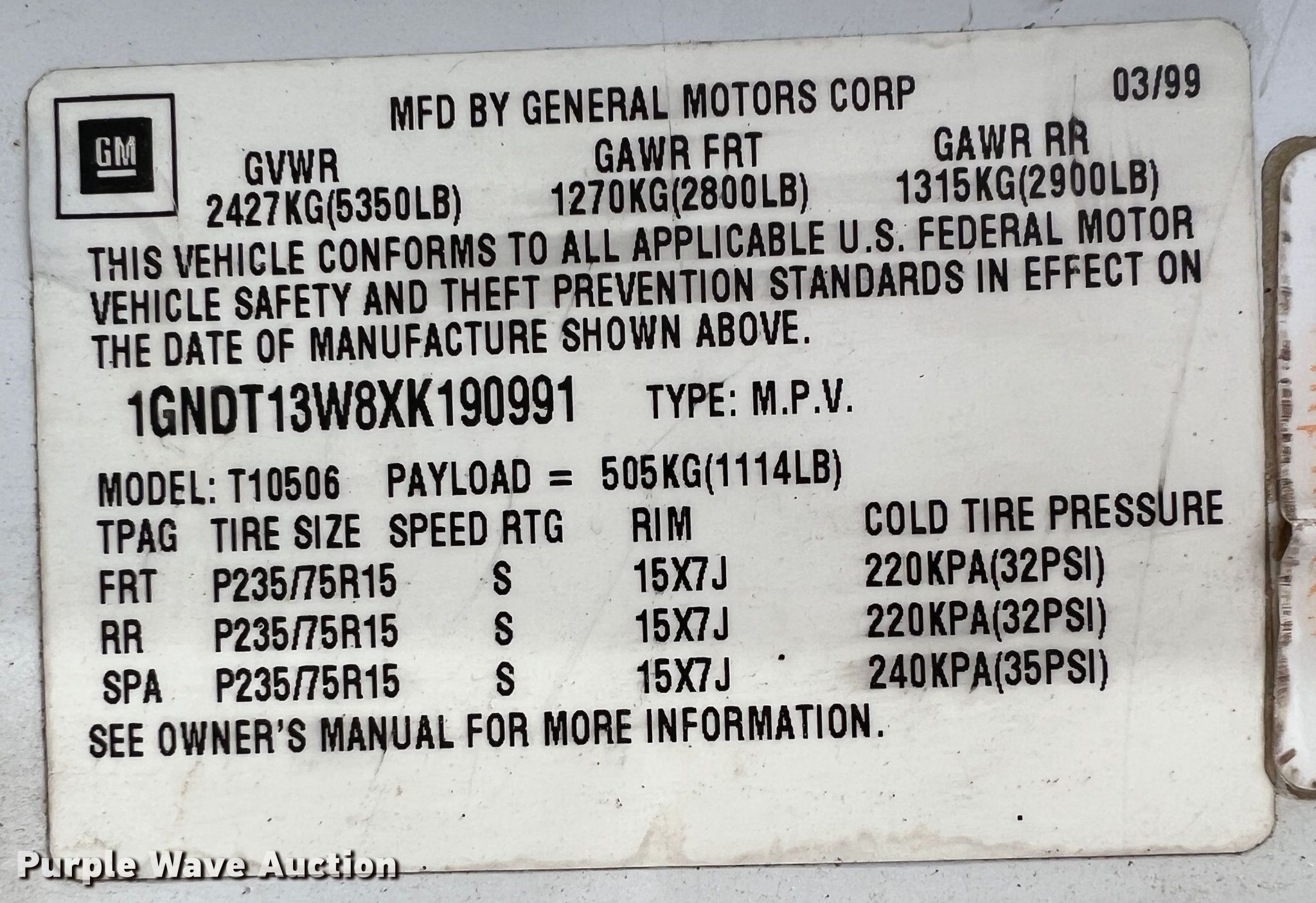 - VIN: 1GNDT13W8XK190991
