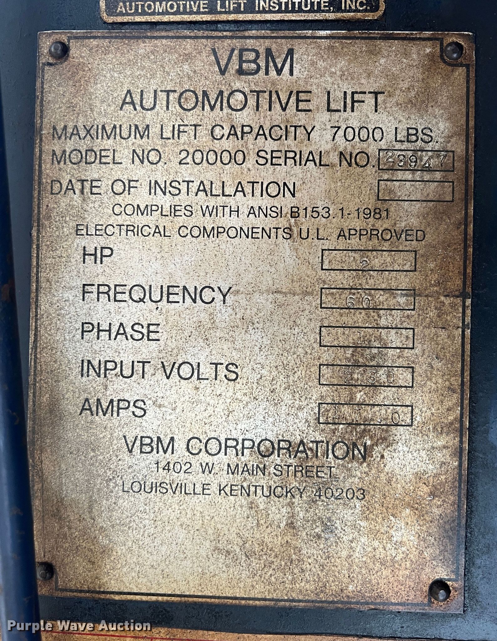 VBM 20000 automotive lift. 7000 lbs capacity, 2 HP, Single phase, 230V, Serial: 23947. Notes Trailer not included, Unknown operating condition. City of Neodesha. 1200 W Granby. Neodesha, KS 66757