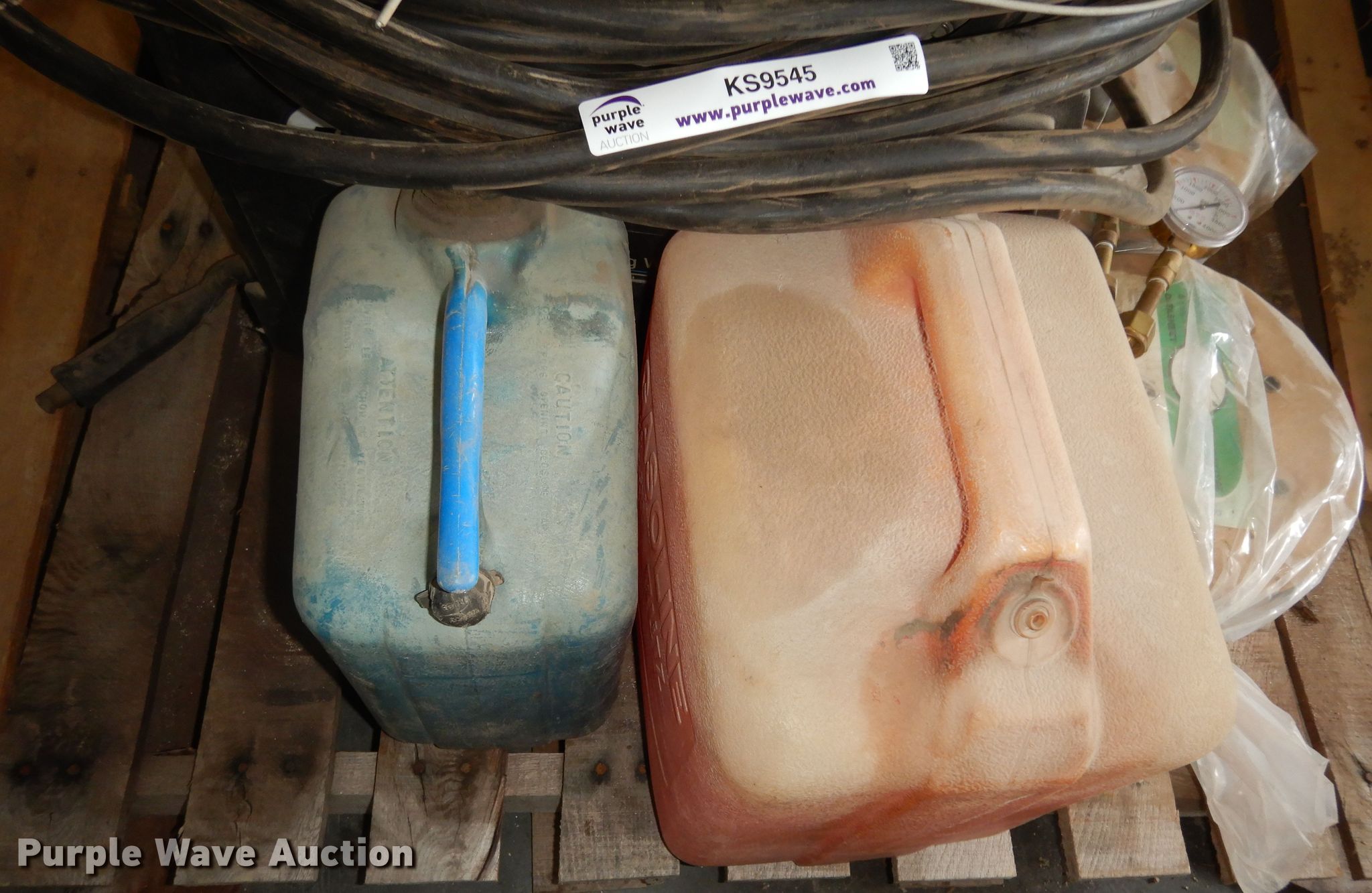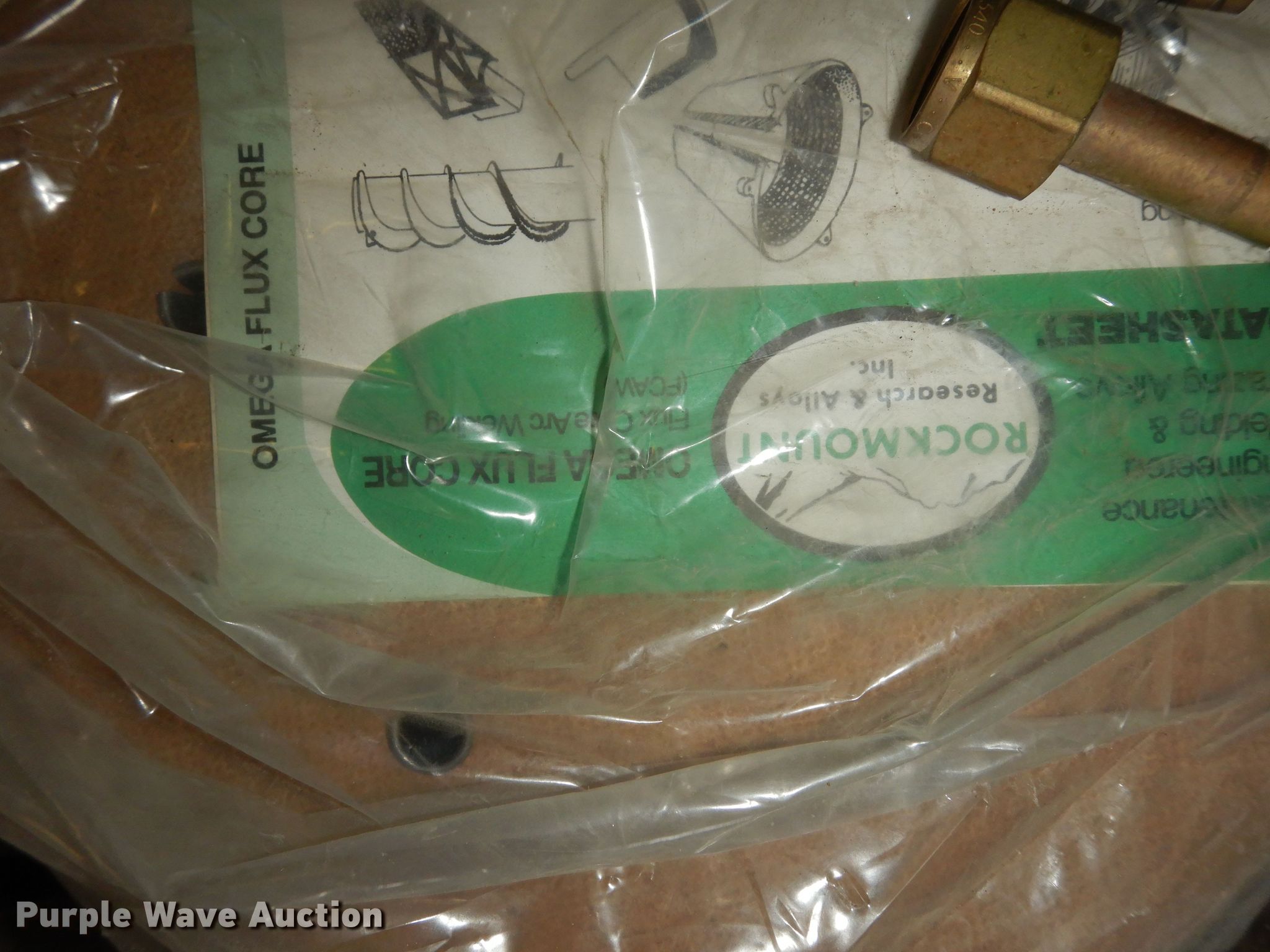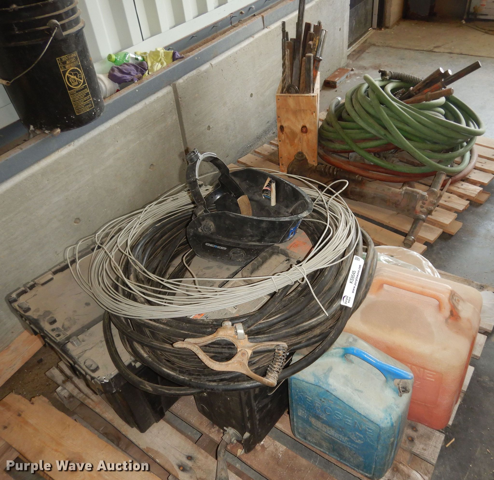 Purple Wave is selling a used Tools in Kansas. This item is a Tools with the following: Wire feed welder, Leads, Wire spools, Fuel cans, Helmet, Jackhammer, Air hose, Bits, Gauges and more