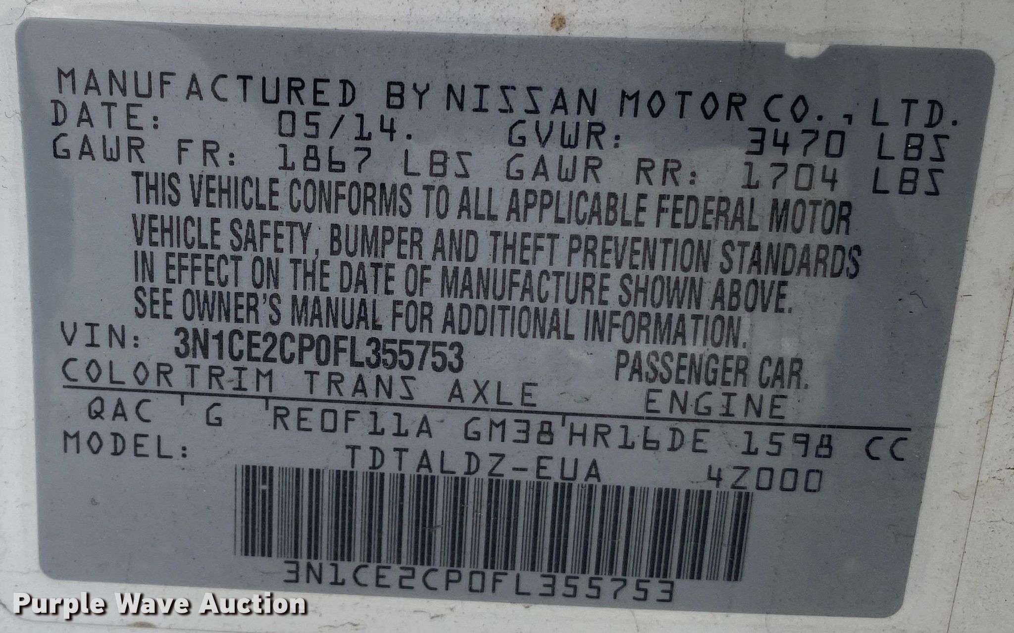 2014 Nissan Versa Note. Miles: 184,967 on odometer, VIN: 3N1CE2CP0FL355753. Engine Displacement: 1.6L L4 DOHC, Cylinders: 4, Fuel type: Gas. Transmission Automatic. Interior AC, Heat, Power windows, Power locks, Cruise control. Tires Size: 185/65R15. Notes Dash warning indicator: Check engine, Possible starter issues. Oklahoma title. Seller is a government entity who will be assigning and distributing the title. Please contact the seller for distribution questions. Title distribution may be delayed up to 30 days from verification of funds. City of Tulsa, OK. Tulsa, OK 74107