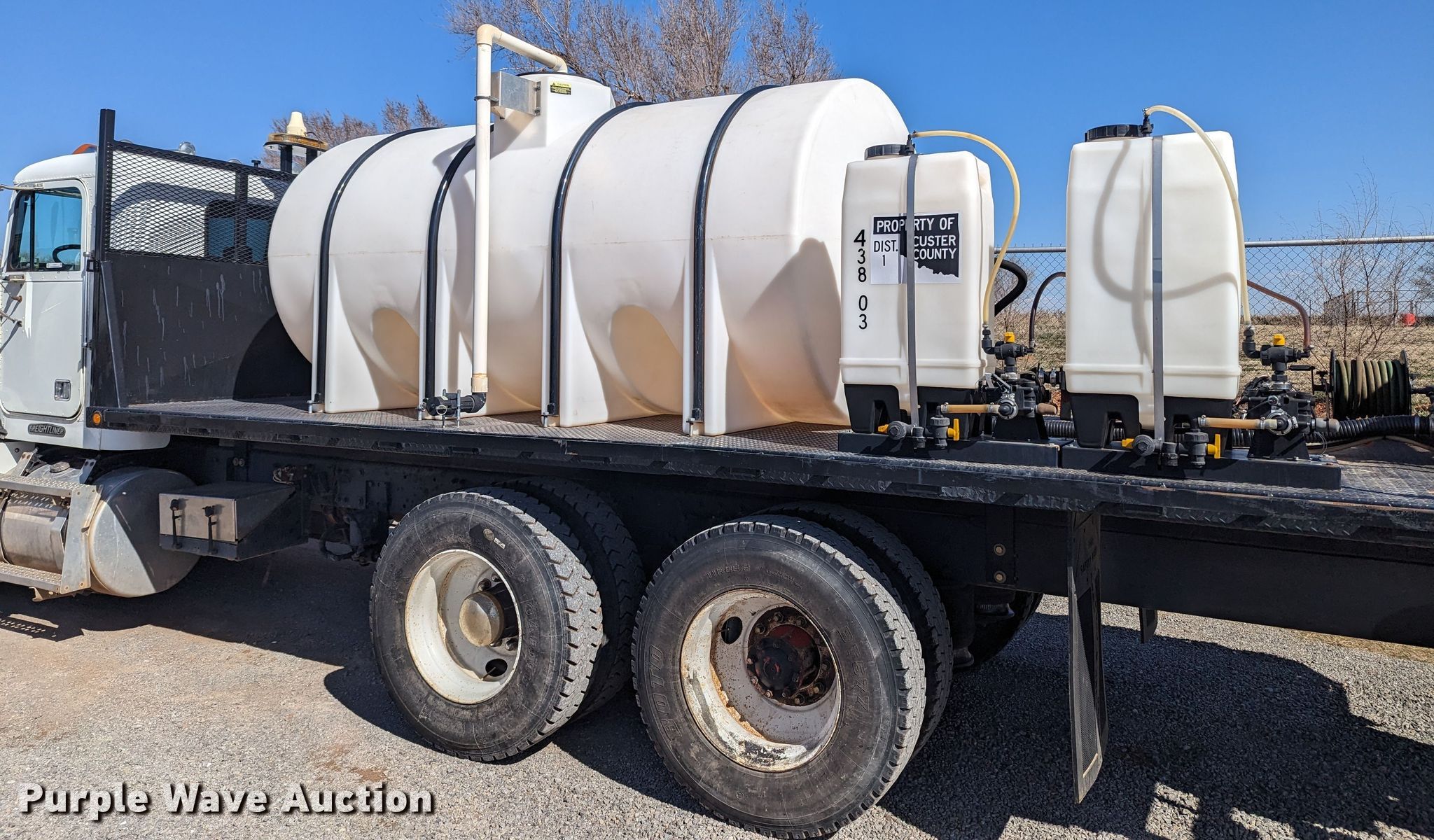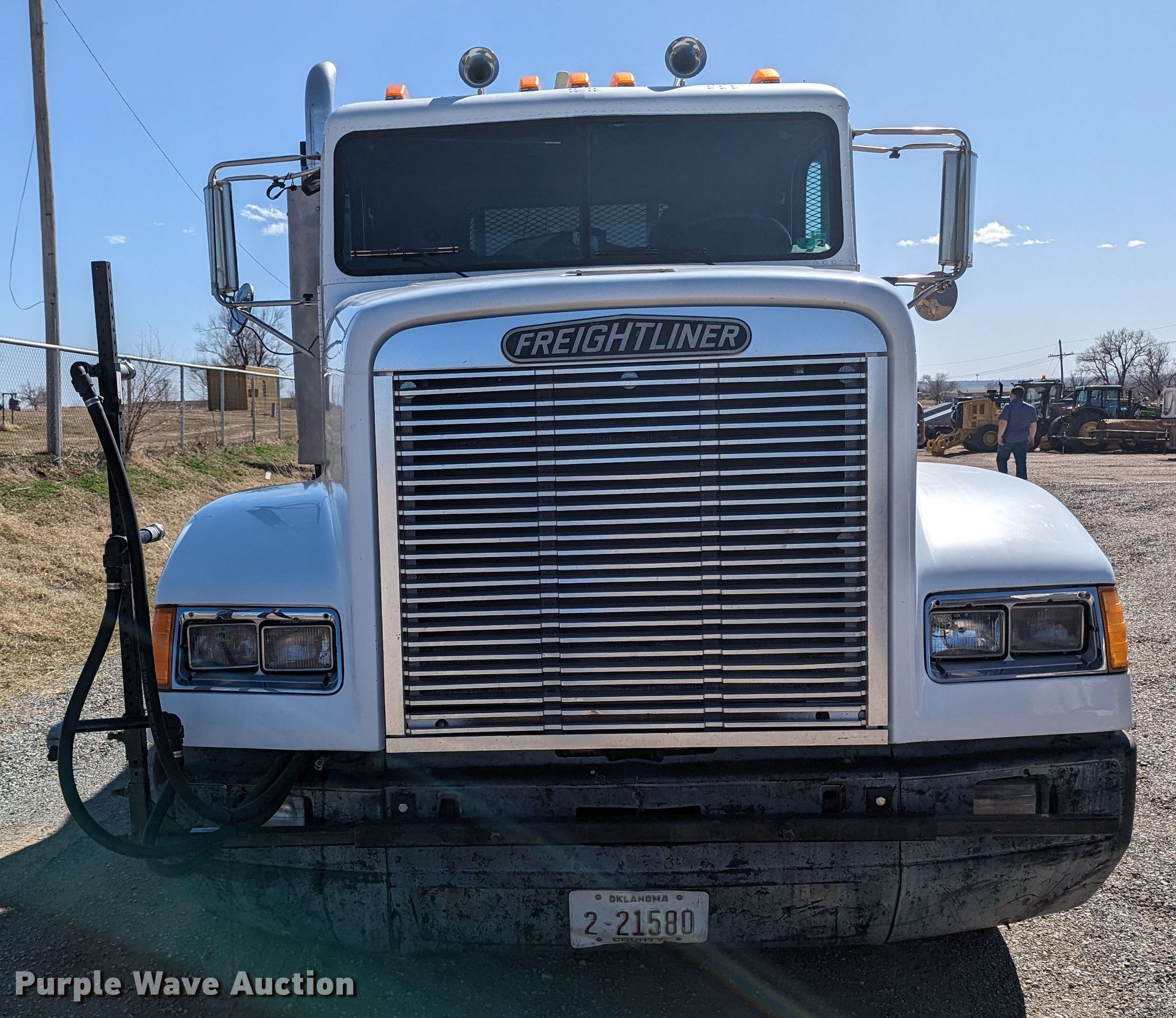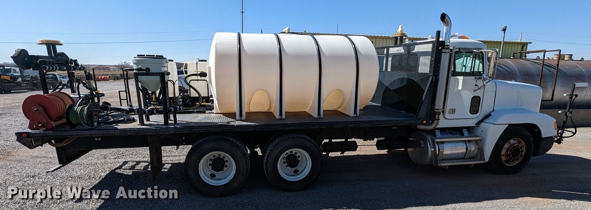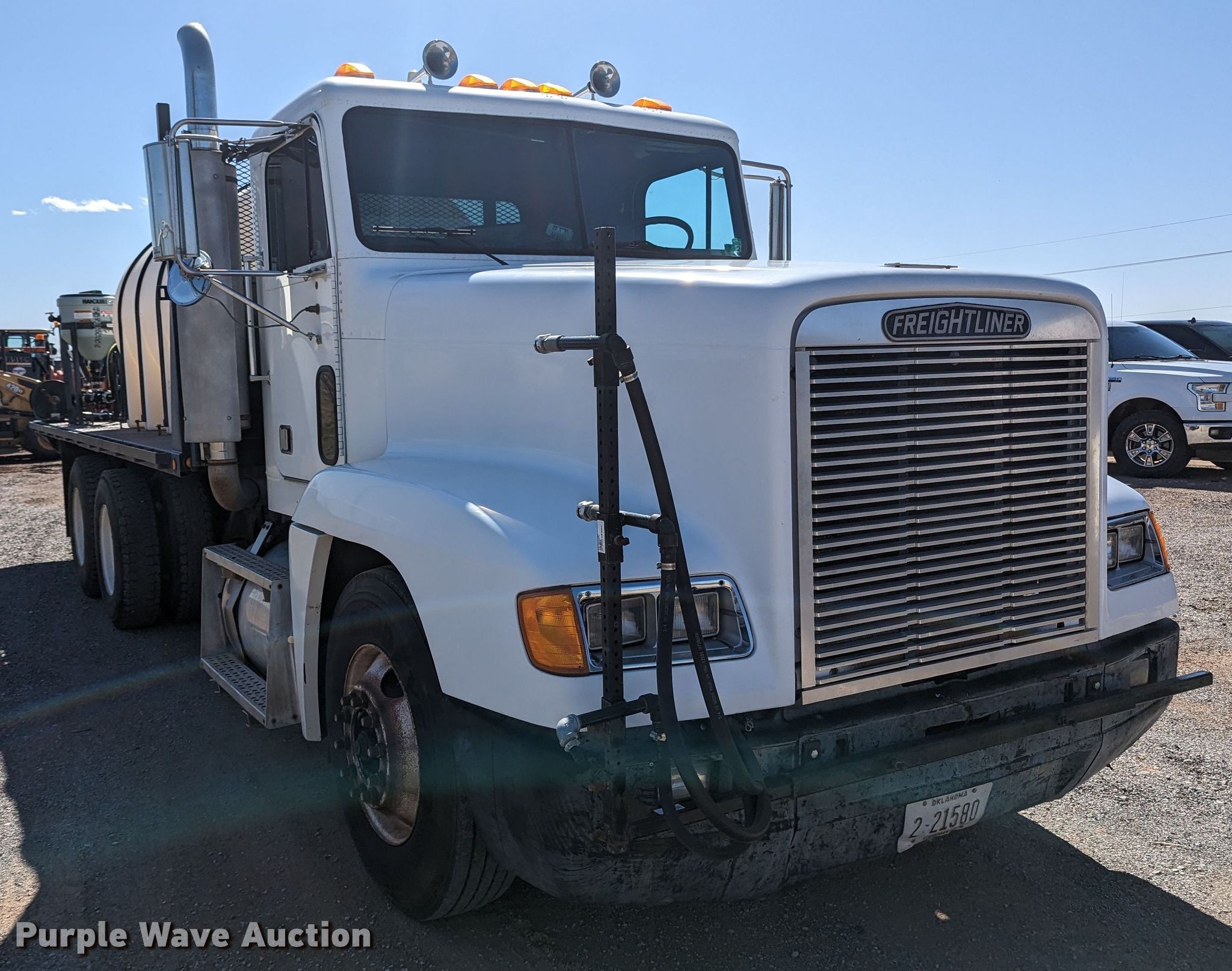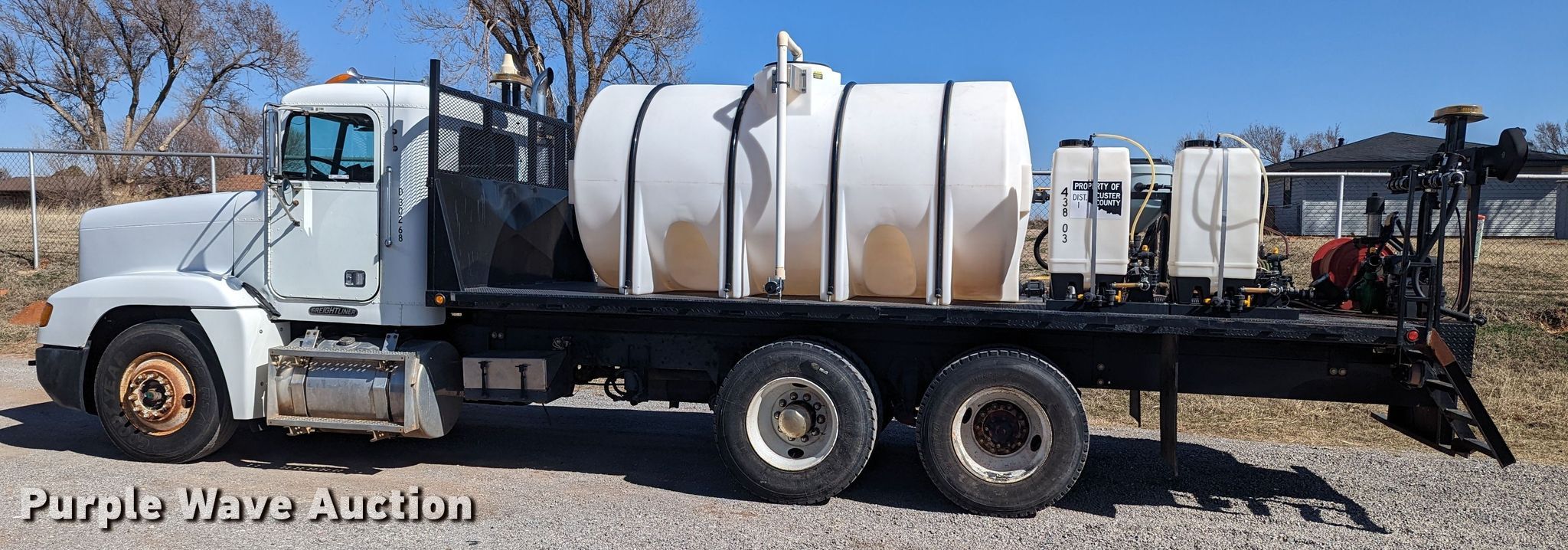 1994 Freightliner flatbed truck. Miles: 281,345 on odometer, VIN: 1FUYDCXBXRP433693. Engine Detroit Diesel Series 60, Displacement: 11.1L, Cylinders: 6, Fuel type: Diesel. Transmission Manual. Chassis Axles: Tandem, Suspension: Air, Brakes: Air. Interior AC, Heat, Heated mirrors, Cruise control. Features Flatbed 21' L x 102" W, Raven spray system, Poly tank Capacity: 1,600 gallons, (2) chemical tanks Approx. 40 gallon capacity, Dry chemical tank, Hose reel, Single cylinder gas engine. Oklahoma title. Custer County - District 1. 9960 US-183. Arapaho, OK 73620