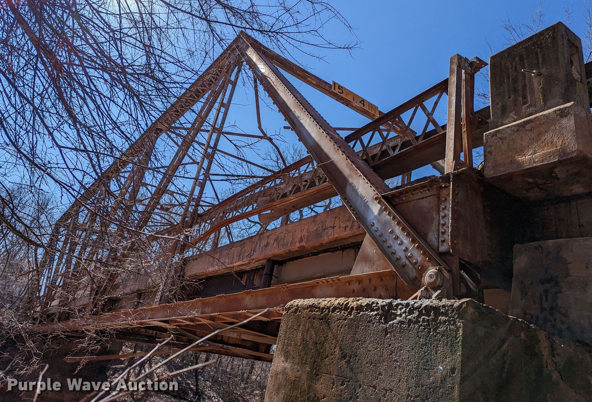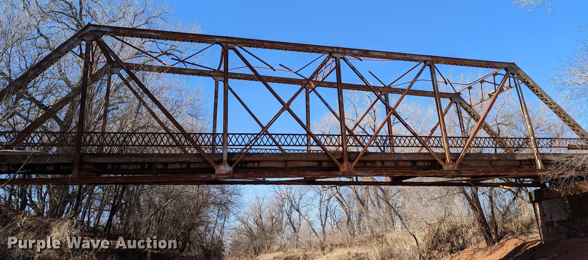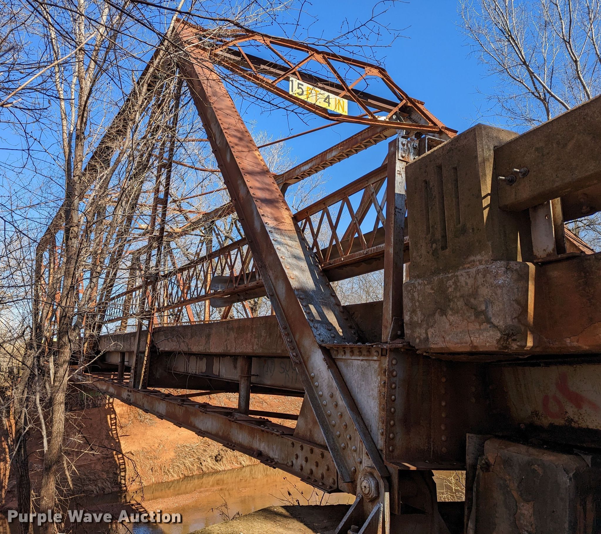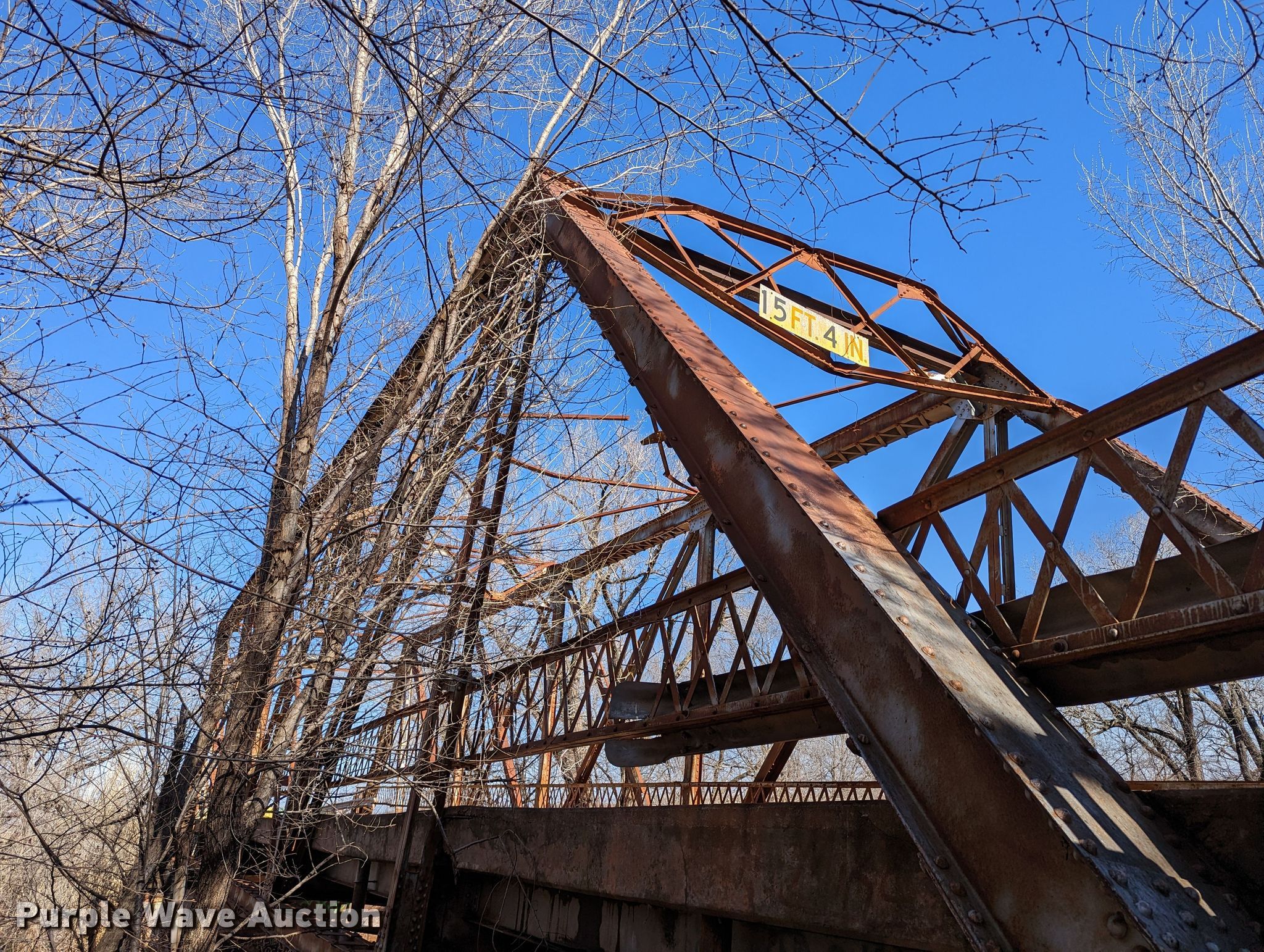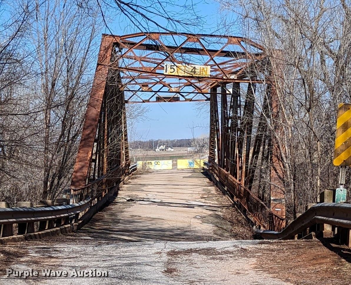 Purple Wave is selling a used Building Materials in Oklahoma. This item is a 1927 JB Klein Iron & Foundry Co bridge with the following: Overall dimensions: 120' L x 20' 8" W, Interior width: 17', Height clearance: 15'4", Approach: 30', Truss width: 16", I-beam dimensions:, 12" H x 6.25" W, 15" H x 5.50" W, 24" H x 9" W