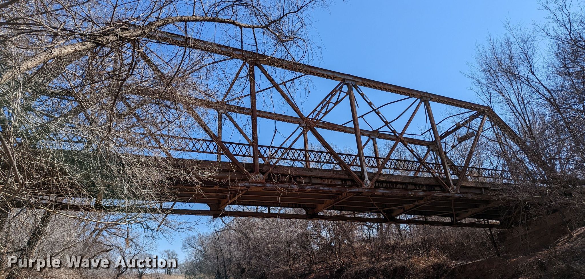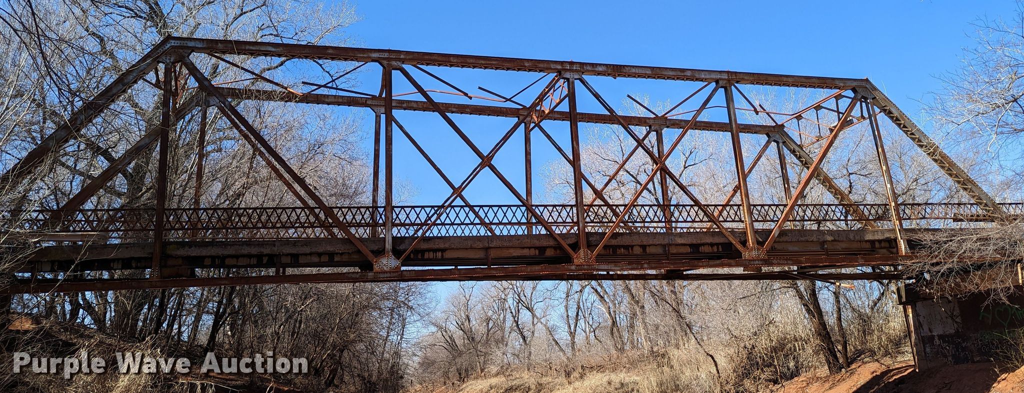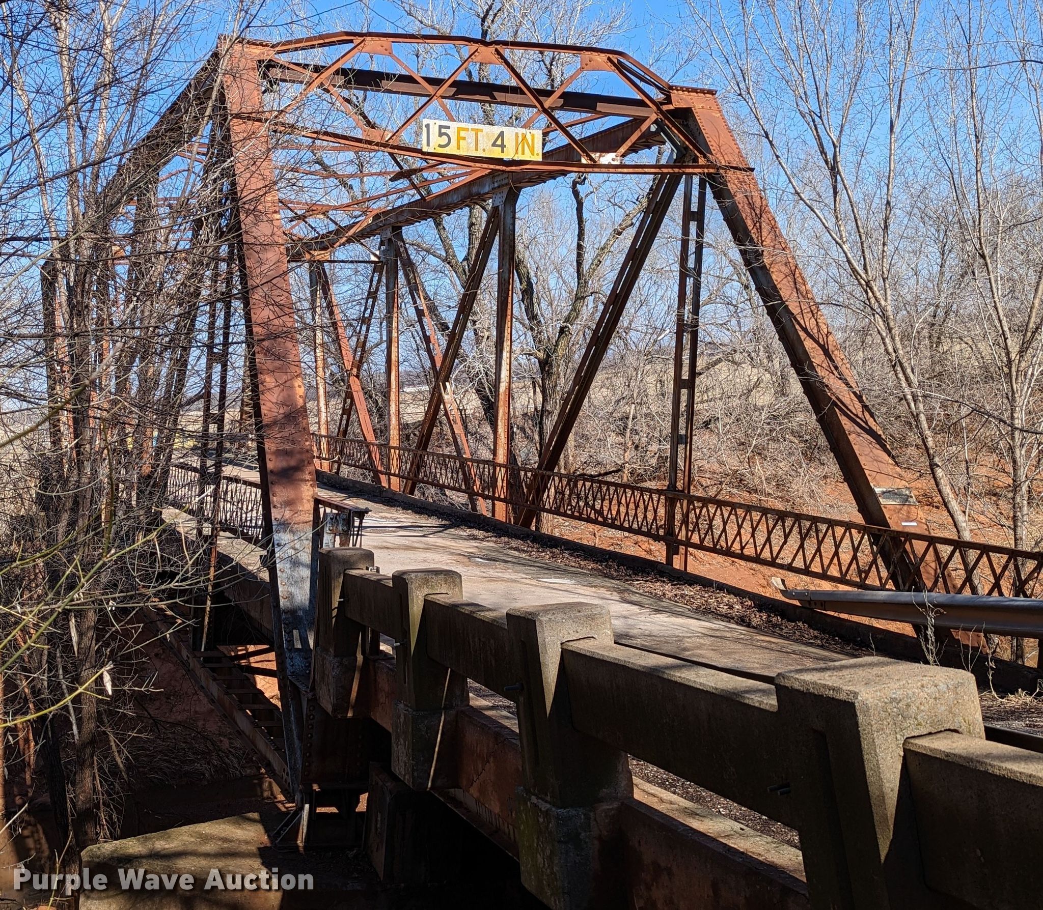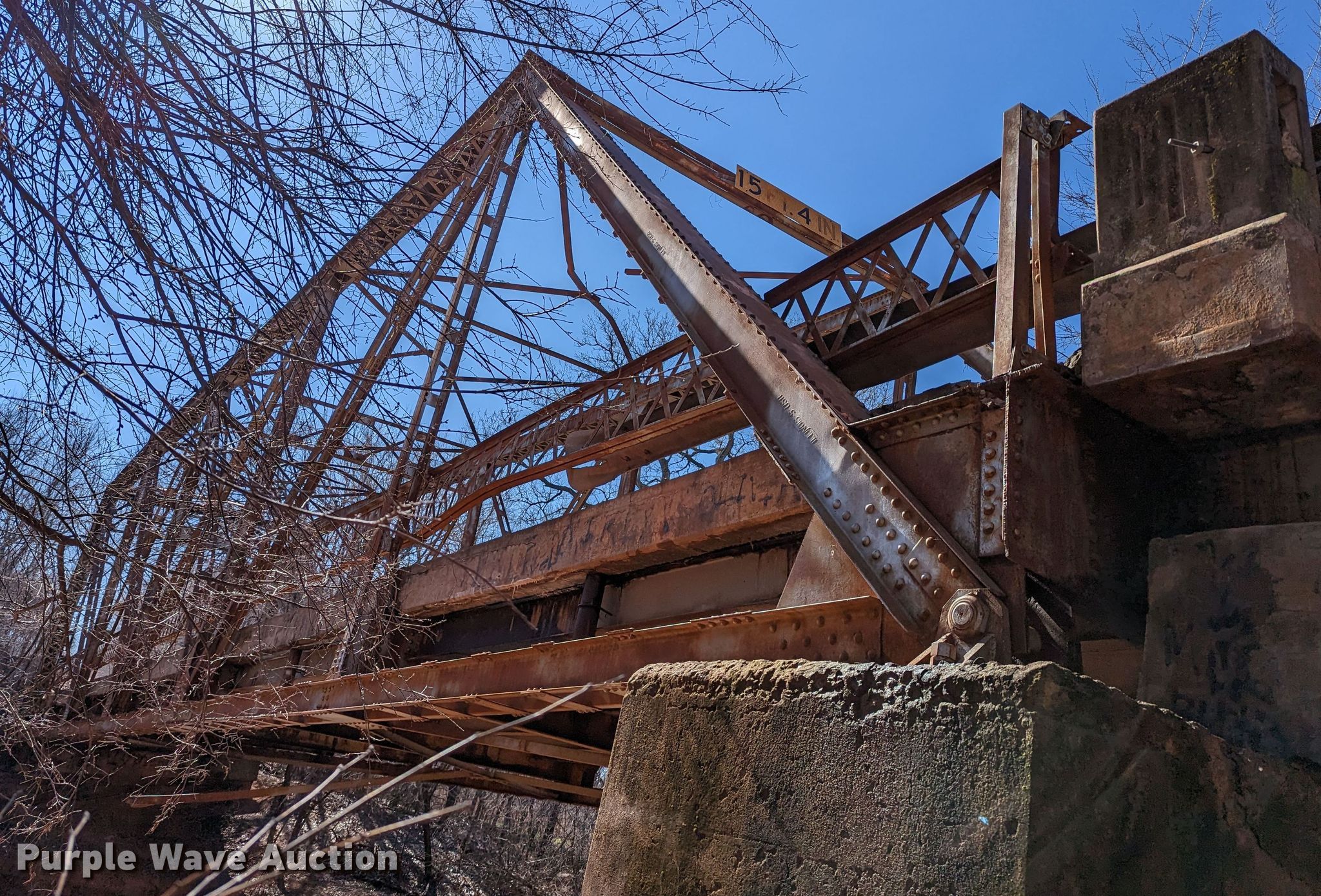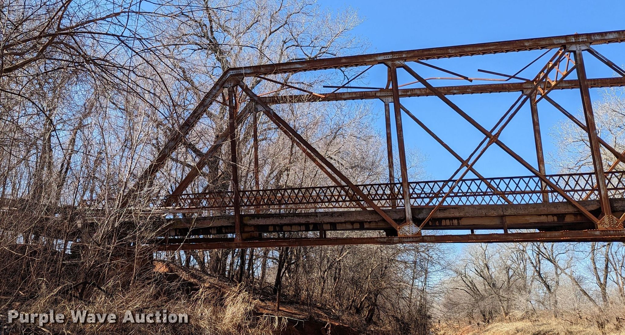 Purple Wave is selling a used Building Materials in Oklahoma. This item is a 1927 JB Klein Iron & Foundry Co bridge with the following: Overall dimensions: 120' L x 20' 8" W, Interior width: 17', Height clearance: 15'4", Approach: 30', Truss width: 16", I-beam dimensions:, 12" H x 6.25" W, 15" H x 5.50" W, 24" H x 9" W