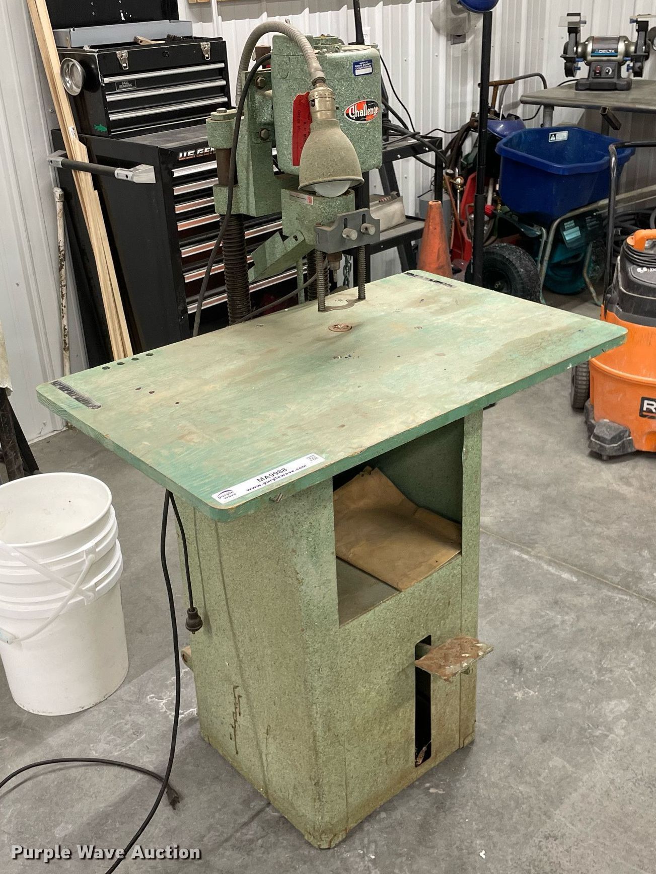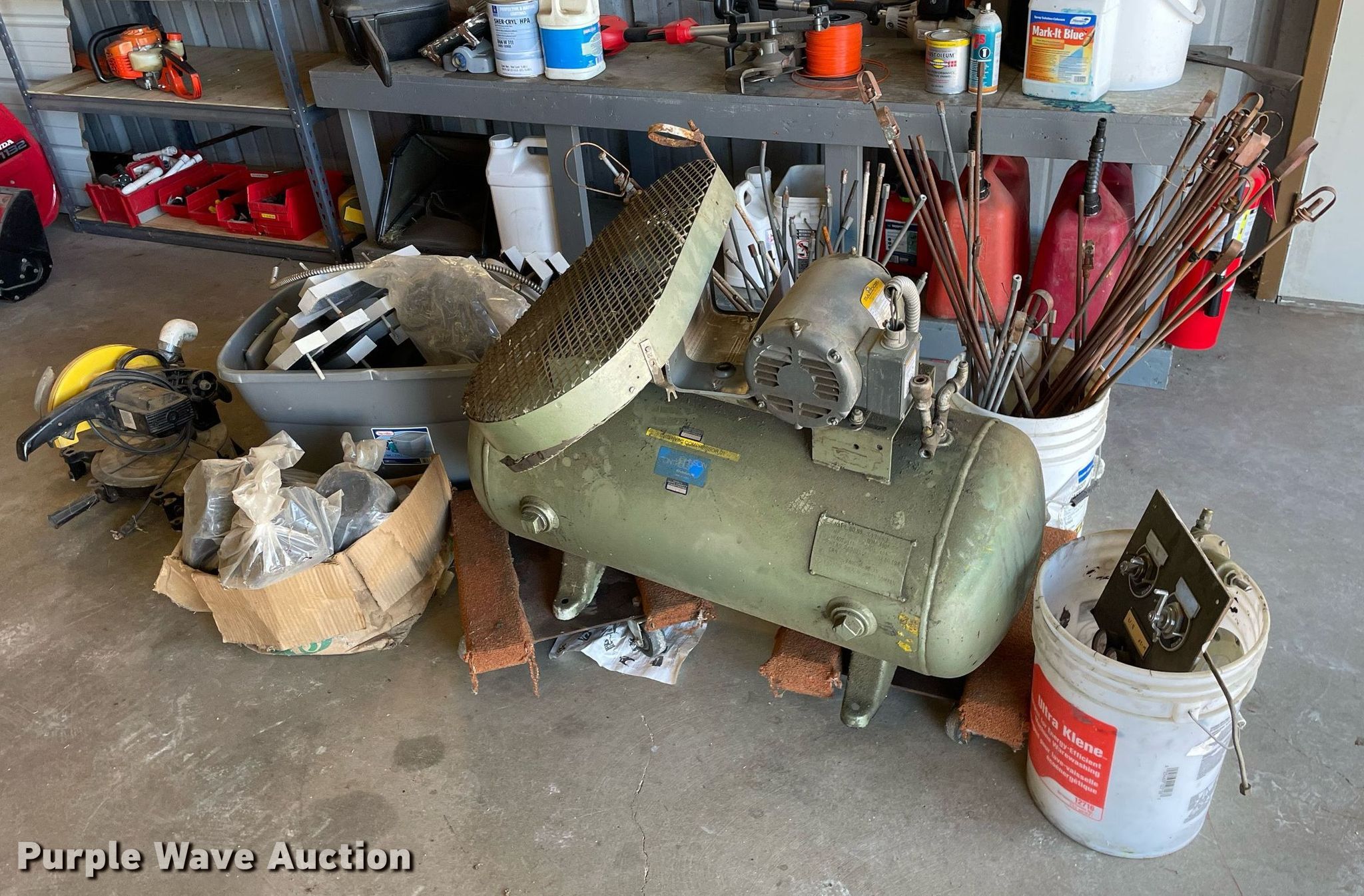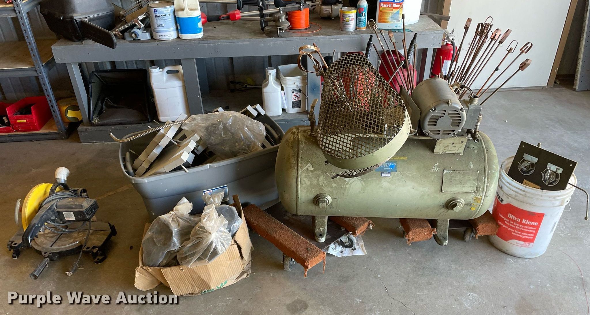 Purple Wave is selling a used Tools in Kansas. This item is a Tools with the following: Challenge paper drilling machine, Air compressor tank, Chop saw, Scrap steel, Steel storage shelf and more
